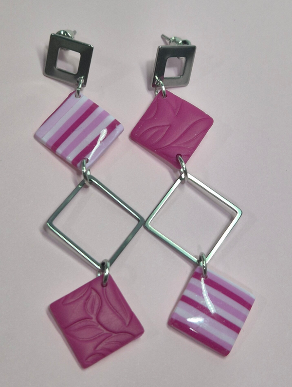 Pendientes de arcilla polimérica con combinado de estampado de rayas en 3 tonos rosas y blanco y relieve en fucsia.