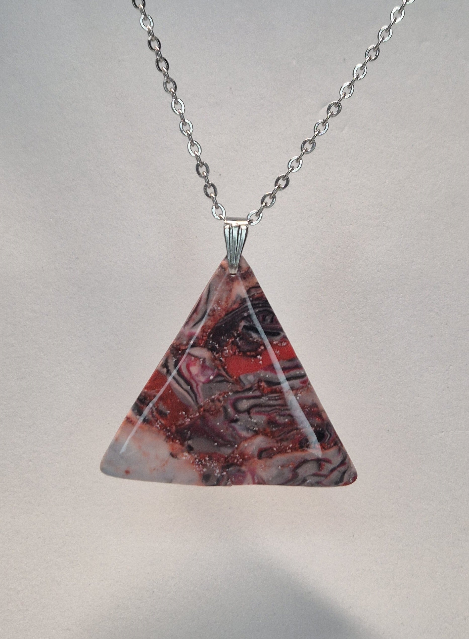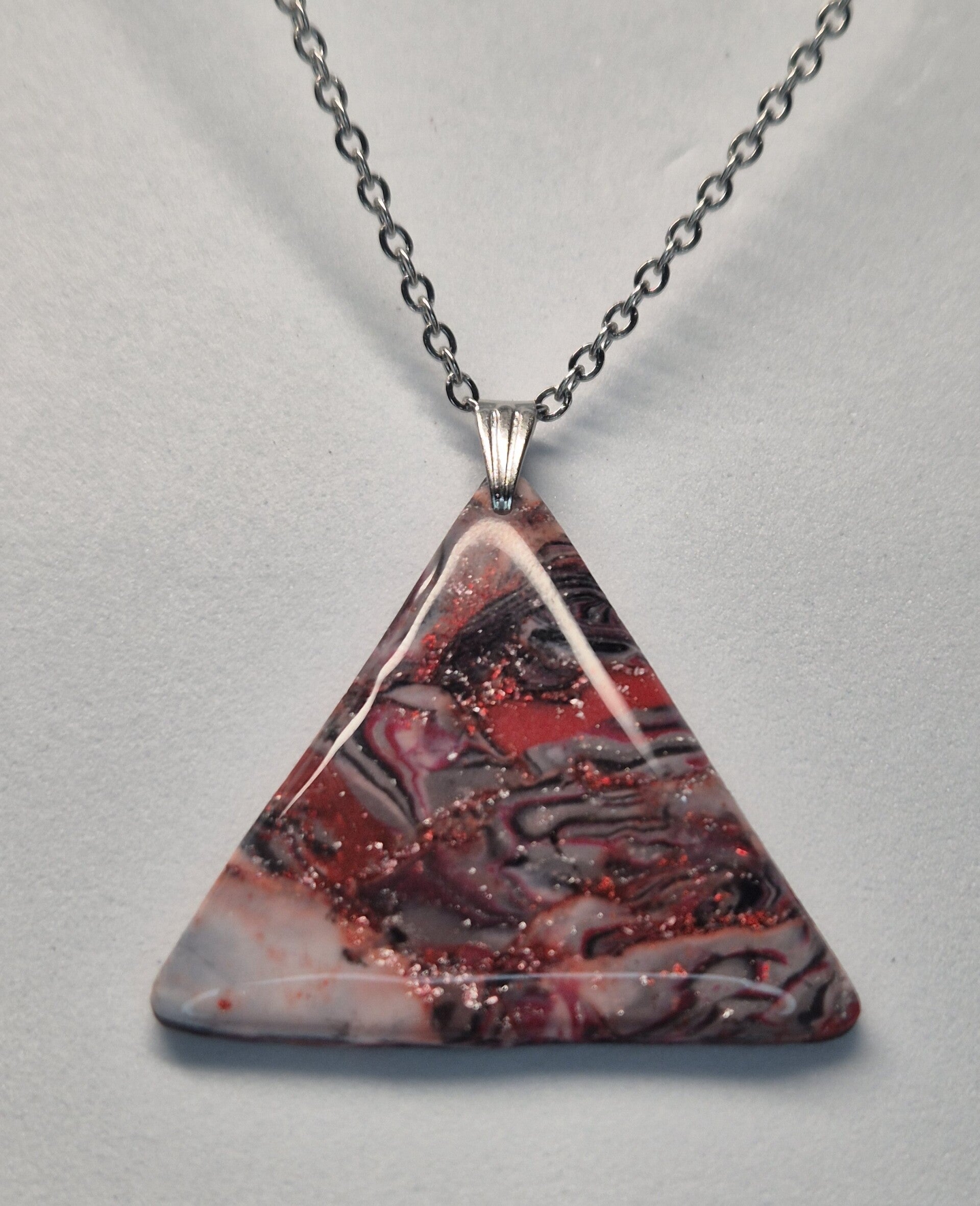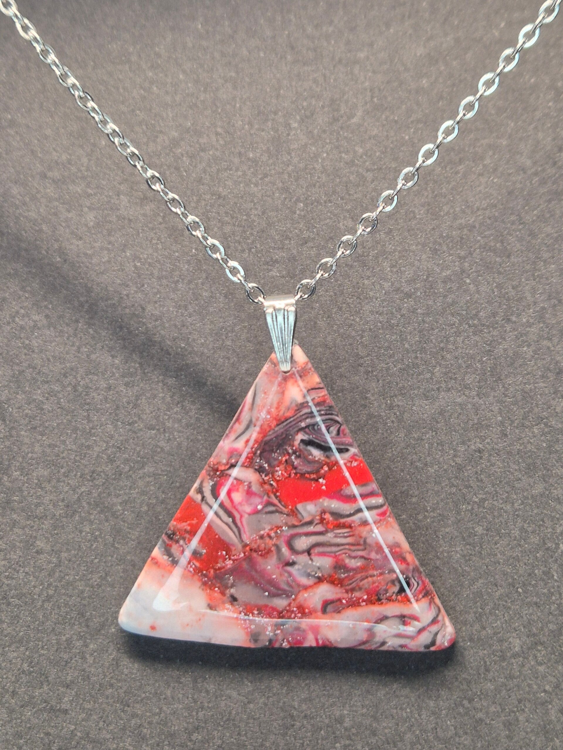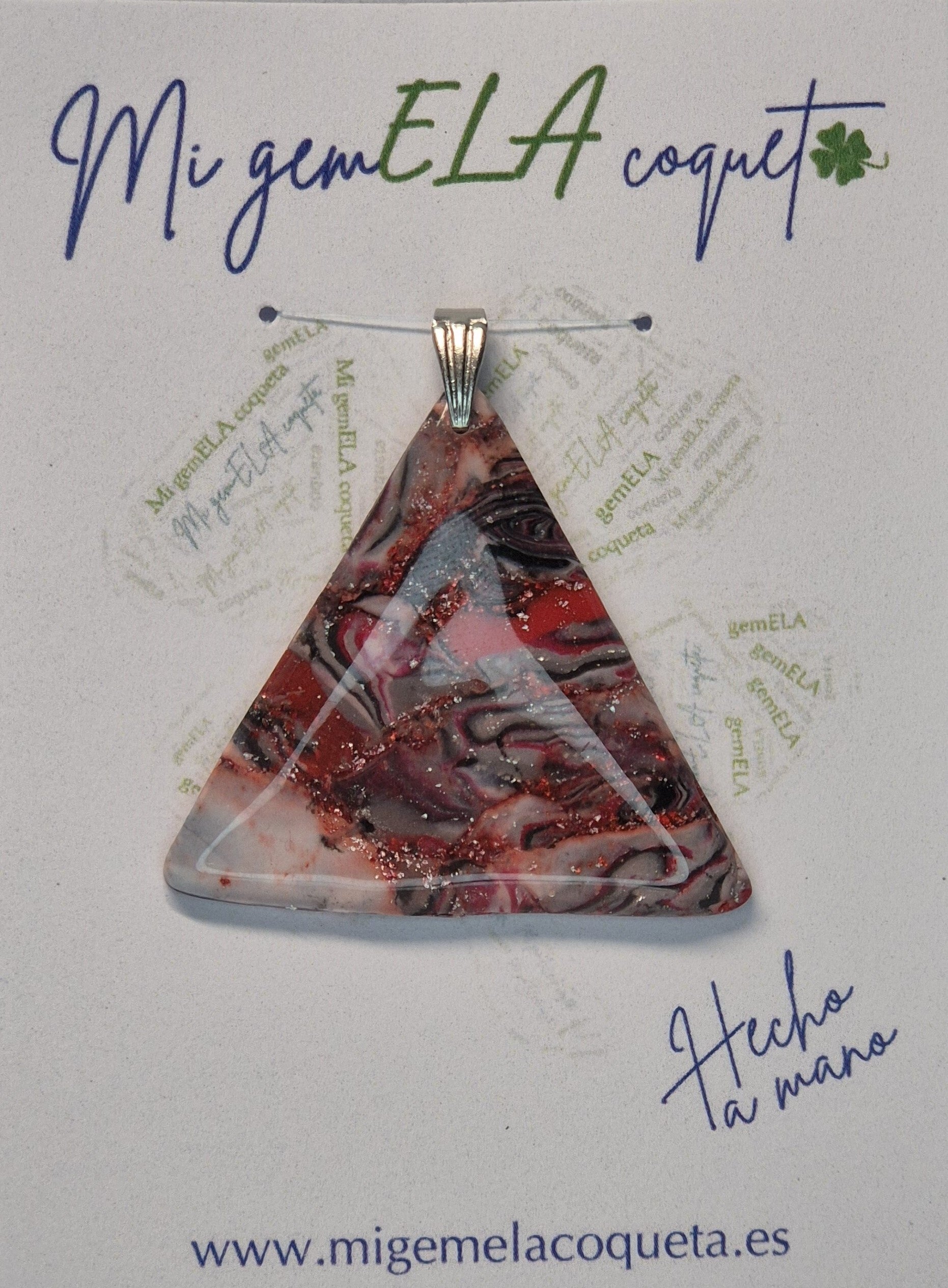 Colgante artesanal hecho con arcilla polimérica en color rojo, negro y blanco con un toque de plata; ligero, perfecto para cualquier ocasión.
