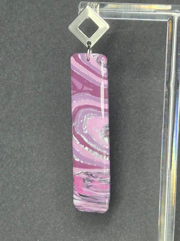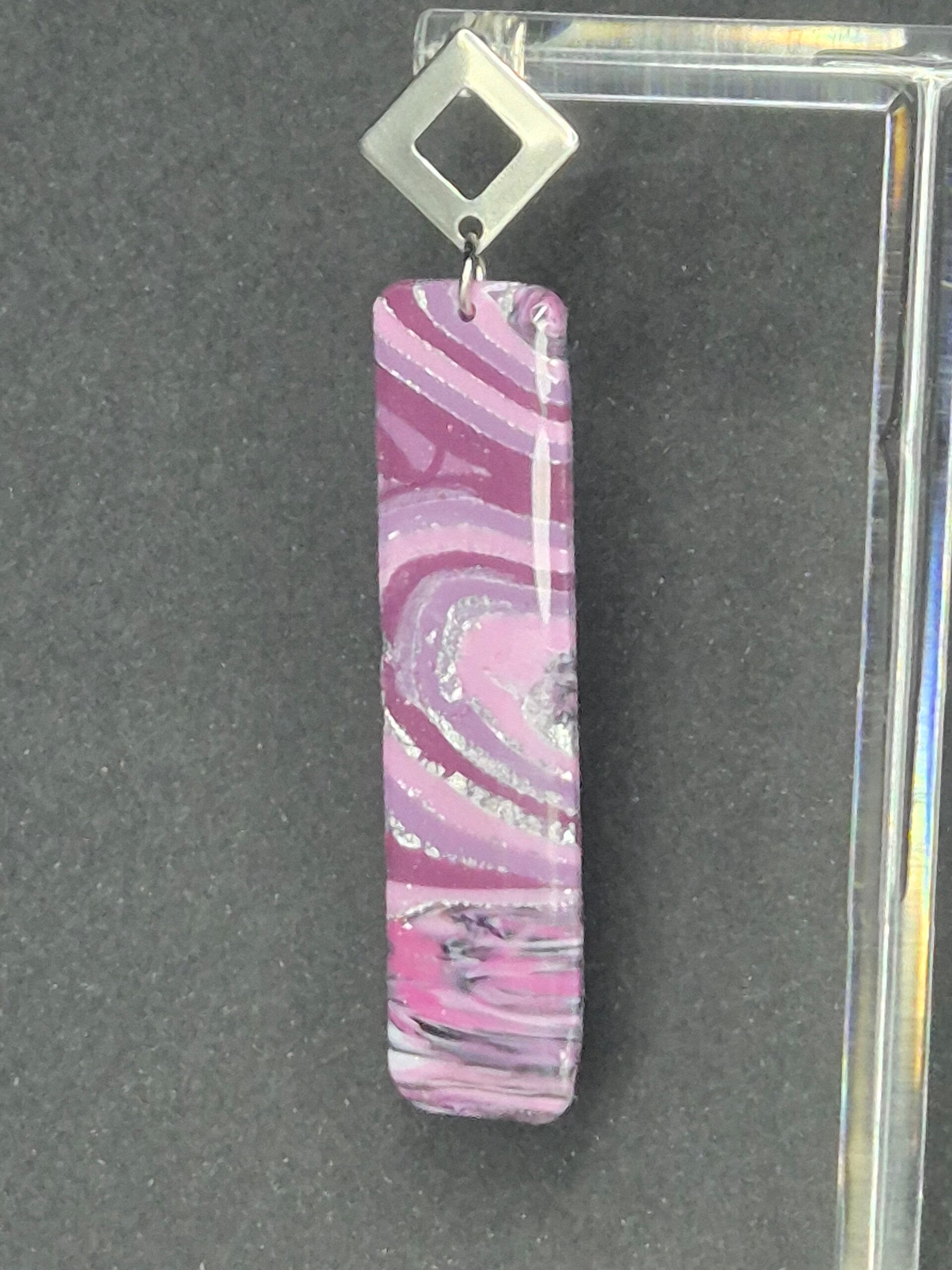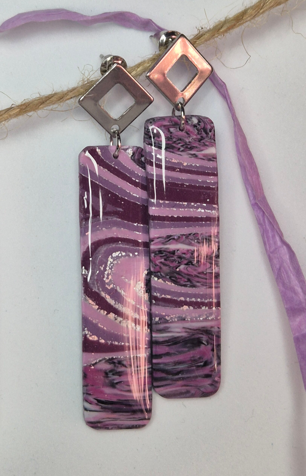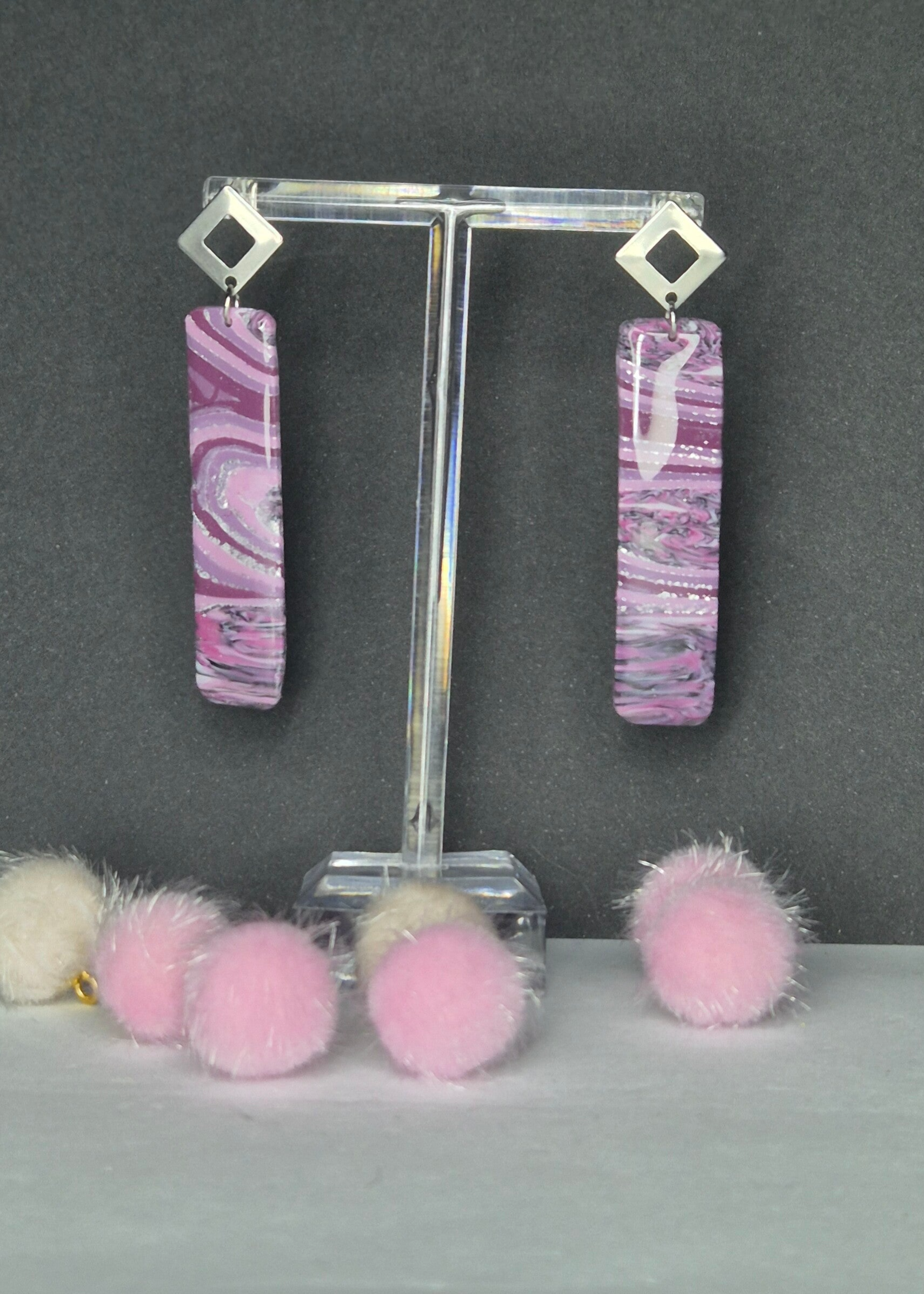 Pendientes realizados con arcilla polimérica en colores desde orquídea a rosa palo con un brillo de plata.