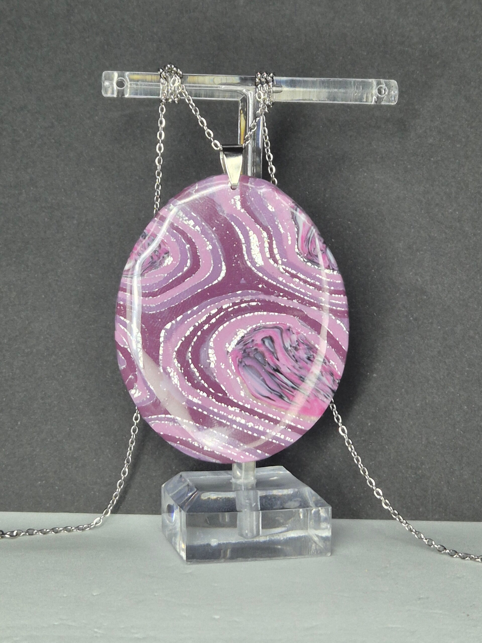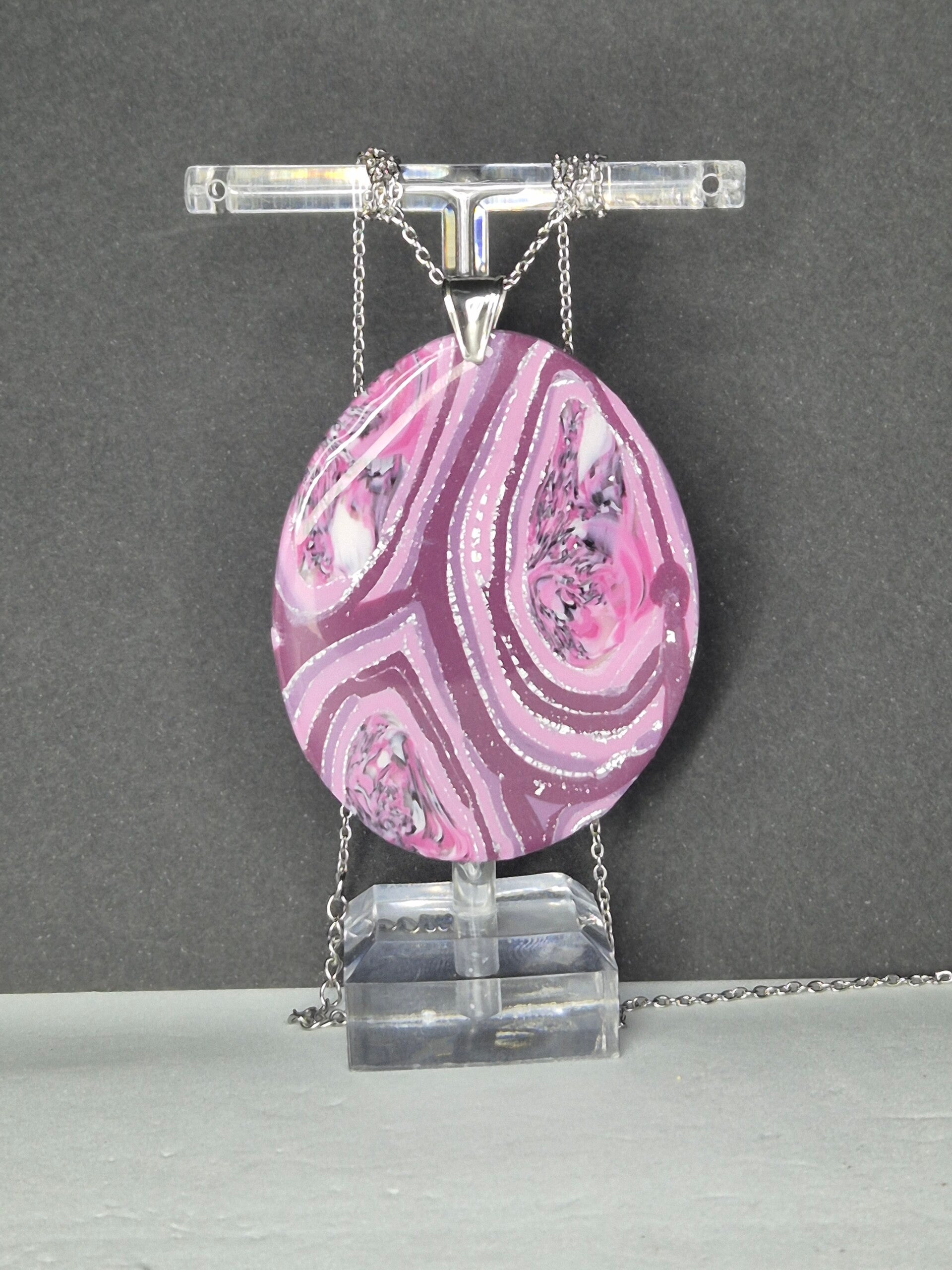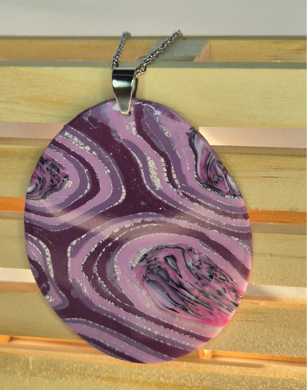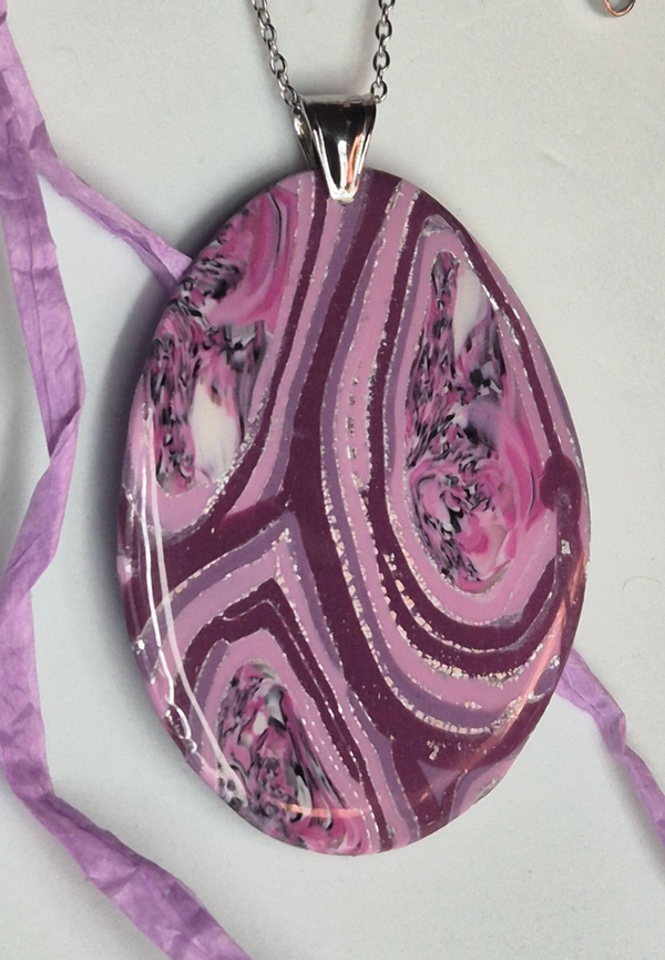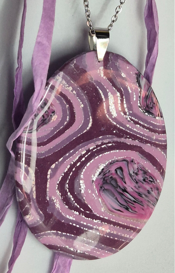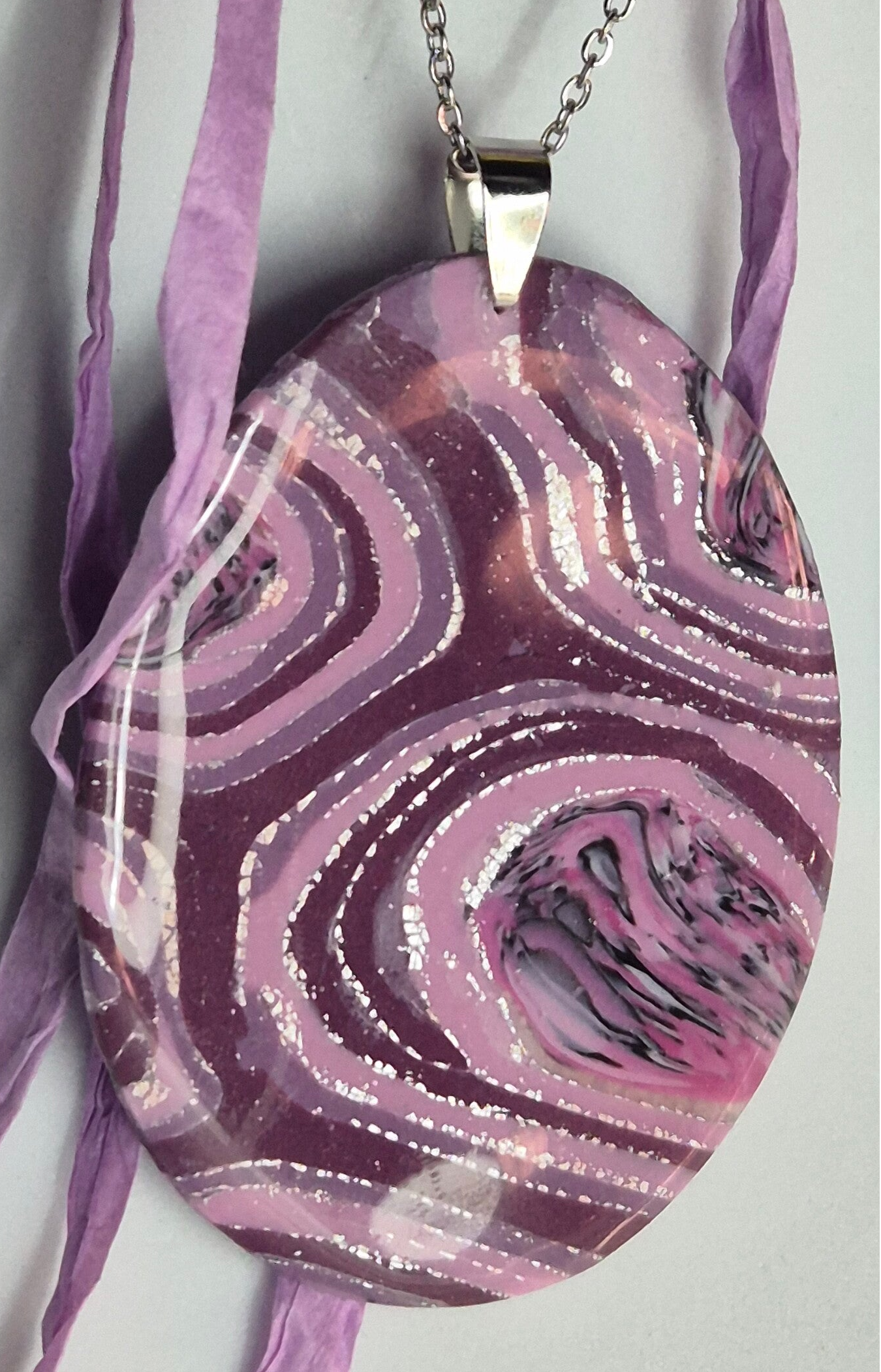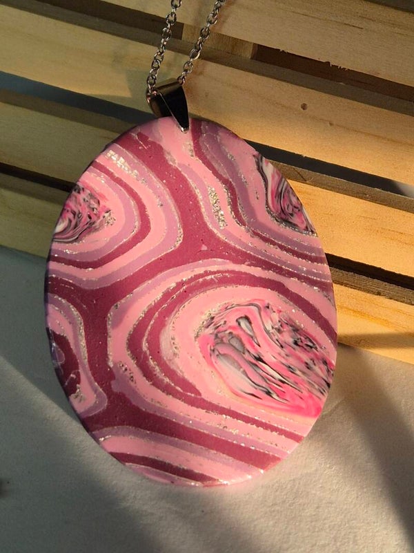 Colgante realizado con arcilla polimérica en colores desde orquídea a rosa palo con un brillo de plata.