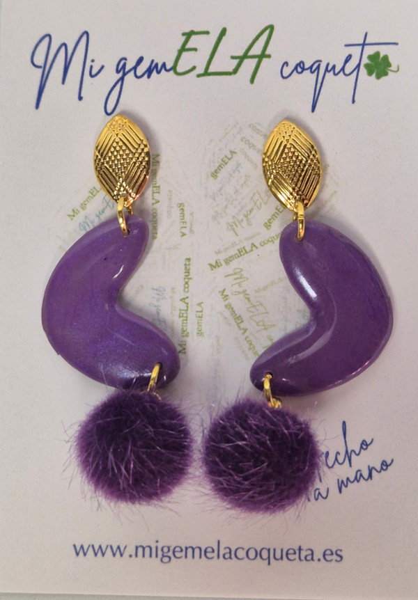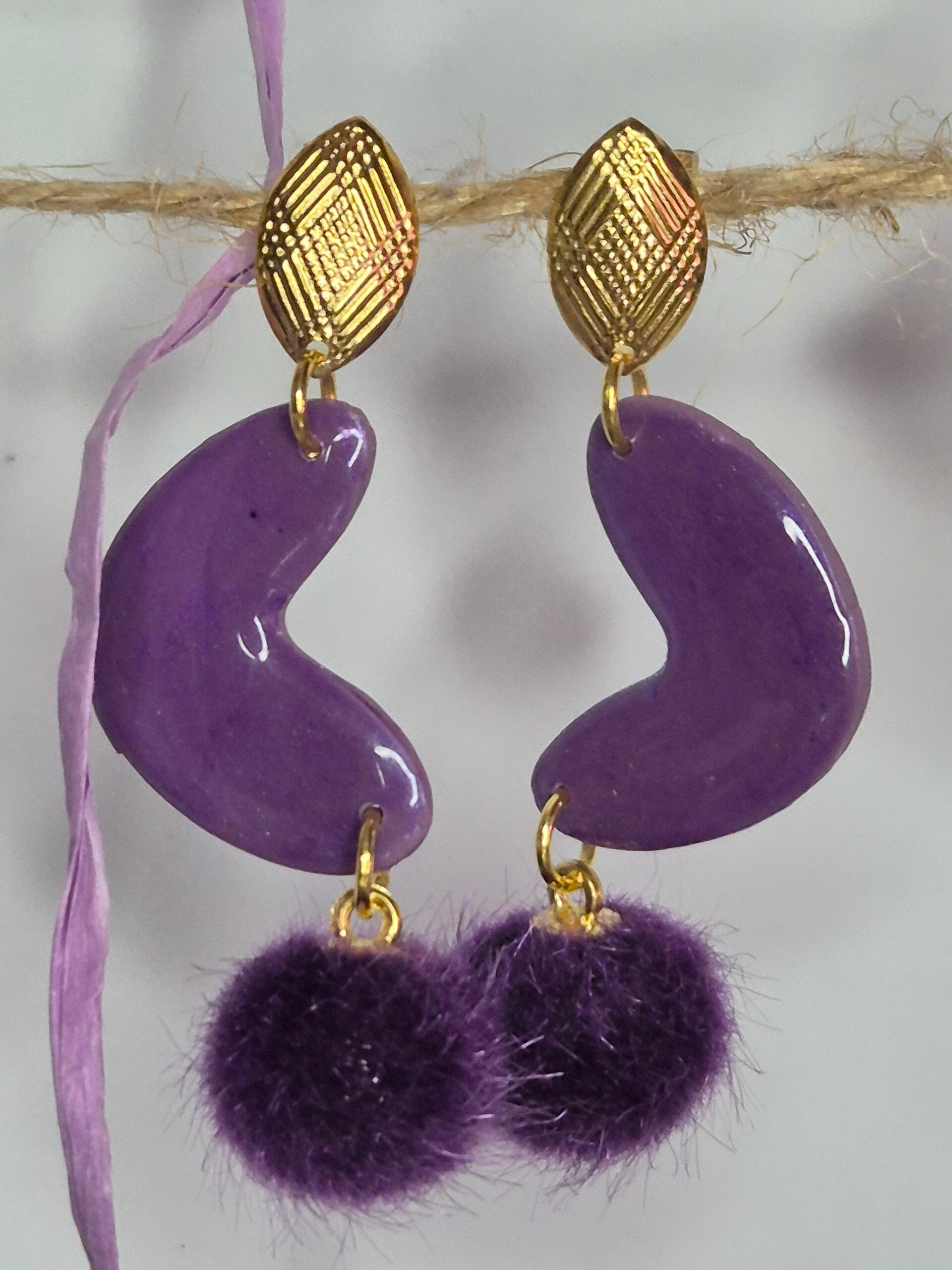 Pendientes realizados con arcilla polimérica en color malva y morado con brillo morado.