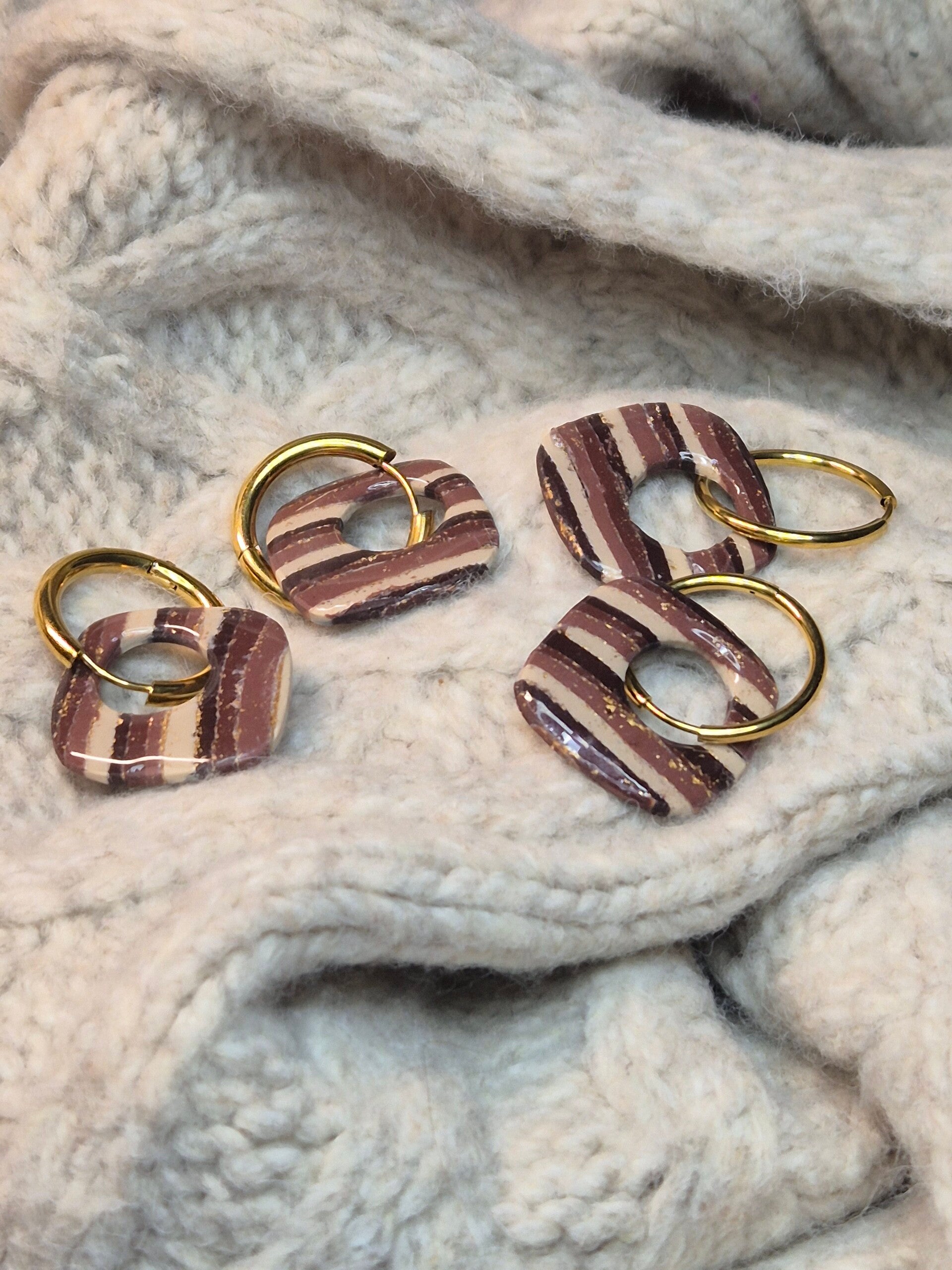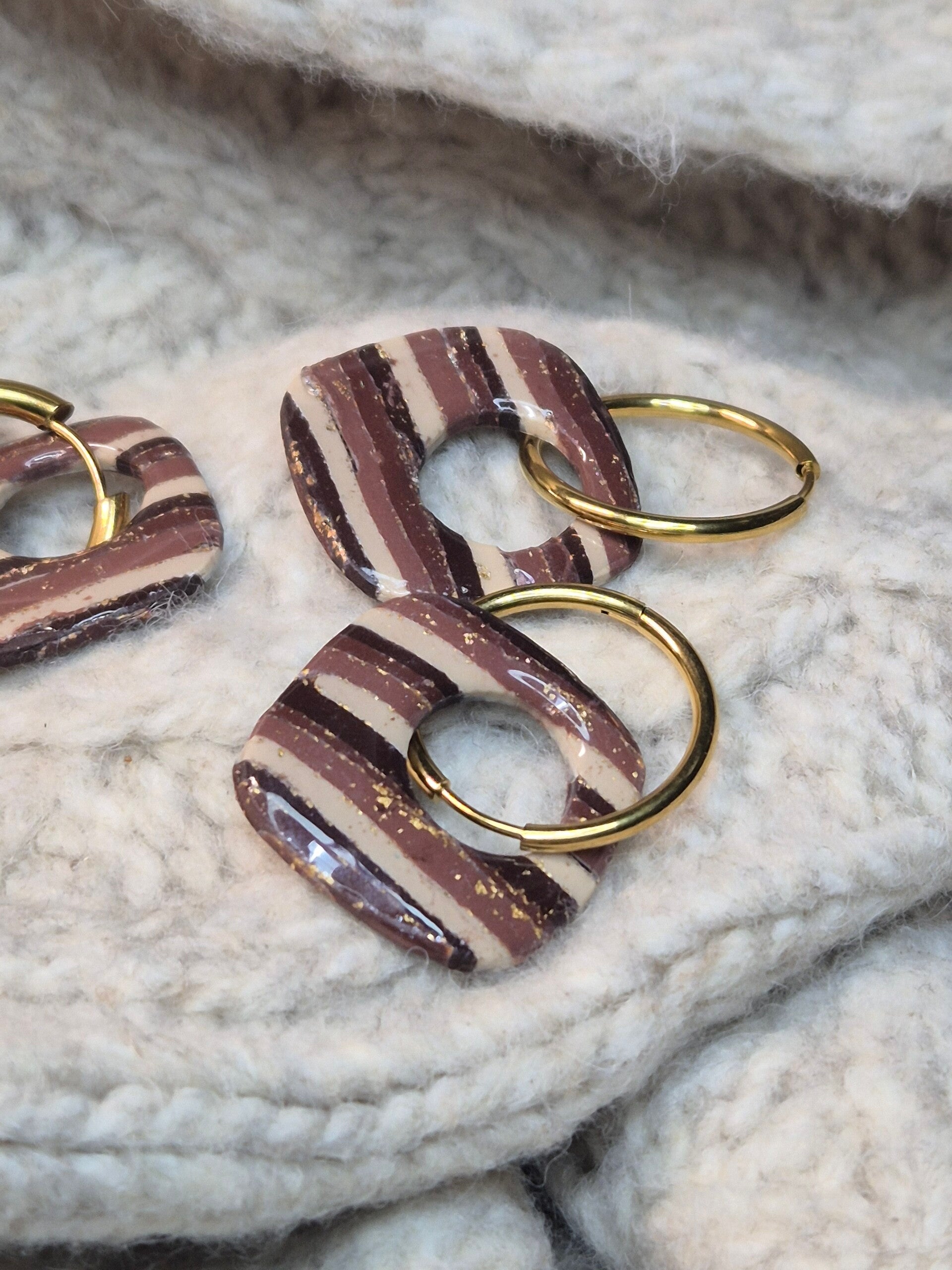 Pendientes de arcilla polimérica en tonos beis a marrón con brillos de oro.