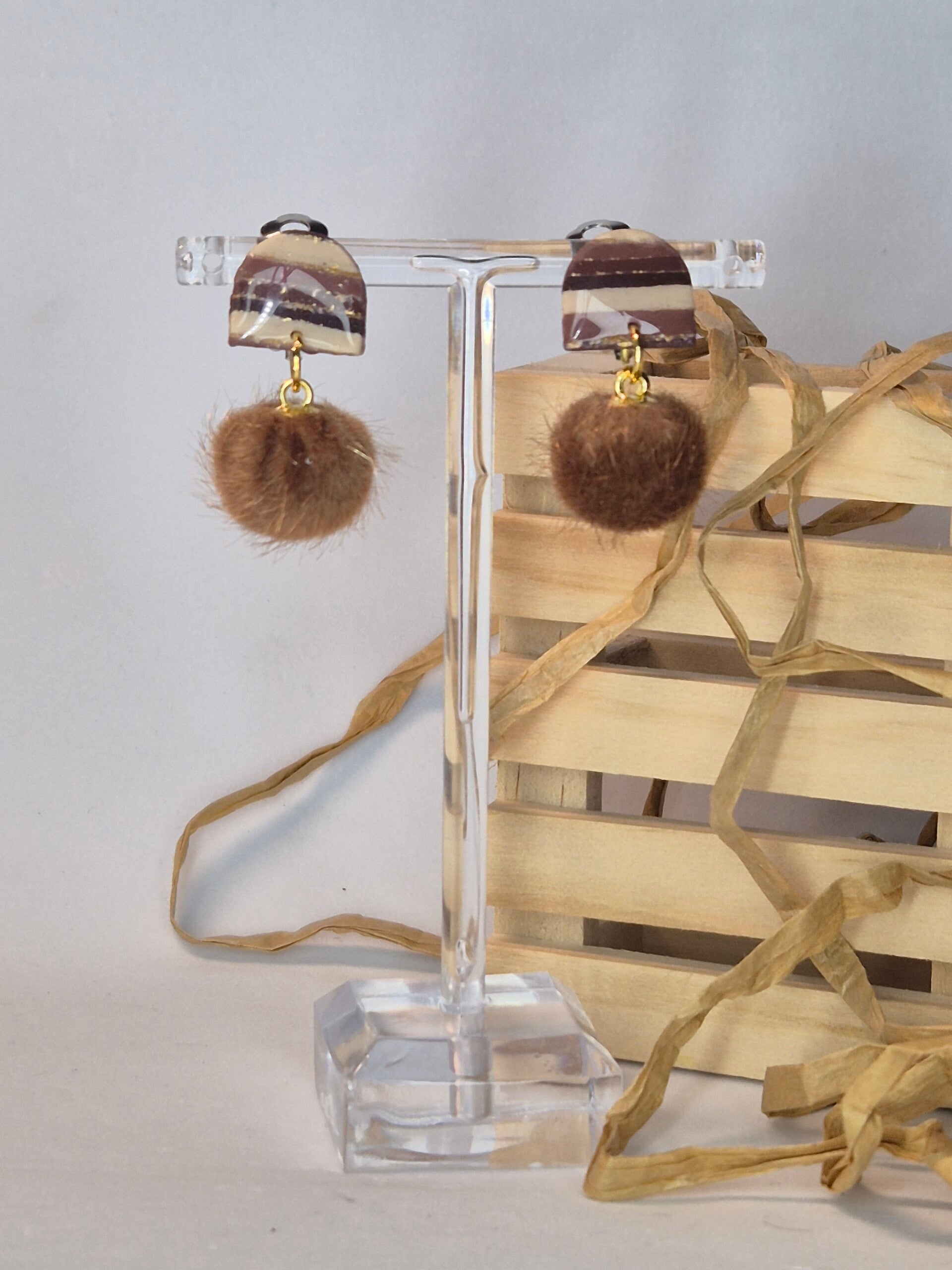 Pendientes de arcilla polimérica en tonos beis a marrón con brillos de oro.