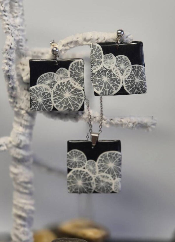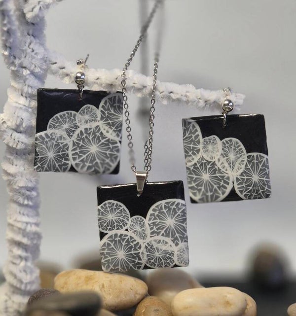 Conjunto de pendientes y colgante de la colección DANDELION, hechos de forma artesana con arcilla polimérica, con fondo negro y con el sencillo y efímero diente de león en blanco como protagonista.