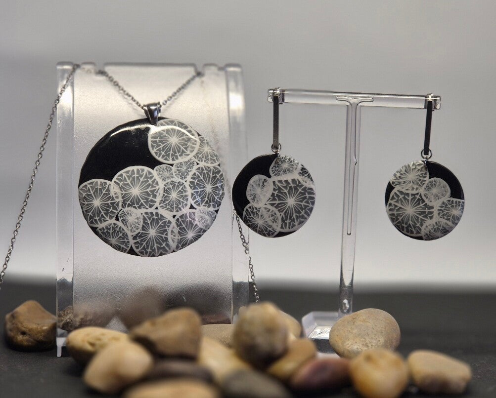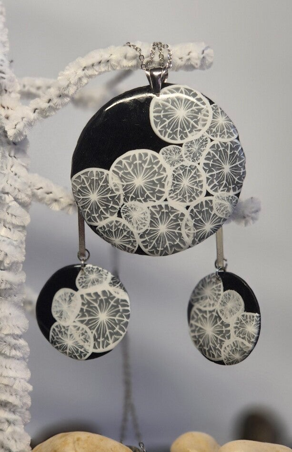 Conjunto de pendientes y colgante de la colección DANDELION, hechos de forma artesana con arcilla polimérica, con fondo negro y con el sencillo y efímero diente de león en blanco como protagonista.