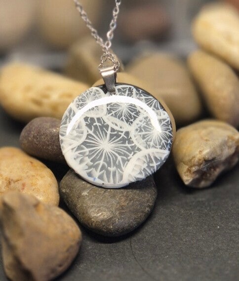 Colgante de la colección DANDELION, hecho de forma artesana con arcilla polimérica, con fondo negro y con el sencillo y efímero diente de león en blanco como protagonista.