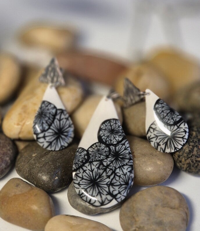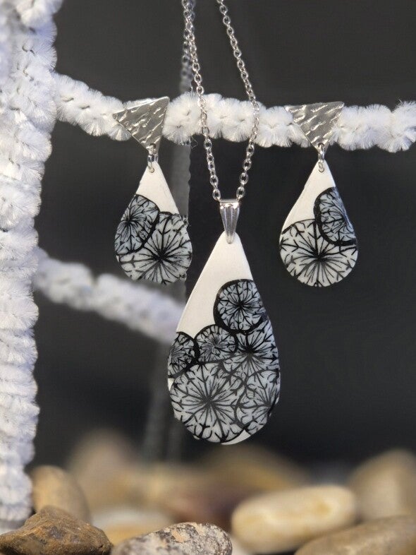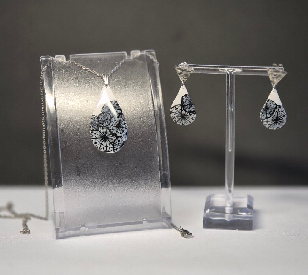 Conjunto de pendientes y colgante de la colección DANDELION, hechos de forma artesana con arcilla polimérica, con fondo blanco y con el sencillo y efímero diente de león en negro como protagonista.
