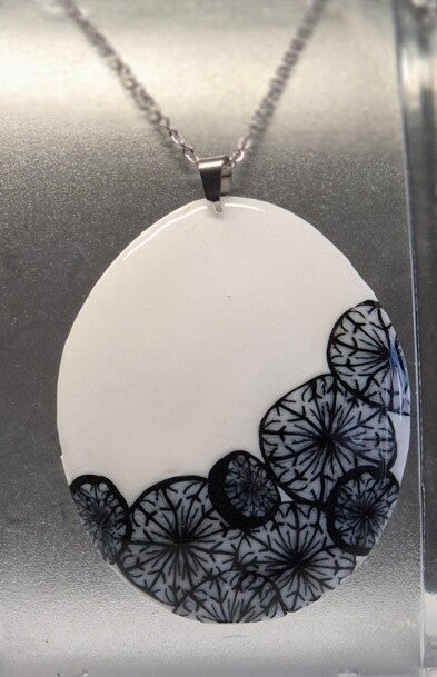 Colgante de la colección DANDELION, hecho de forma artesana con arcilla polimérica, con fondo blanco y con el sencillo y efímero diente de león en negro como protagonista.