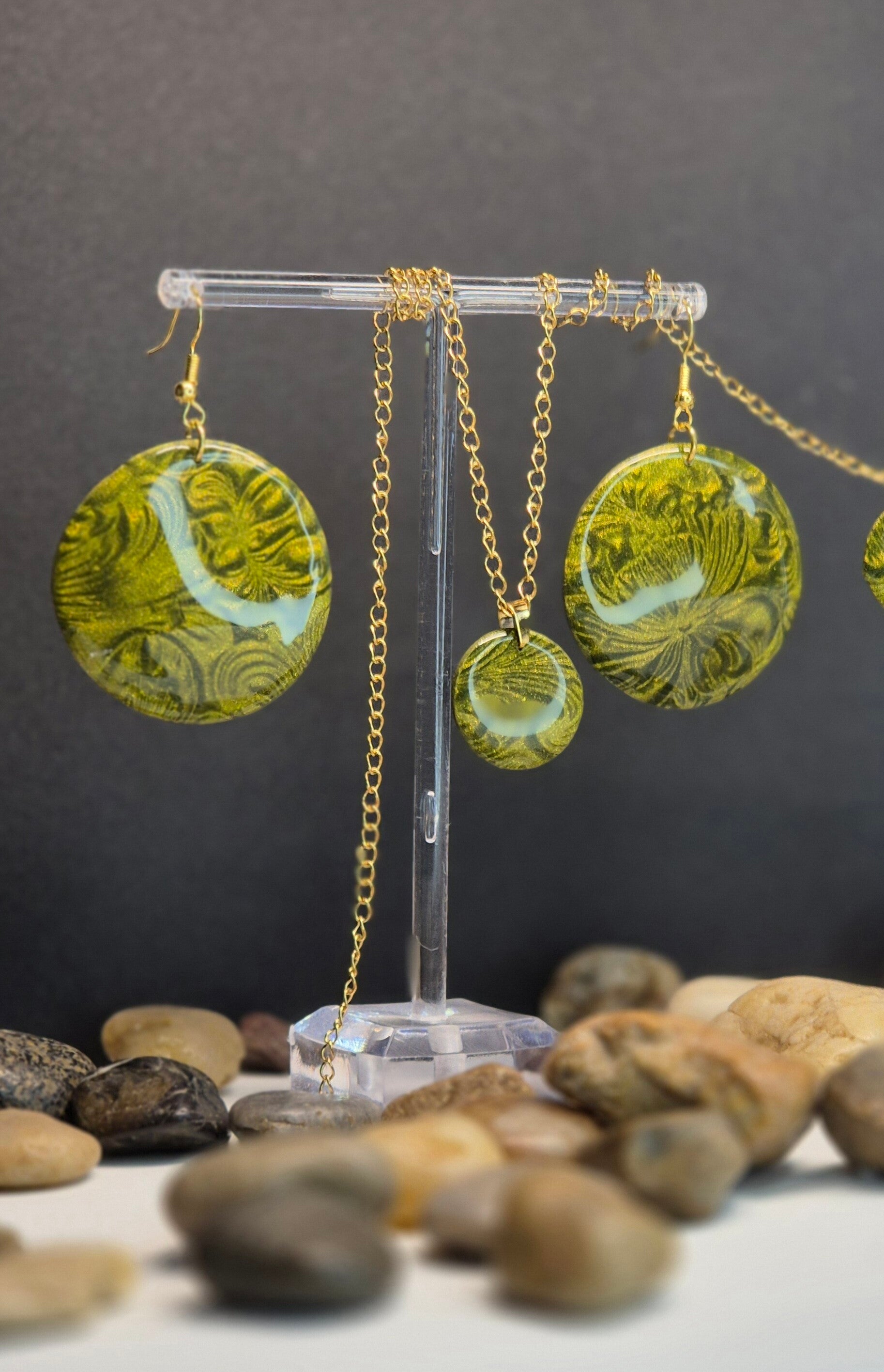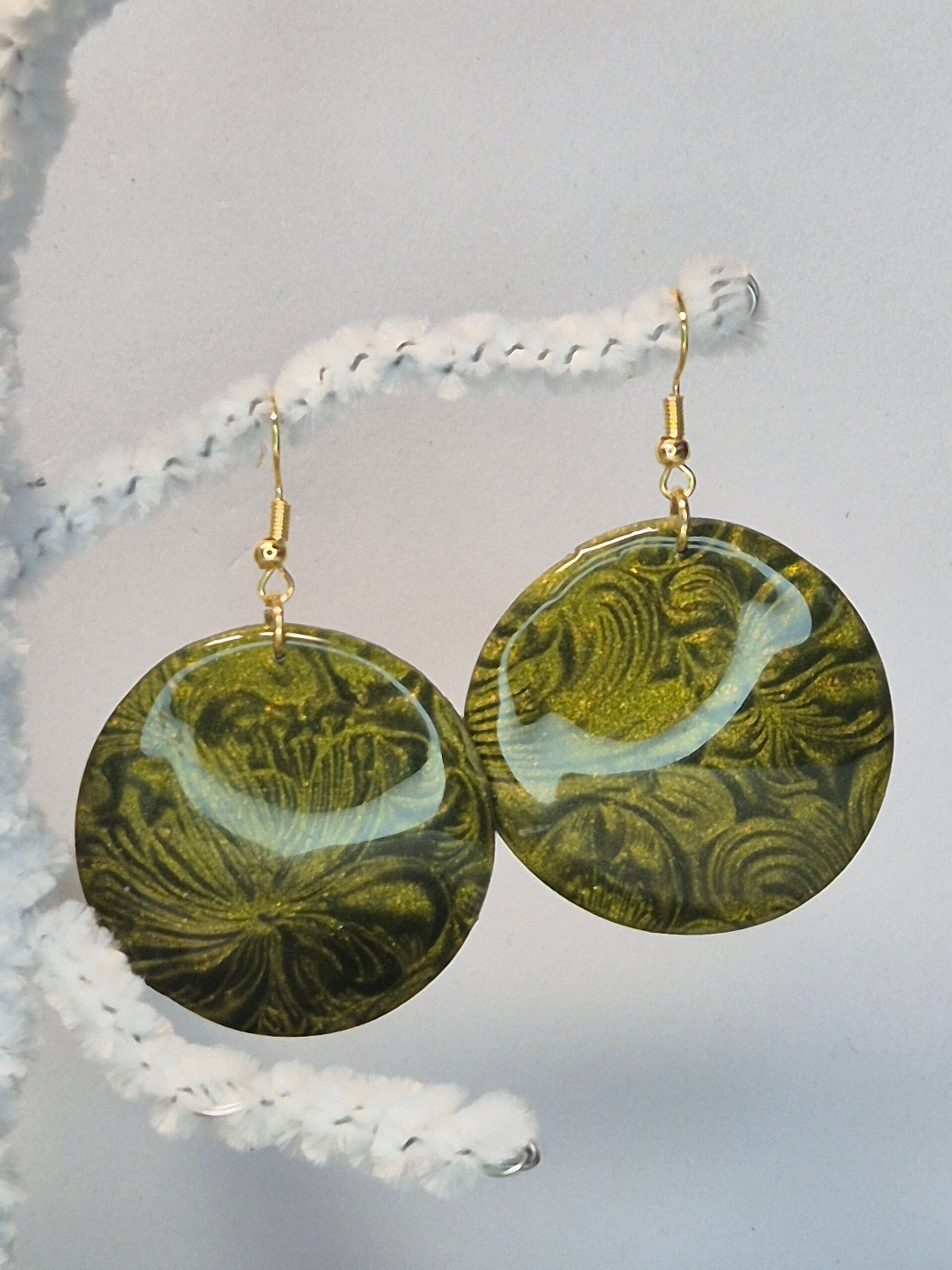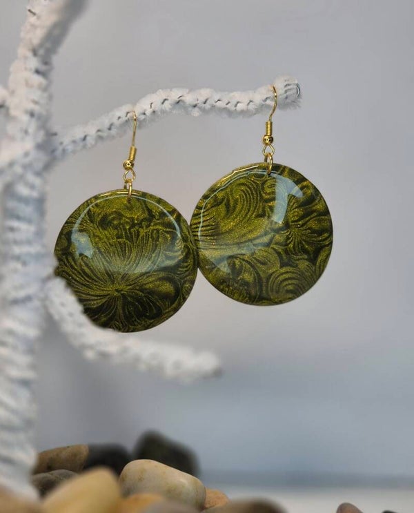 Pendientes de la colección OTOÑO, hechos de forma artesana con arcilla polimérica, con arcilla metalizada en verde oliva.