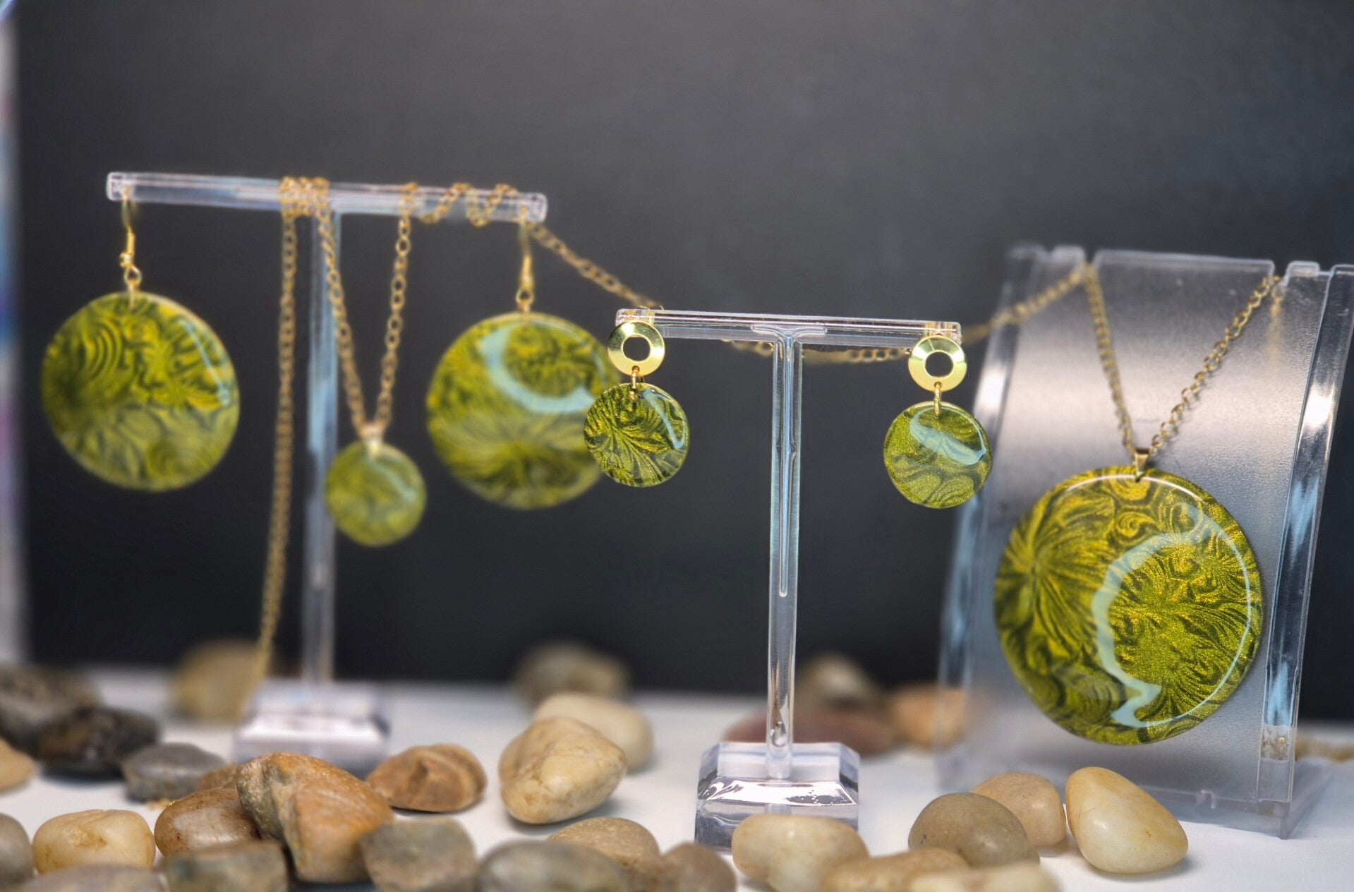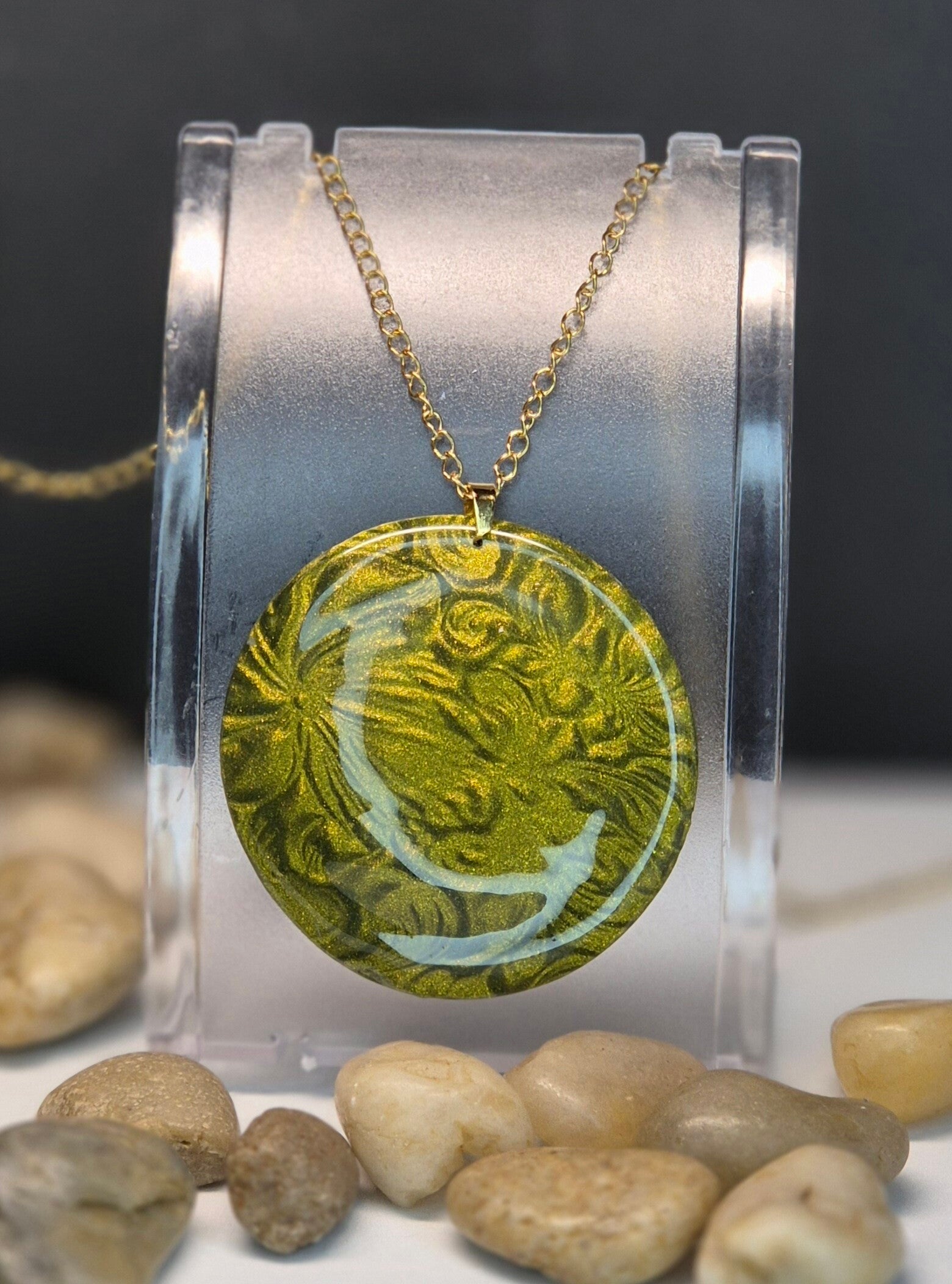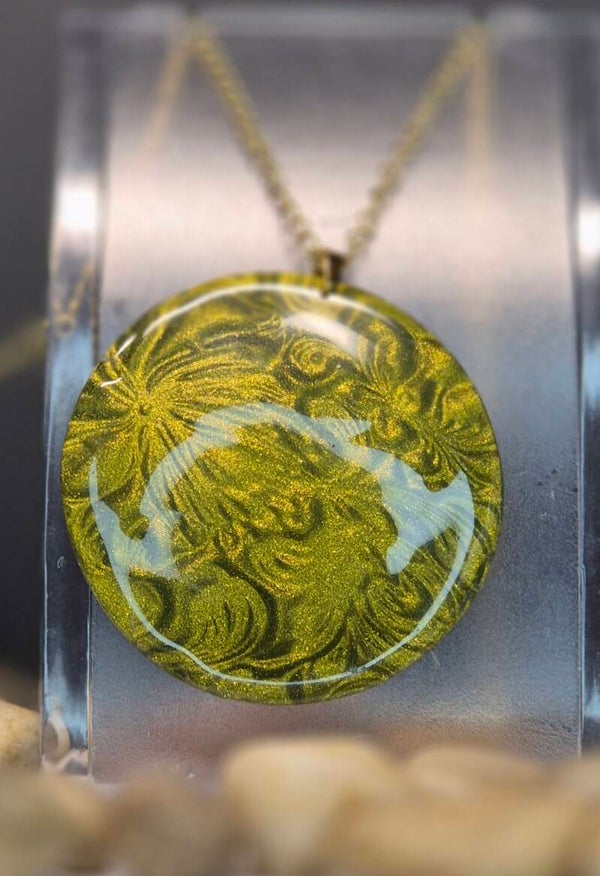 Colgante de la colección OTOÑO, hecho de forma artesana con arcilla polimérica metalizada en verde oliva.