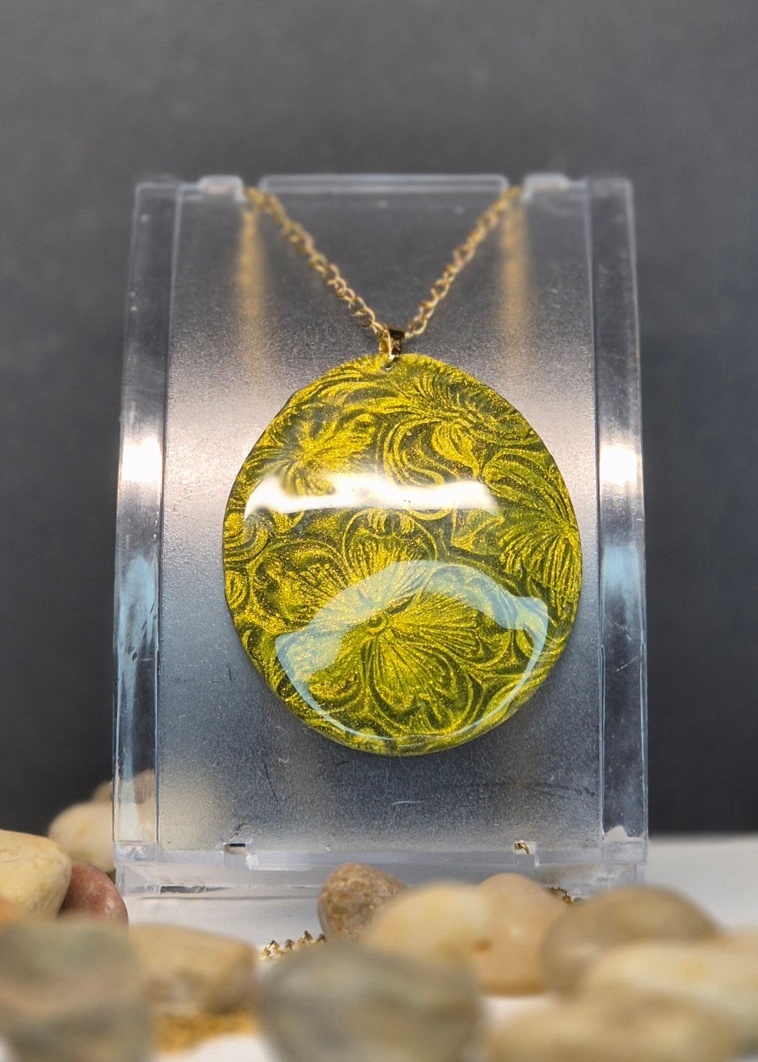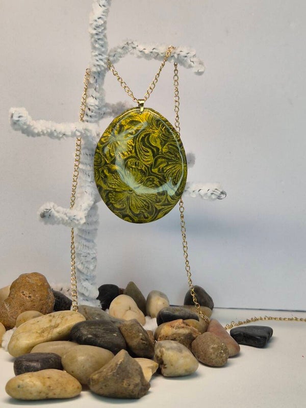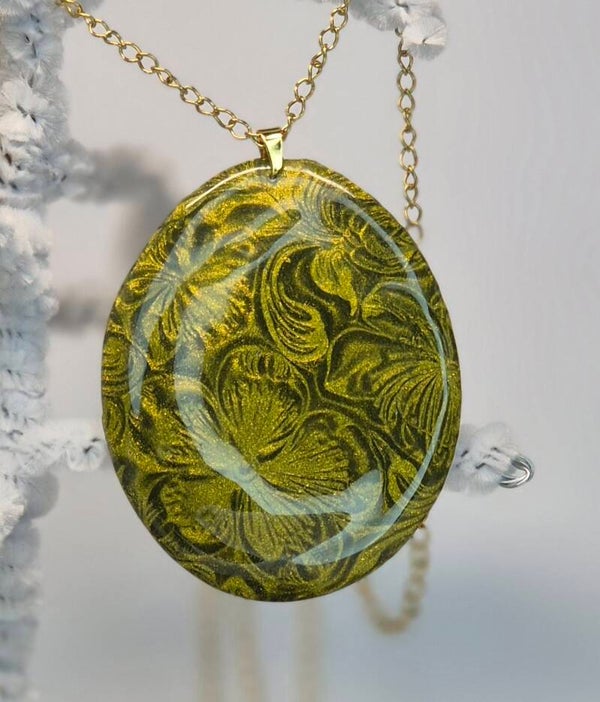 Colgante de la colección OTOÑO, hecho de forma artesana con arcilla polimérica metalizada en verde oliva.