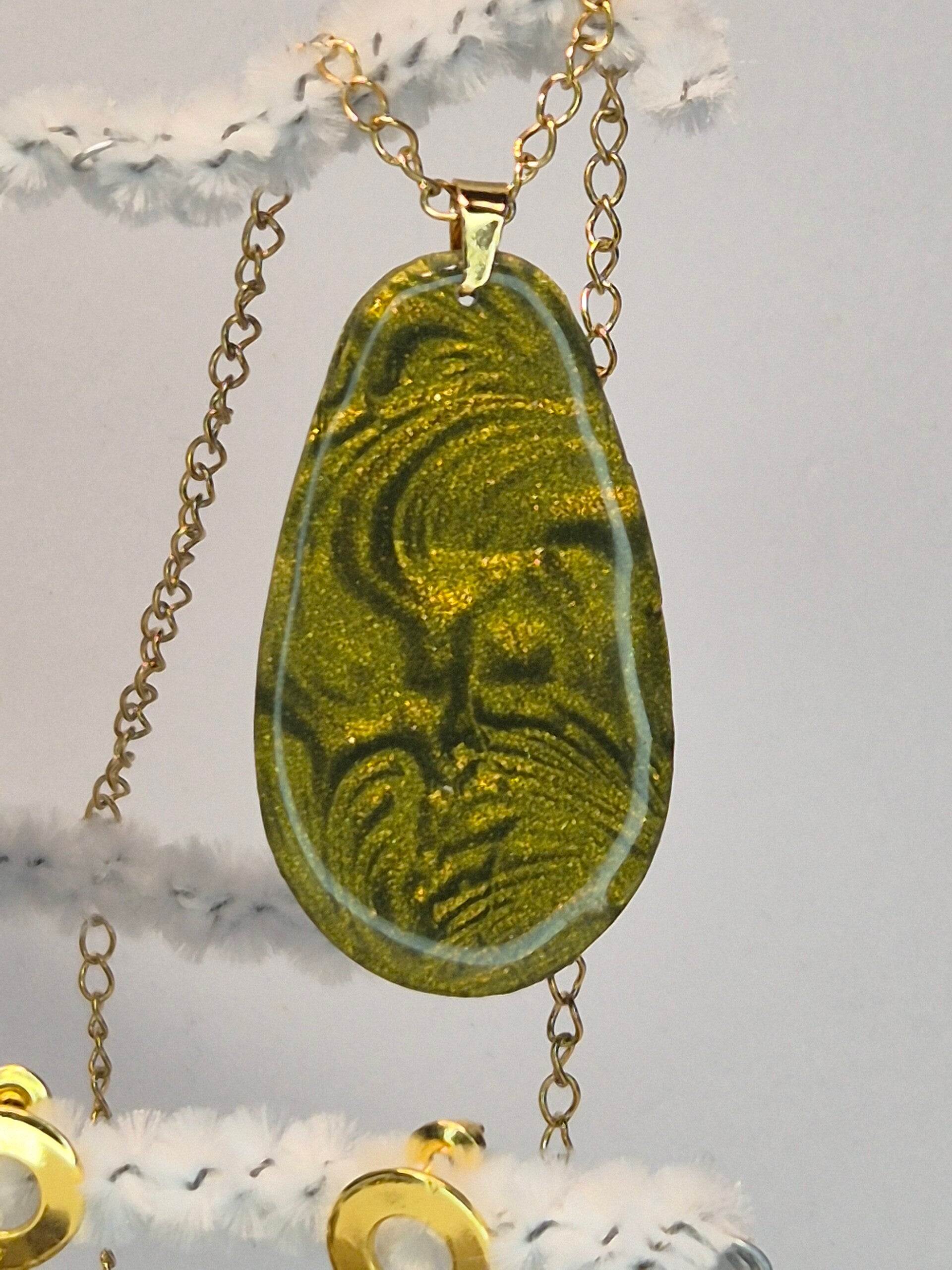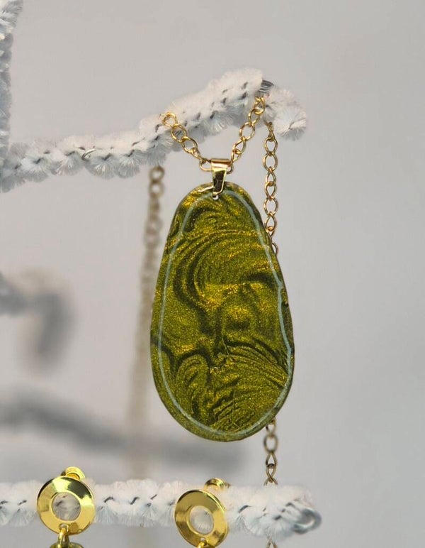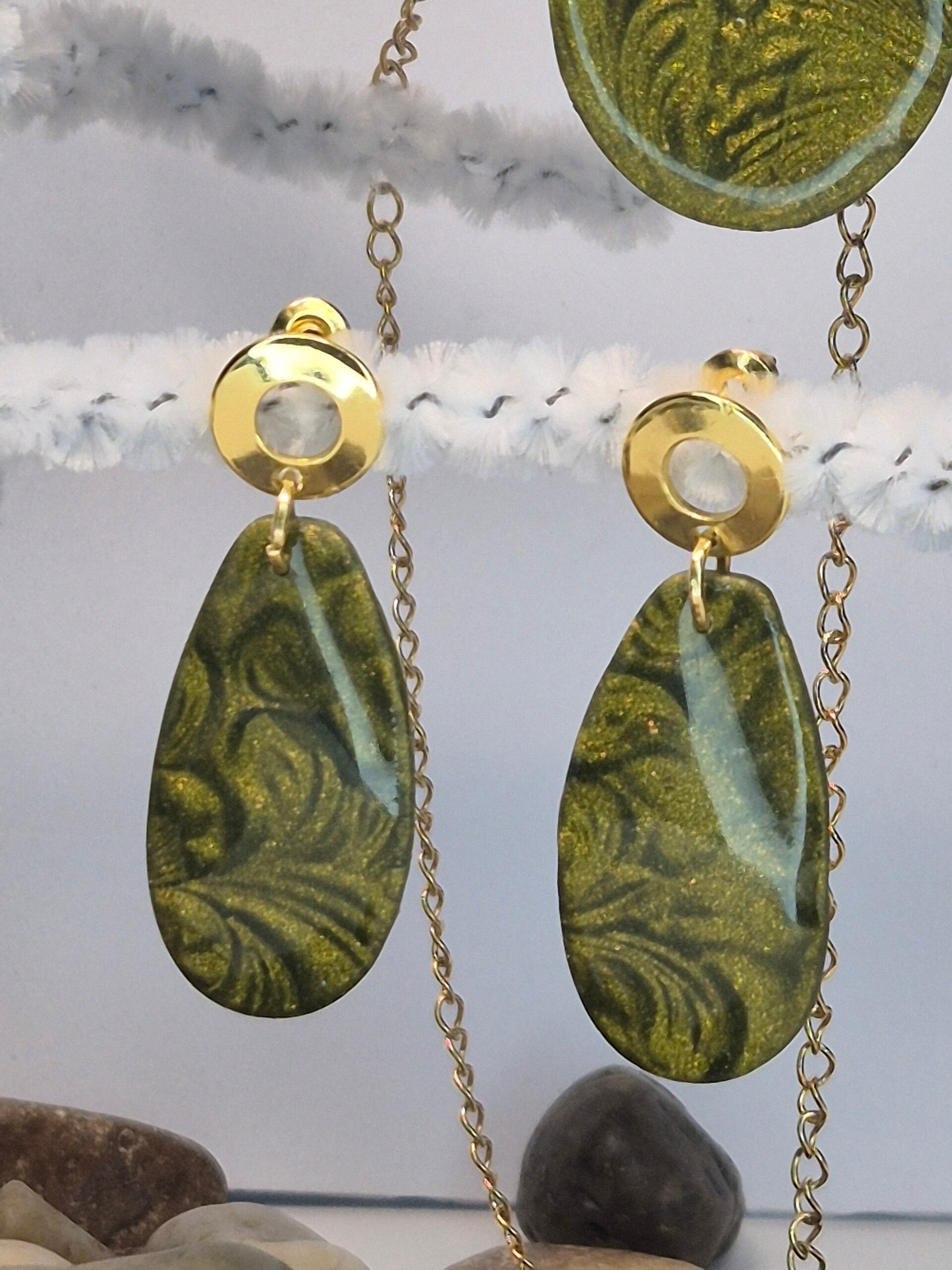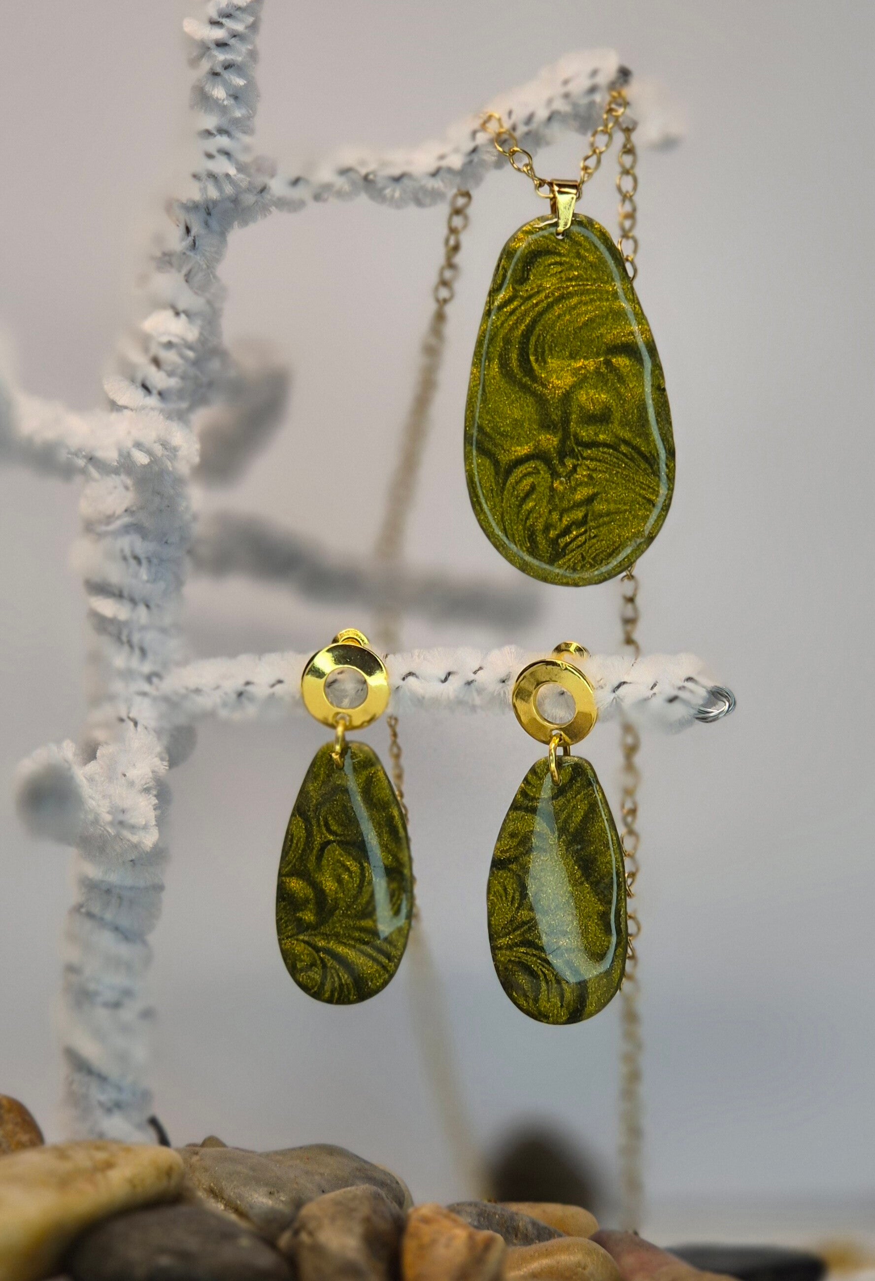 Conjunto de pendientes y colgante de la colección OTOÑO, hechos de forma artesana con arcilla polimérica metalizada en verde oliva.