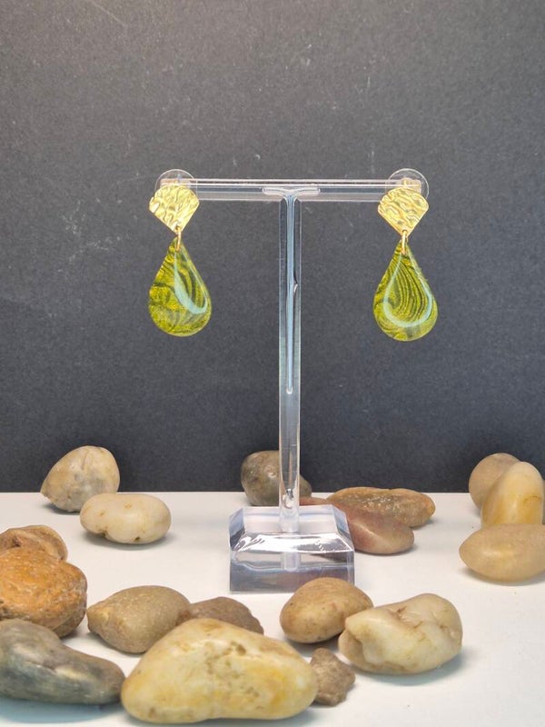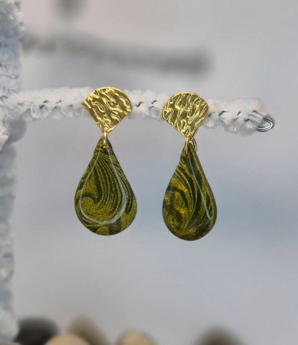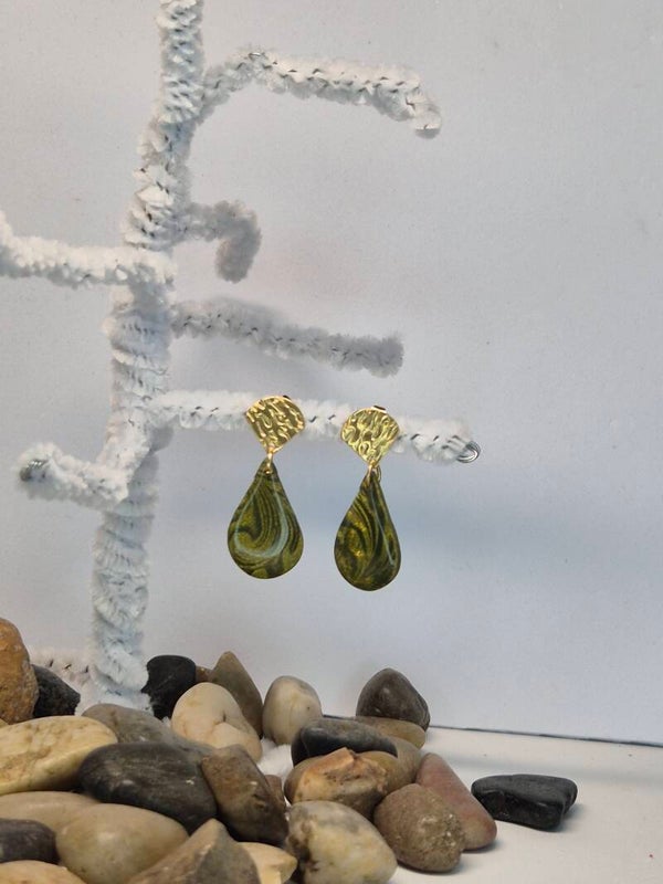 Pendientes de la colección OTOÑO, hechos de forma artesana con arcilla polimérica metalizada en verde oliva.
