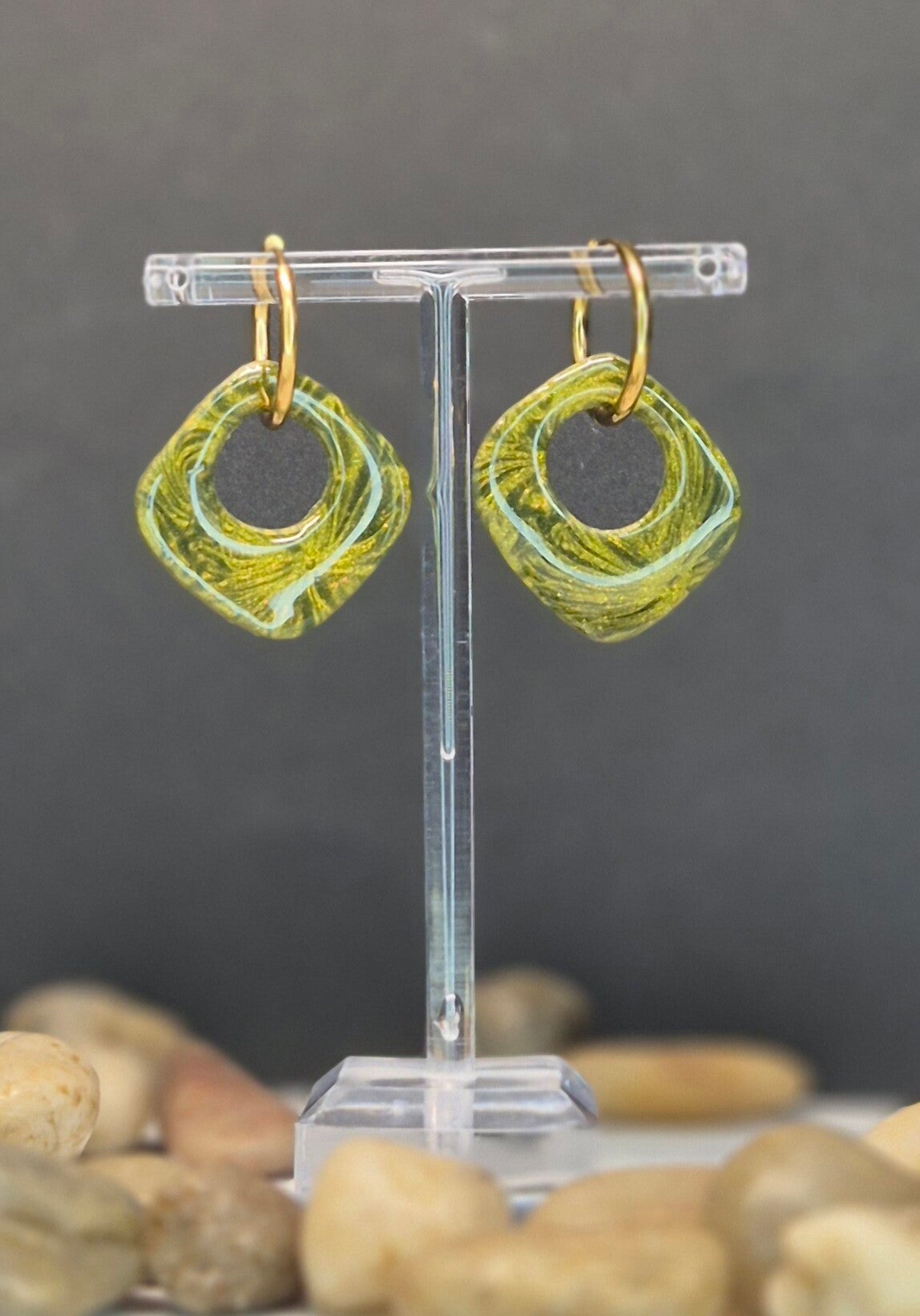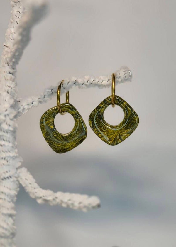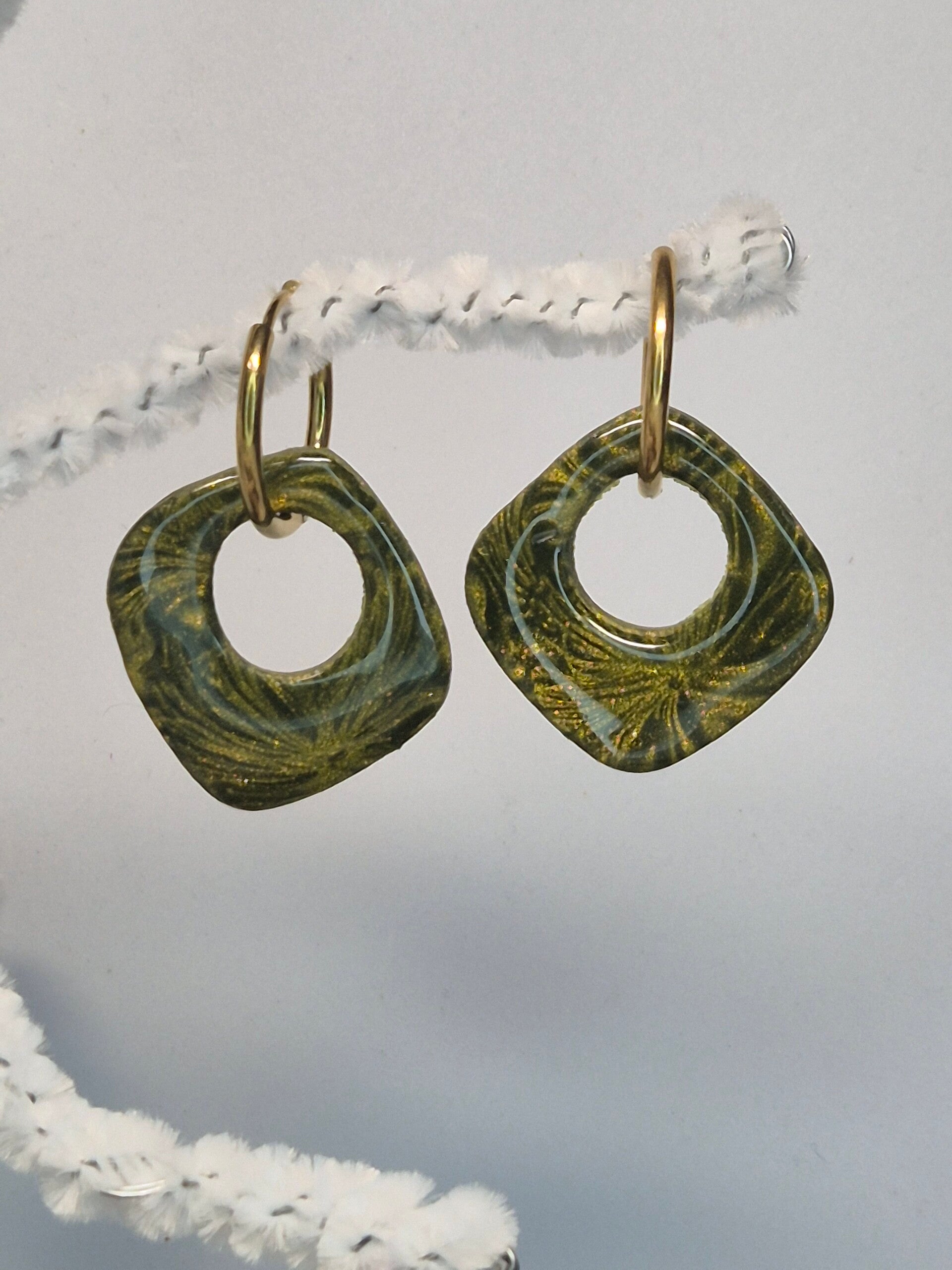 Pendientes de la colección OTOÑO, hechos de forma artesana con arcilla polimérica metalizada en verde oliva.