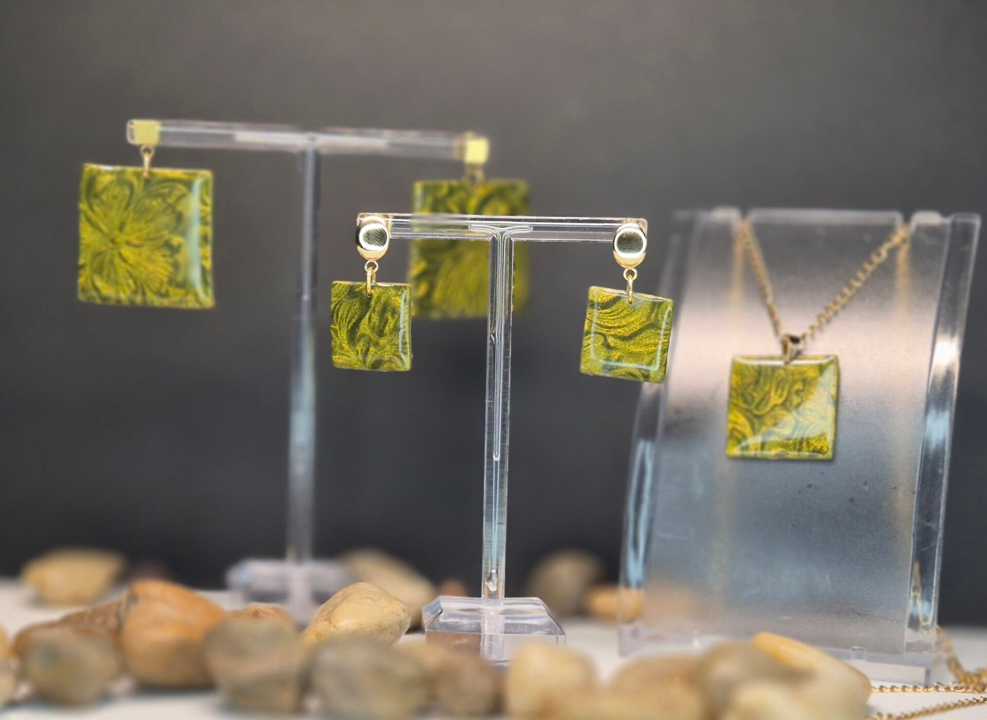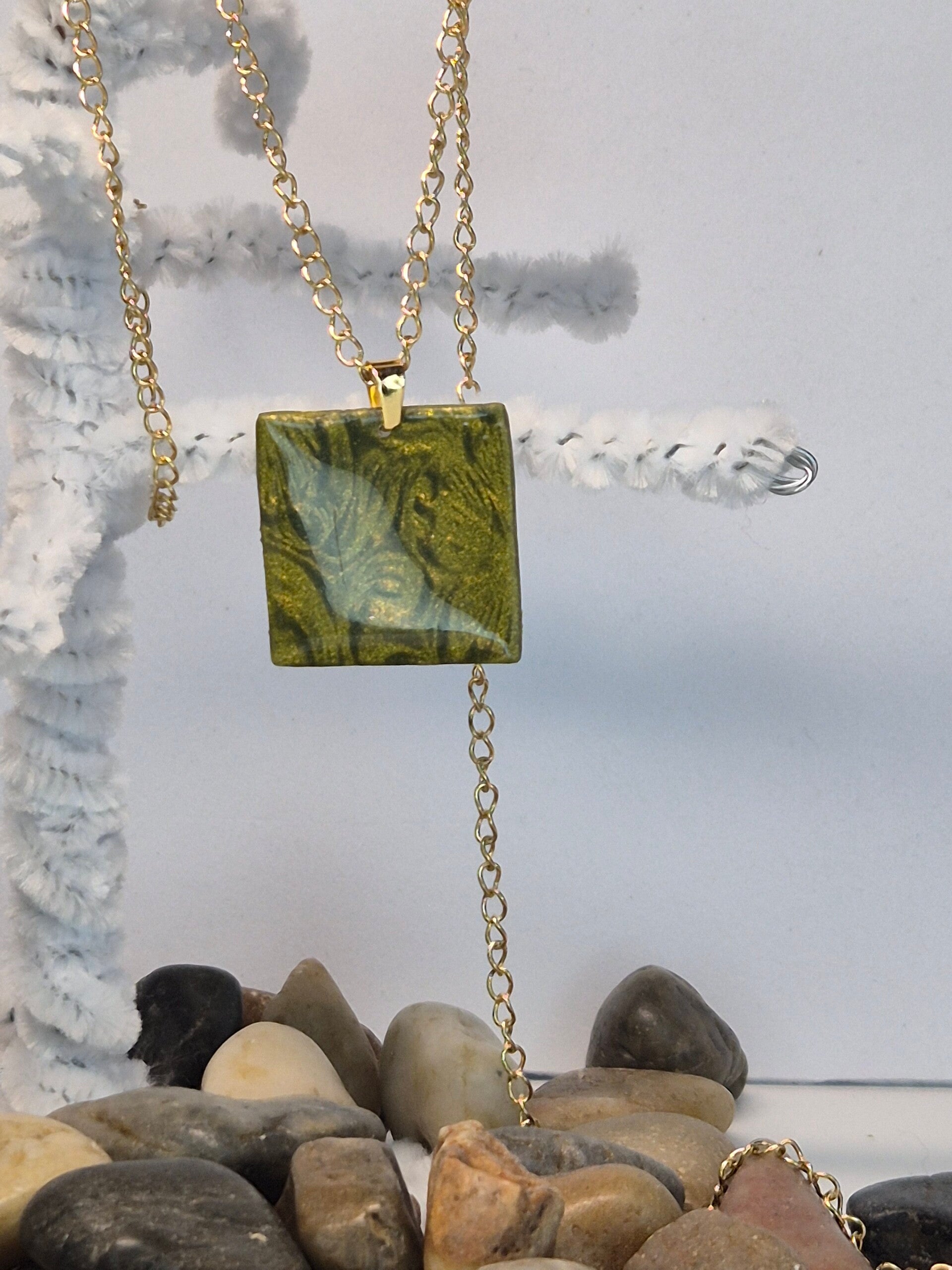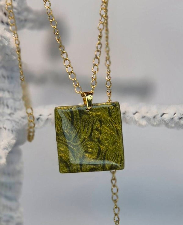 Colgante de la colección OTOÑO, hecho de forma artesana con arcilla polimérica metalizada en verde oliva.