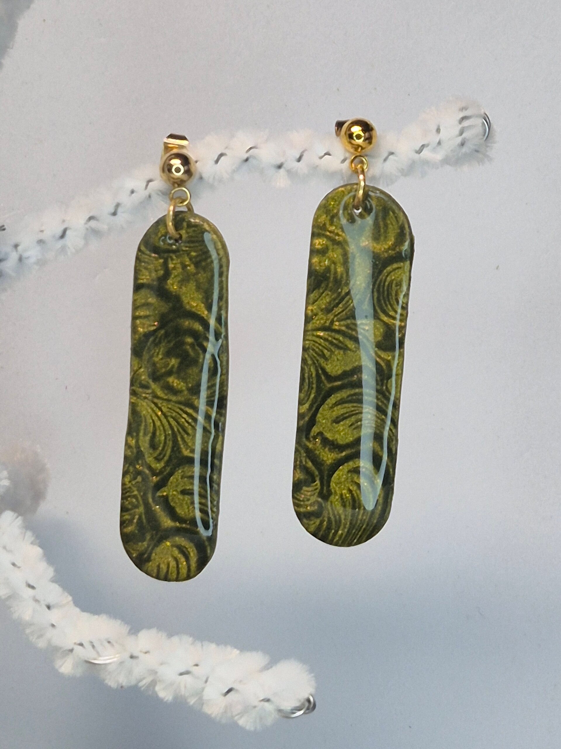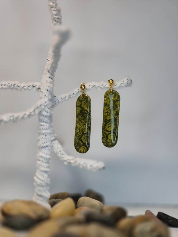 Pendientes de la colección OTOÑO, hechos de forma artesana con arcilla polimérica metalizada en verde oliva.
