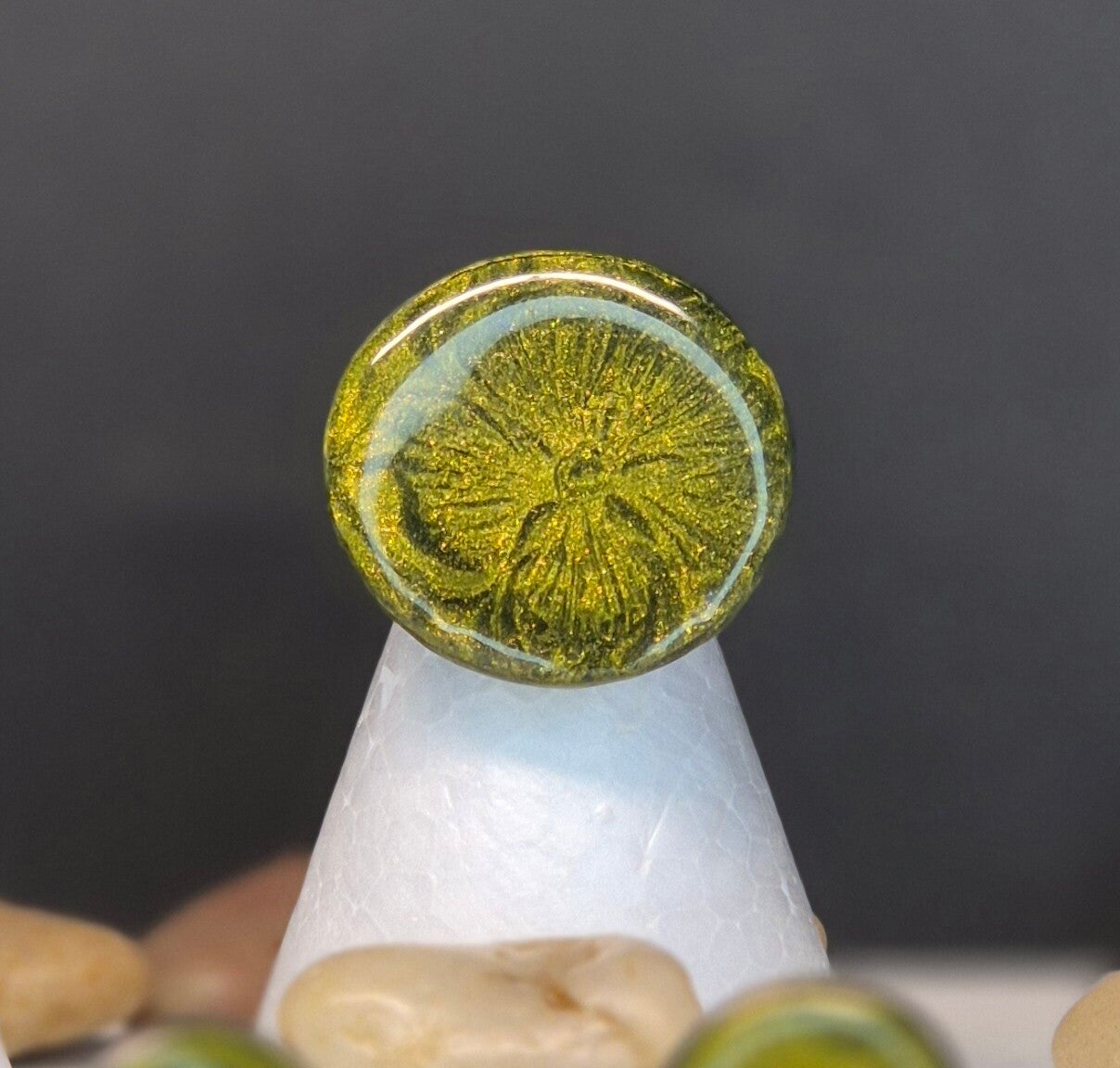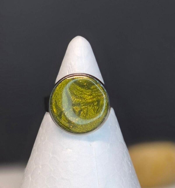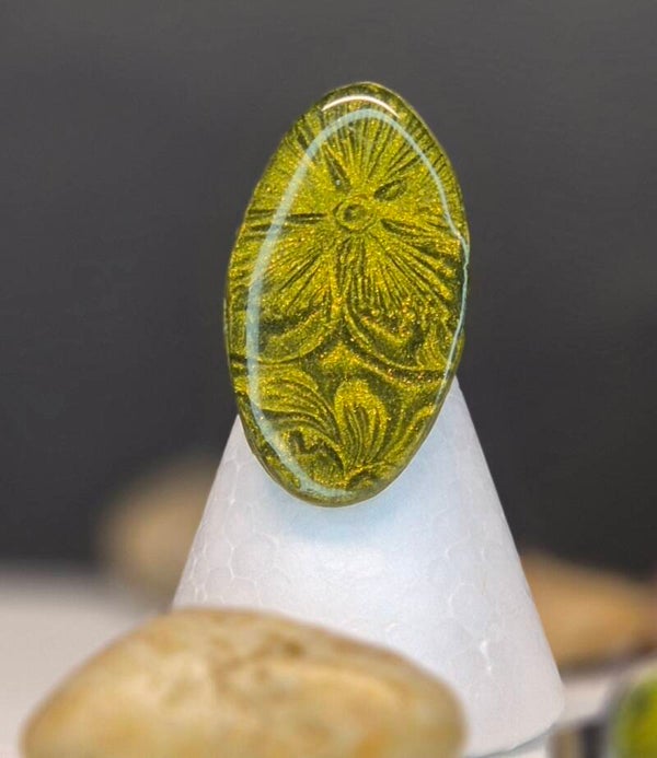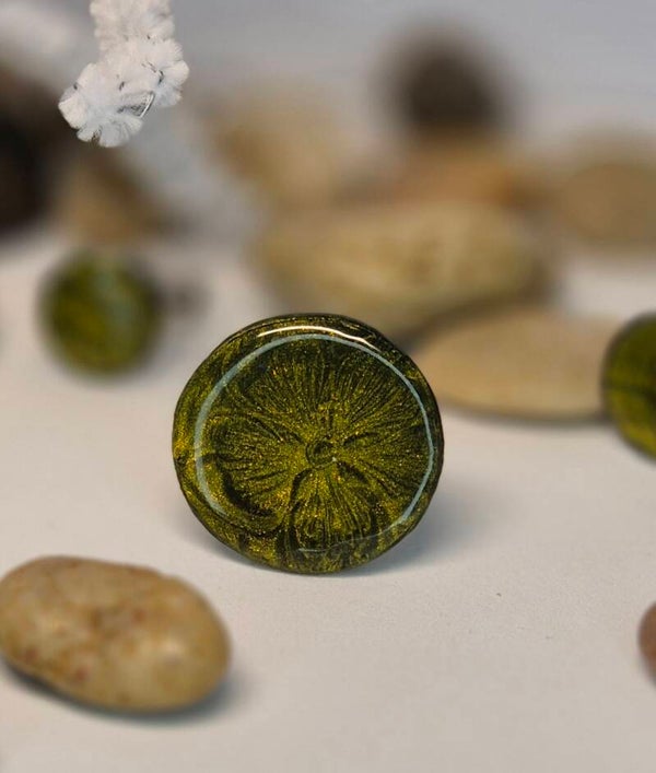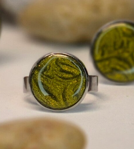 Anillos de la colección OTOÑO, hechos de forma artesana con arcilla polimérica, con arcilla metalizada enverde oliva.
