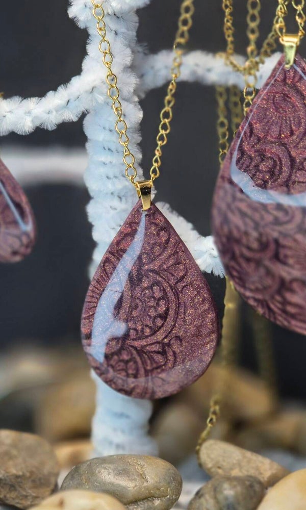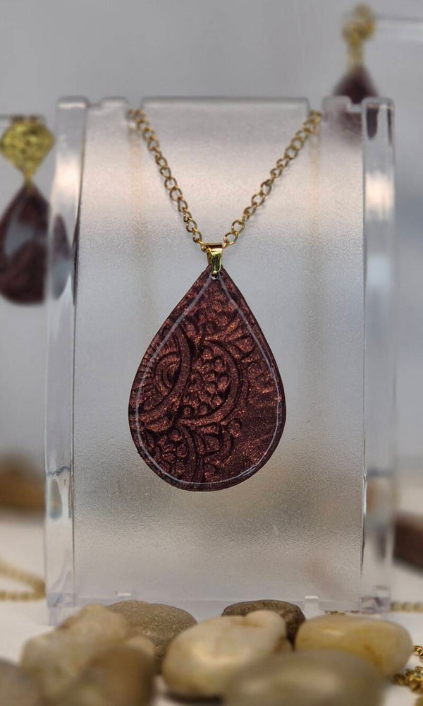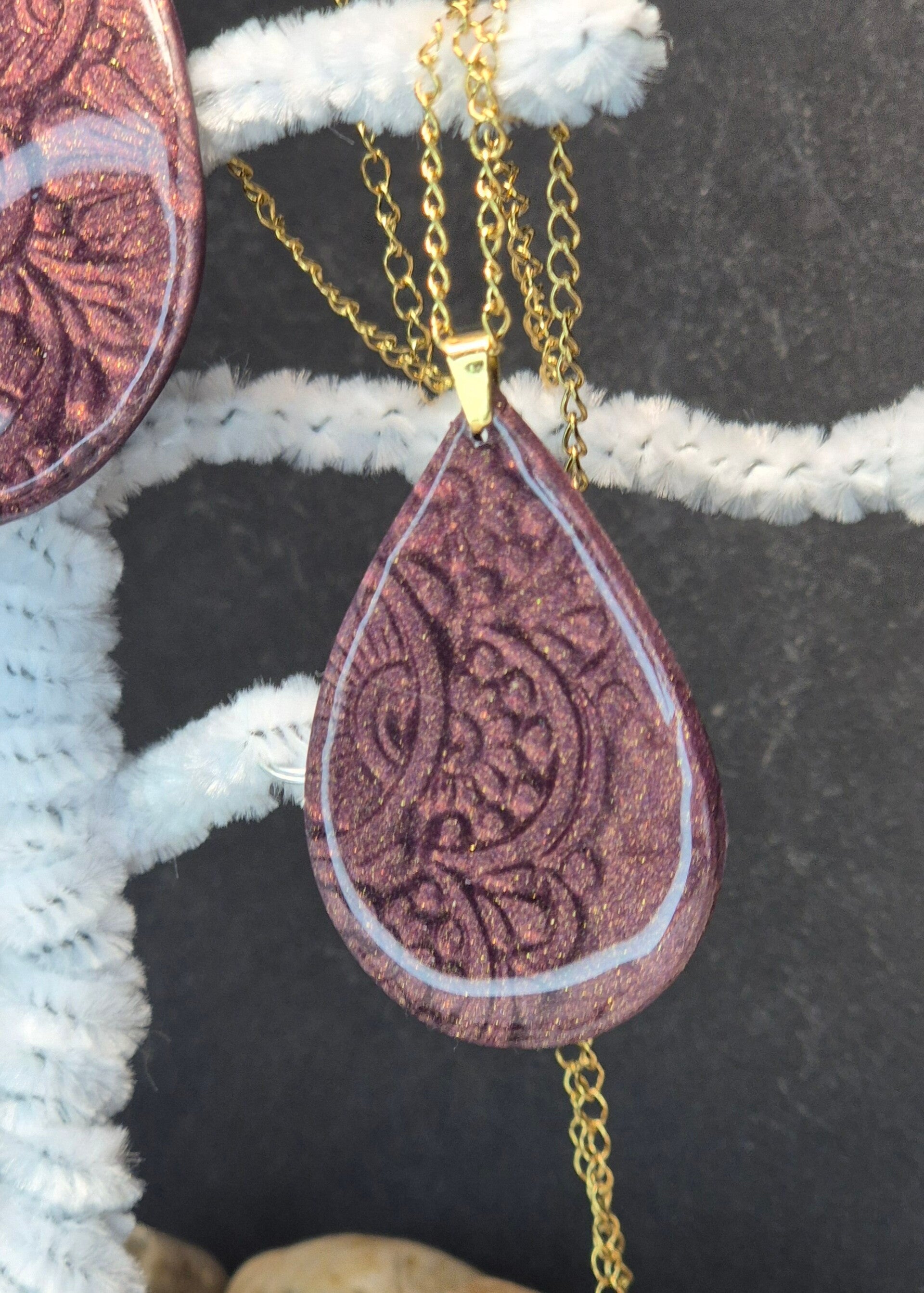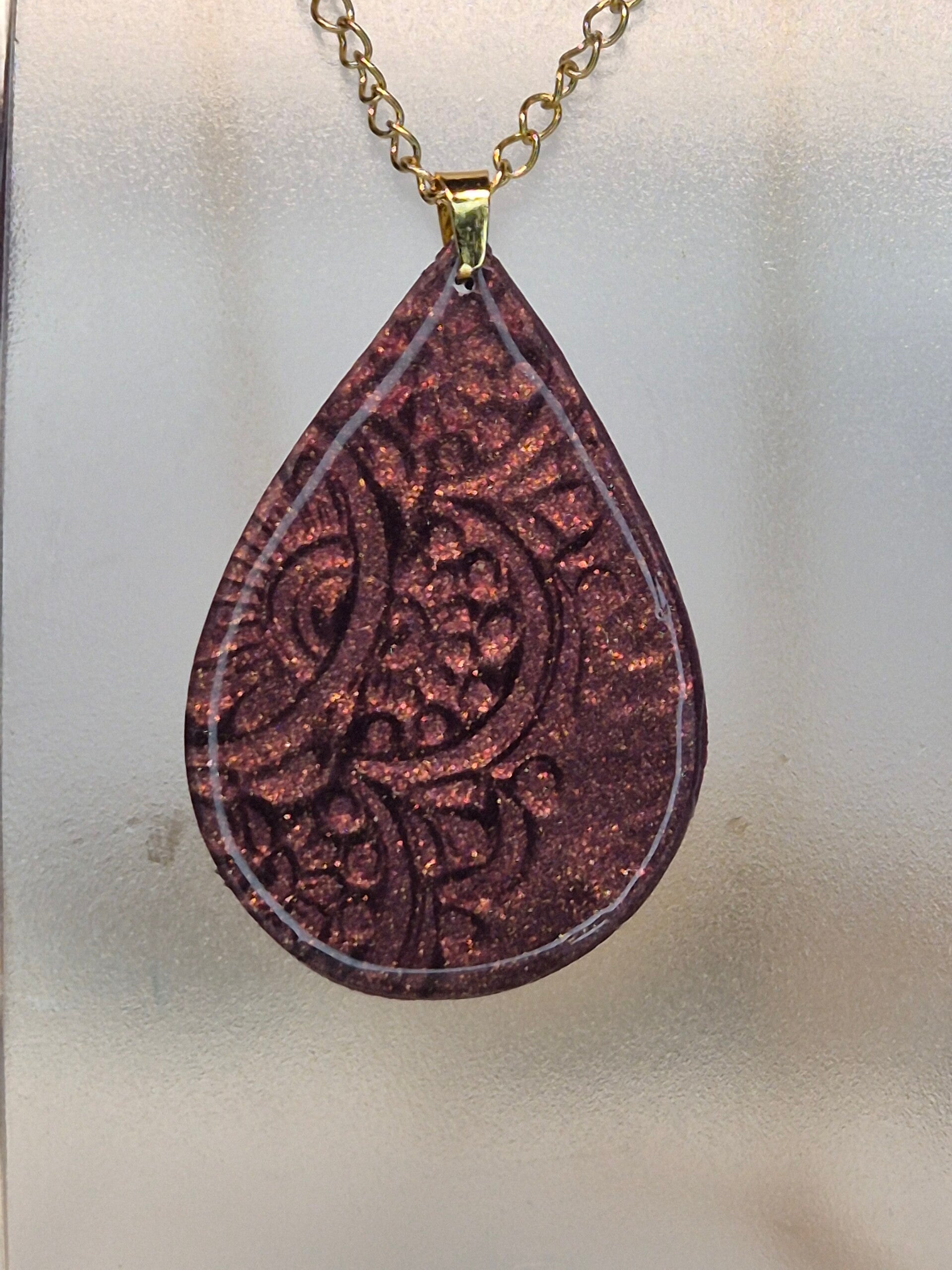 Colgante de la colección OTOÑO, hecho de forma artesana con arcilla polimérica metalizada en granate.