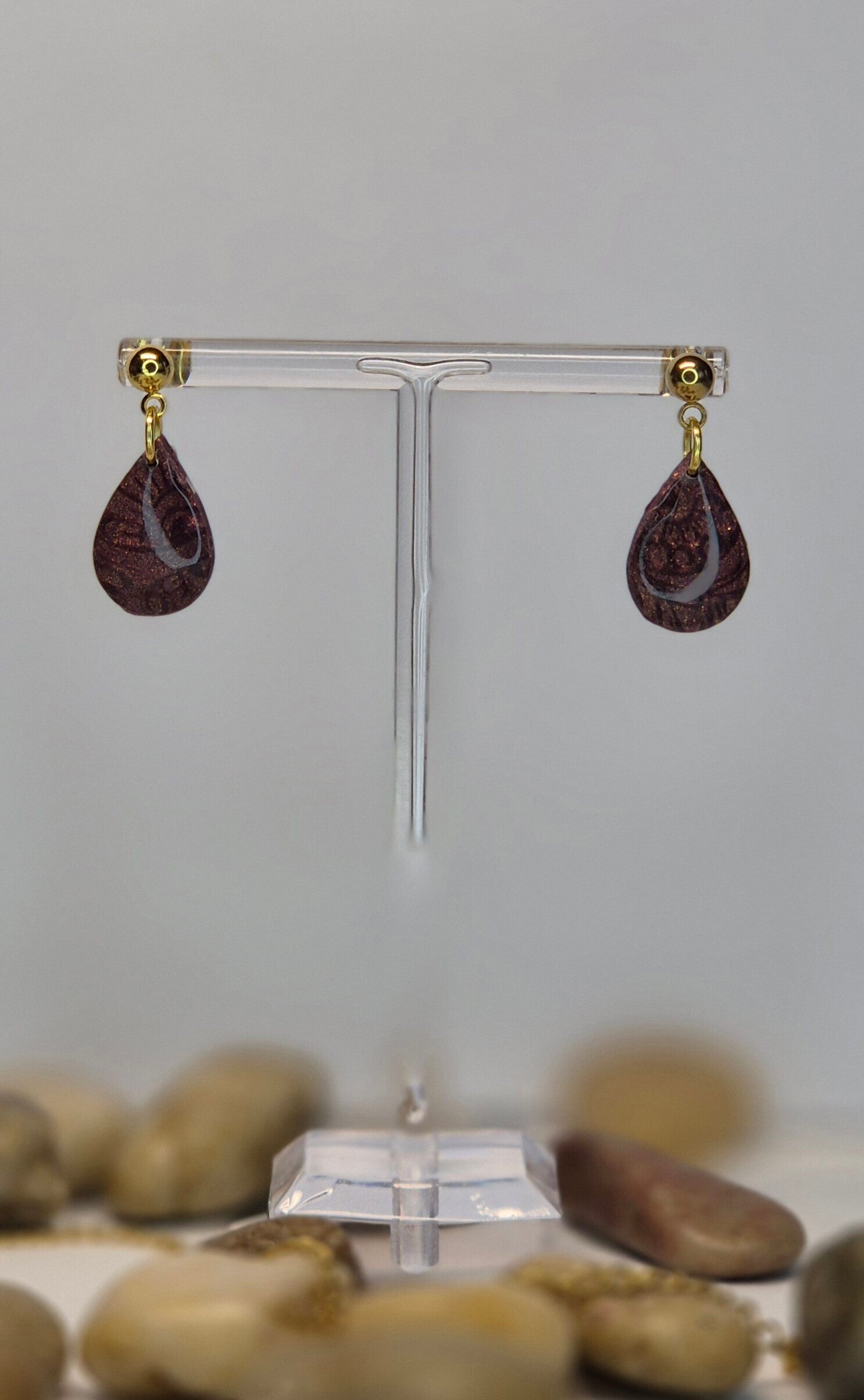 Pendientes de la colección OTOÑO, hechos de forma artesana con arcilla polimérica metalizada en verde oliva.