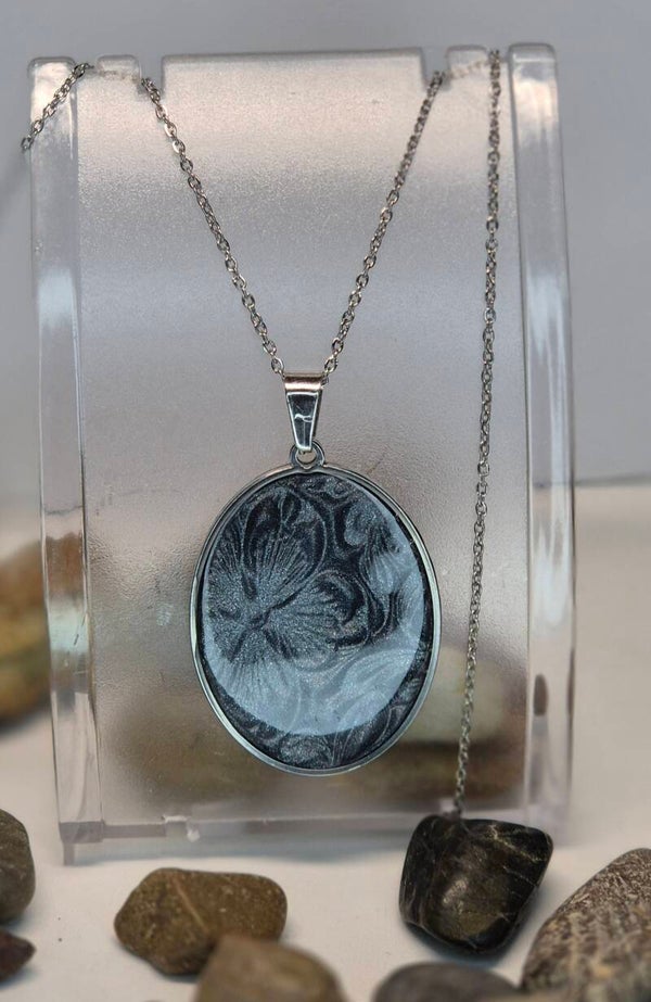 Colgante de la colección OTOÑO, hecho de forma artesana con arcilla polimérica metalizada en color pizarra.