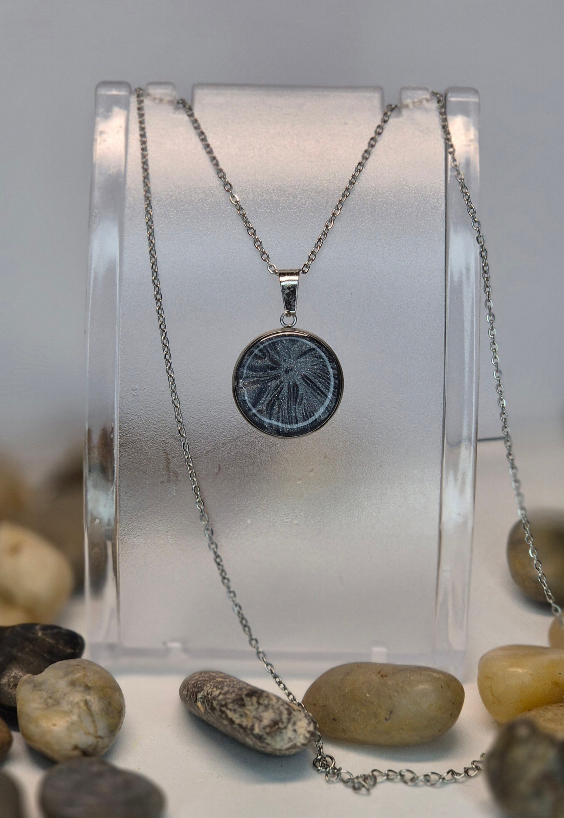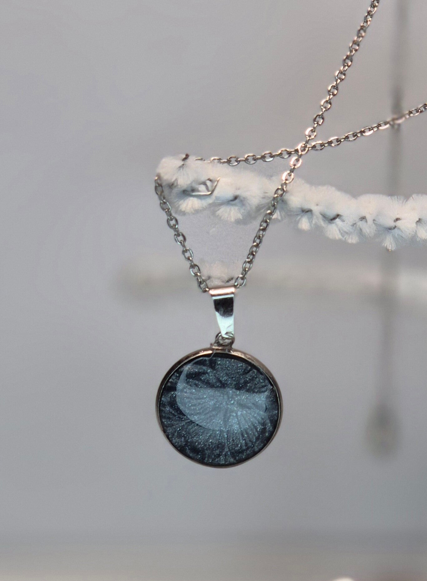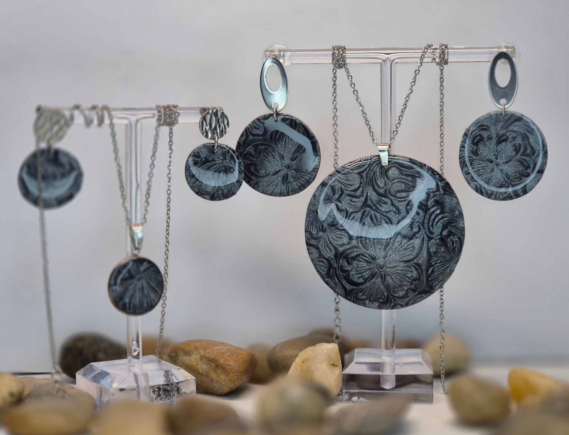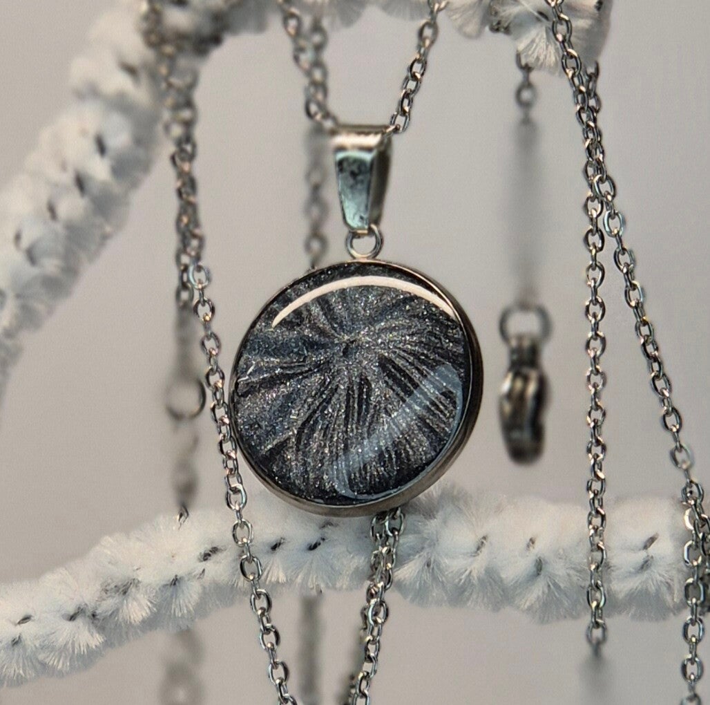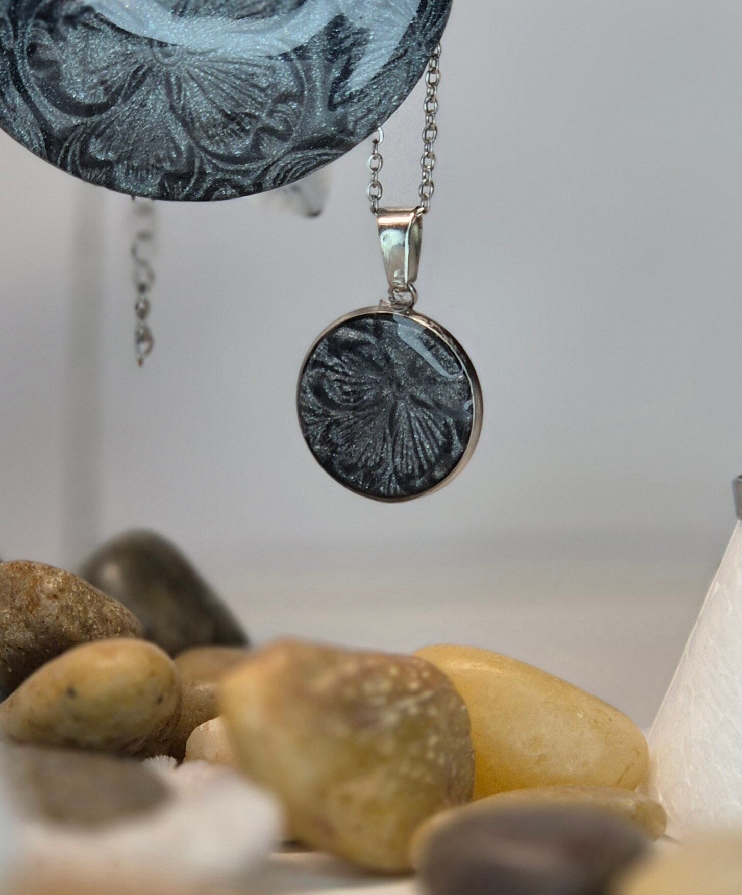Colgante de la colección OTOÑO, hecho de forma artesana con arcilla polimérica metalizada en color pizarra.