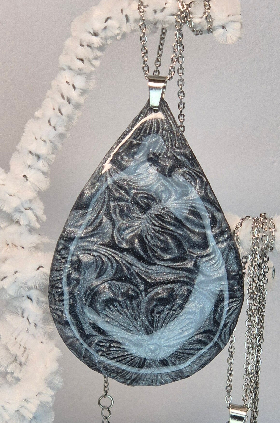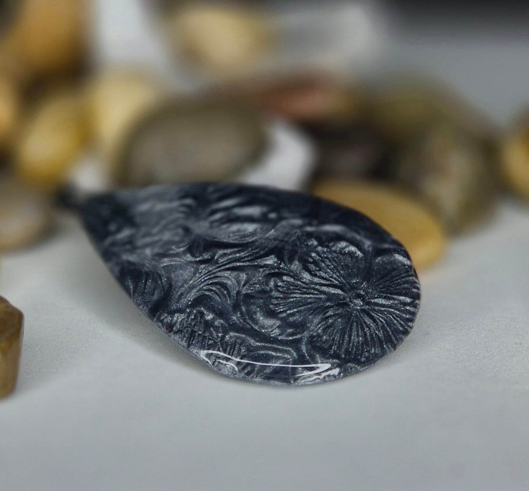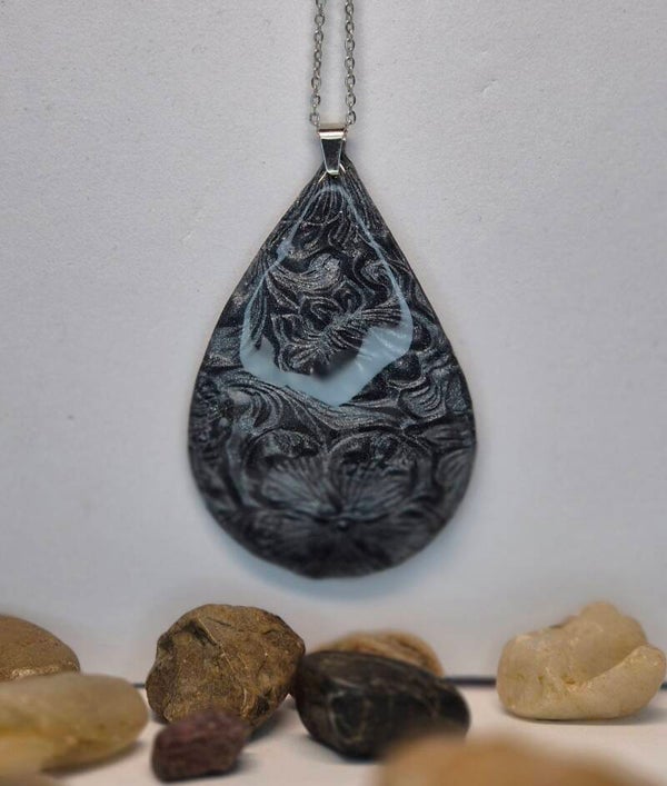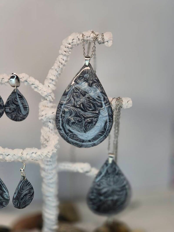 Colgante de la colección OTOÑO, hecho de forma artesana con arcilla polimérica metalizada en color pizarra.