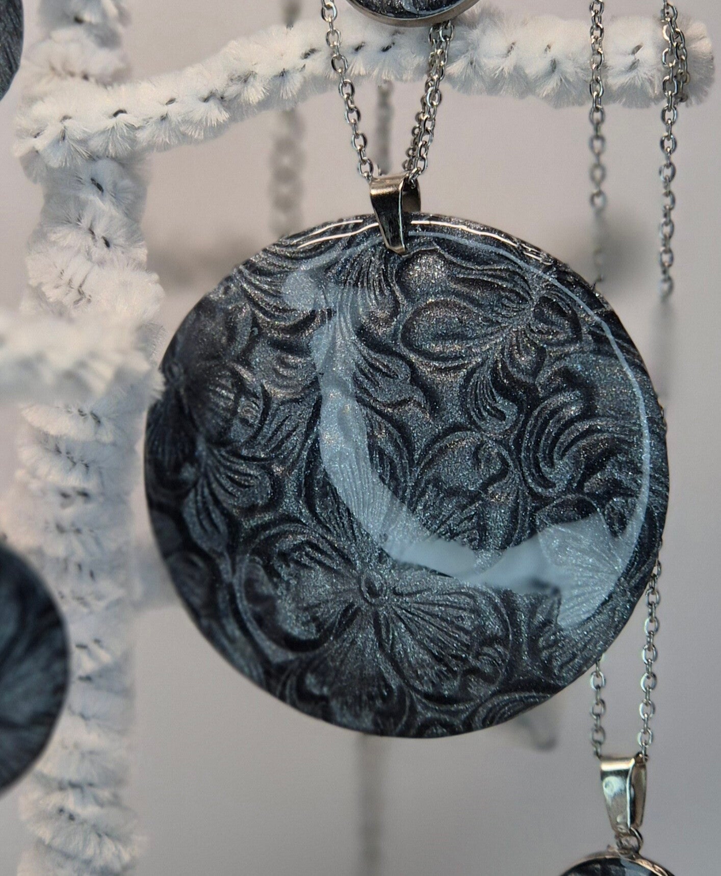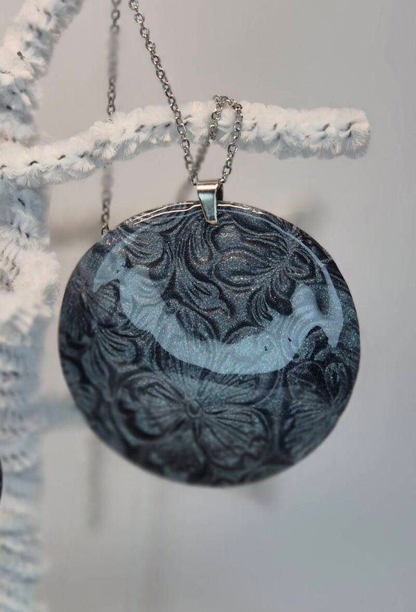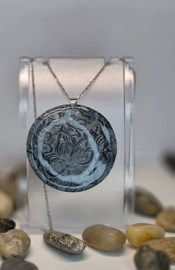 Colgante de la colección OTOÑO, hecho de forma artesana con arcilla polimérica metalizada en color pizarra.