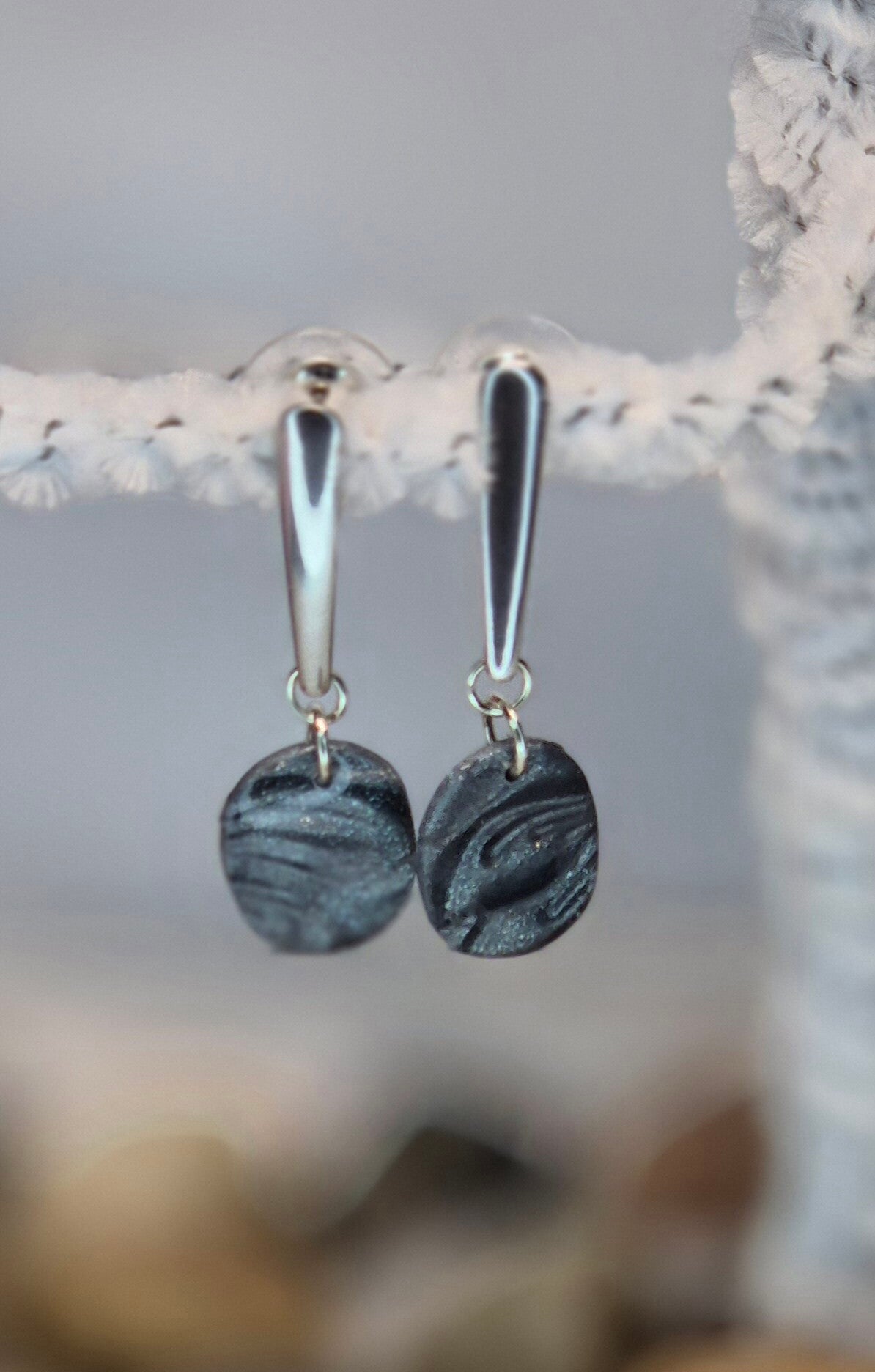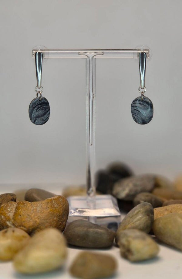 Pendientes de la colección OTOÑO, hechos de forma artesana con arcilla polimérica metalizada en color pizarra.