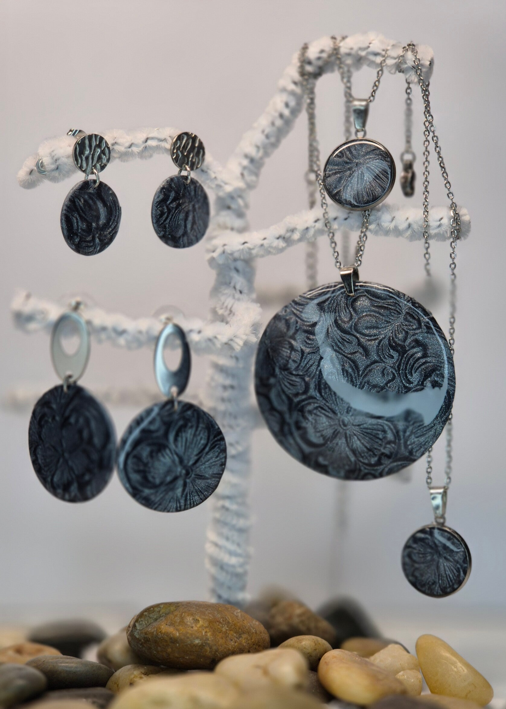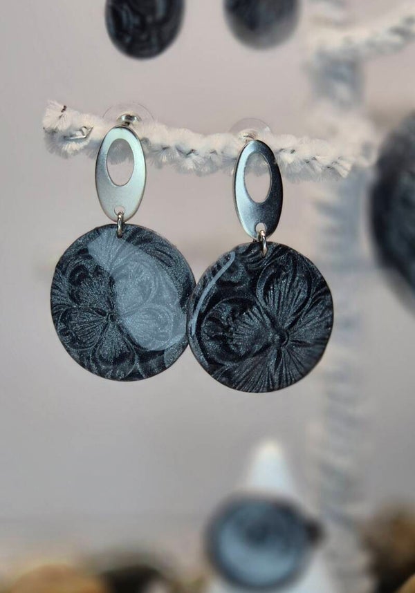 Pendientes de la colección OTOÑO, hechos de forma artesana con arcilla polimérica metalizada en color pizarra.