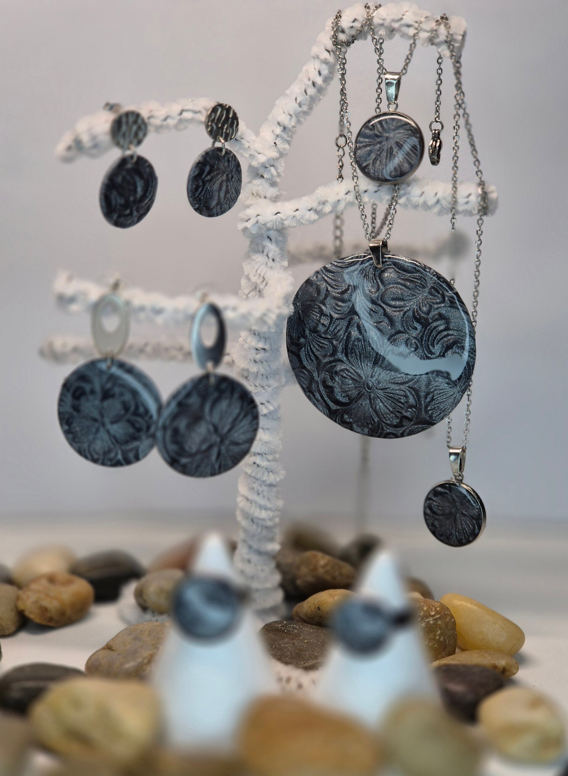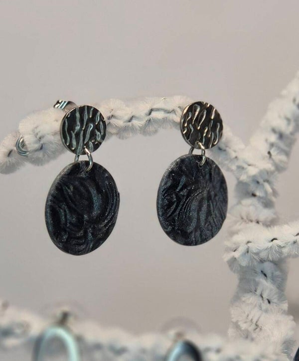 Pendientes de la colección OTOÑO, hechos de forma artesana con arcilla polimérica metalizada en color pizarra.