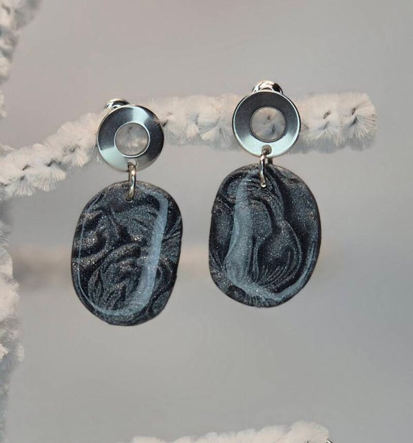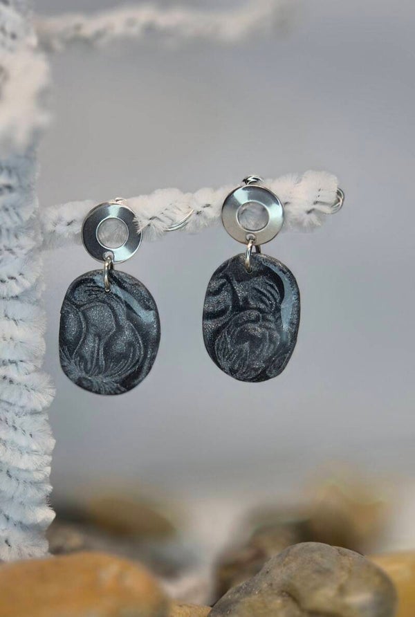 Pendientes de arcilla polimérica en todos los colores del arco iris, un jardín con el mar al fondo.