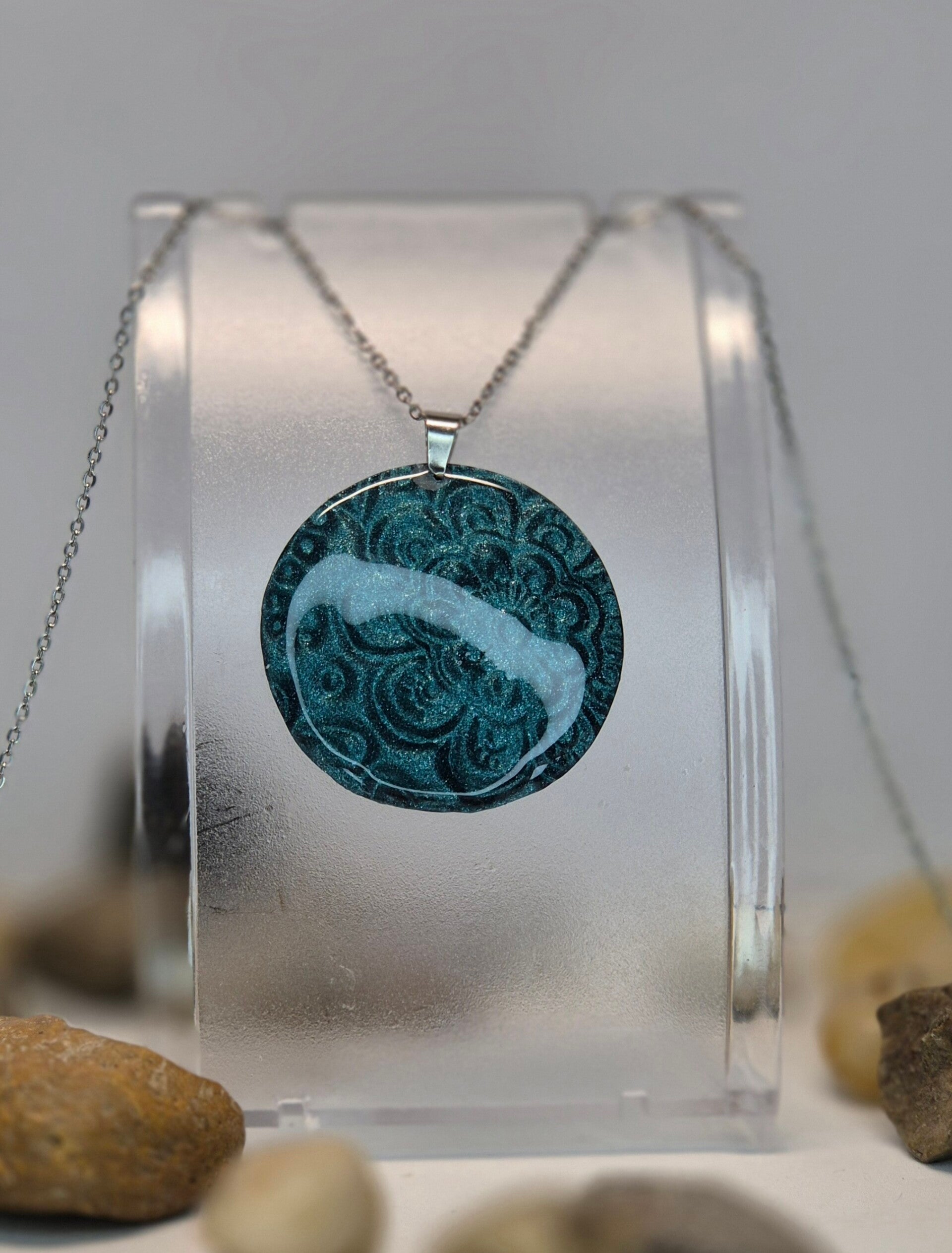 Colgante de la colección OTOÑO, hecho de forma artesana con arcilla polimérica metalizada en color esmeralda.