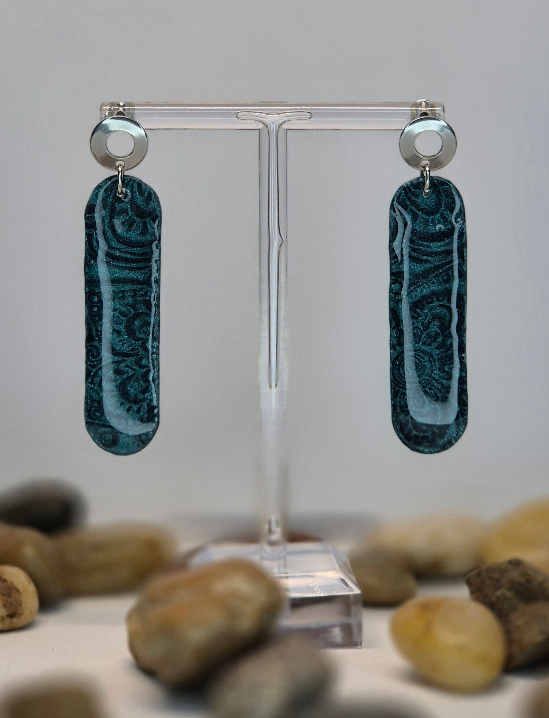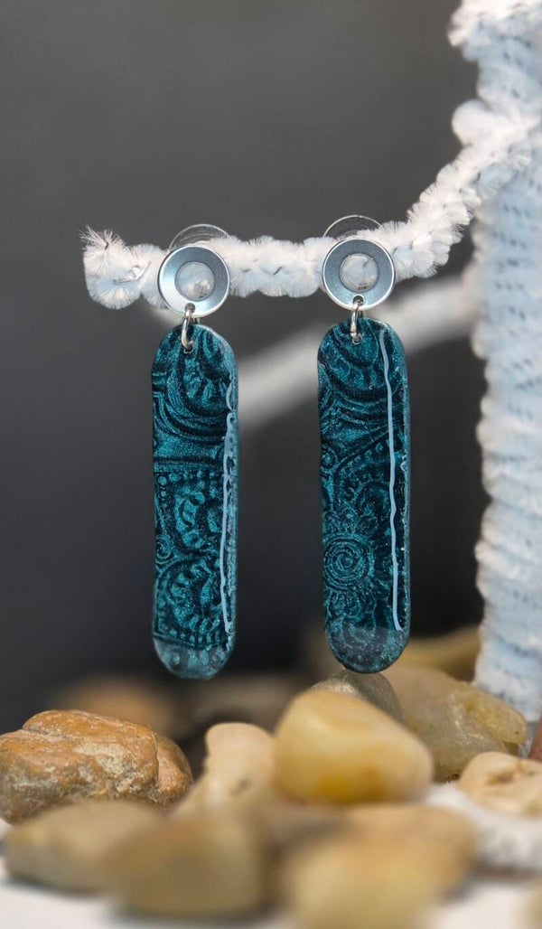 Pendientes de la colección OTOÑO, hechos de forma artesana con arcilla polimérica metalizada en color esmeralda.