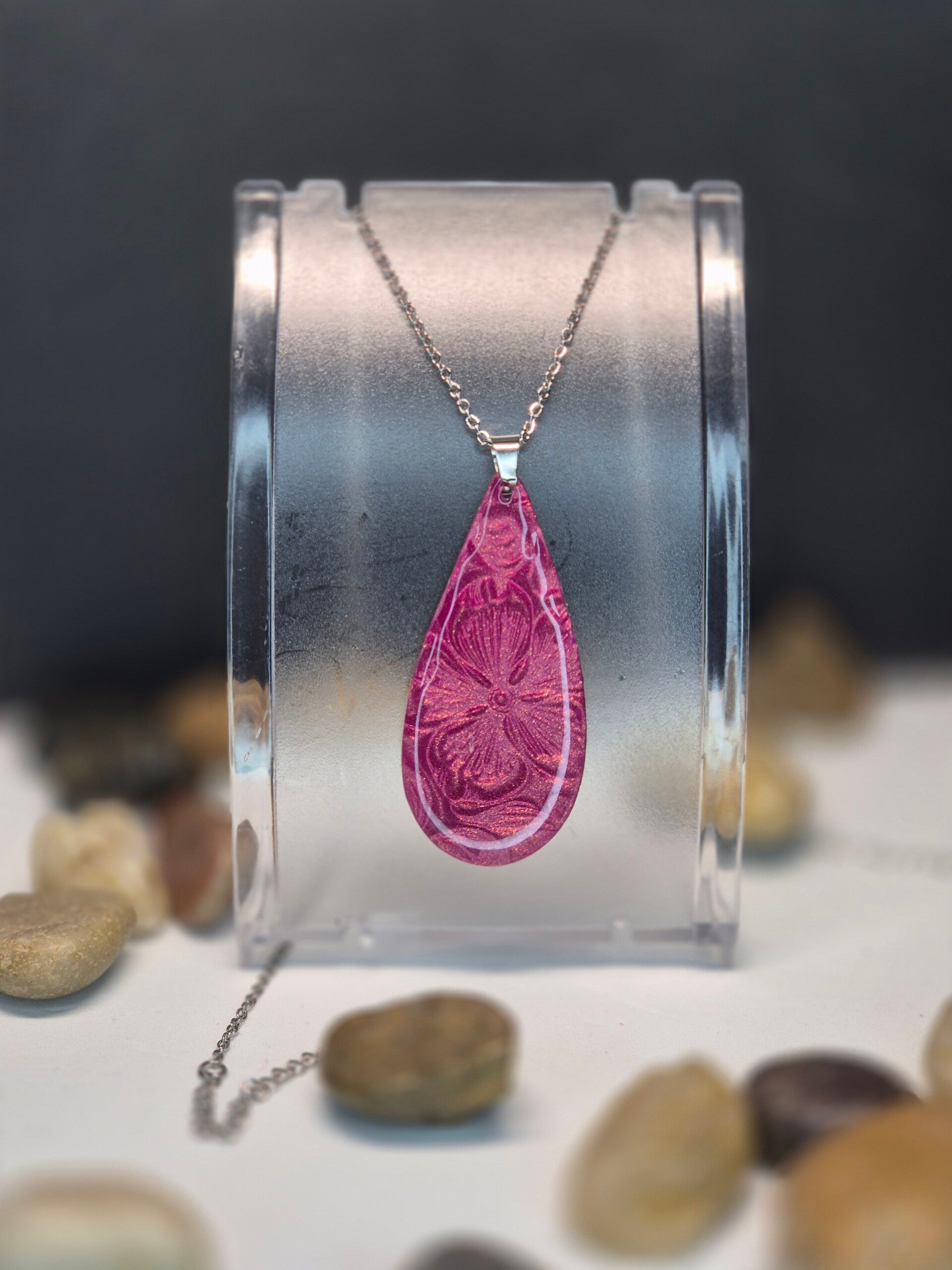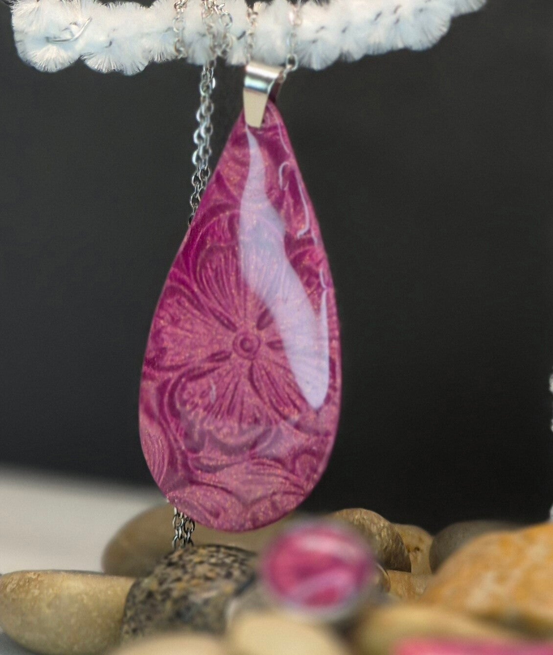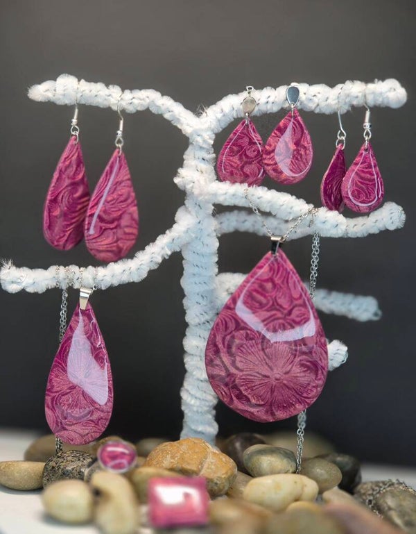 Colgante de la colección OTOÑO, hecho de forma artesana con arcilla polimérica metalizada en color guinda.