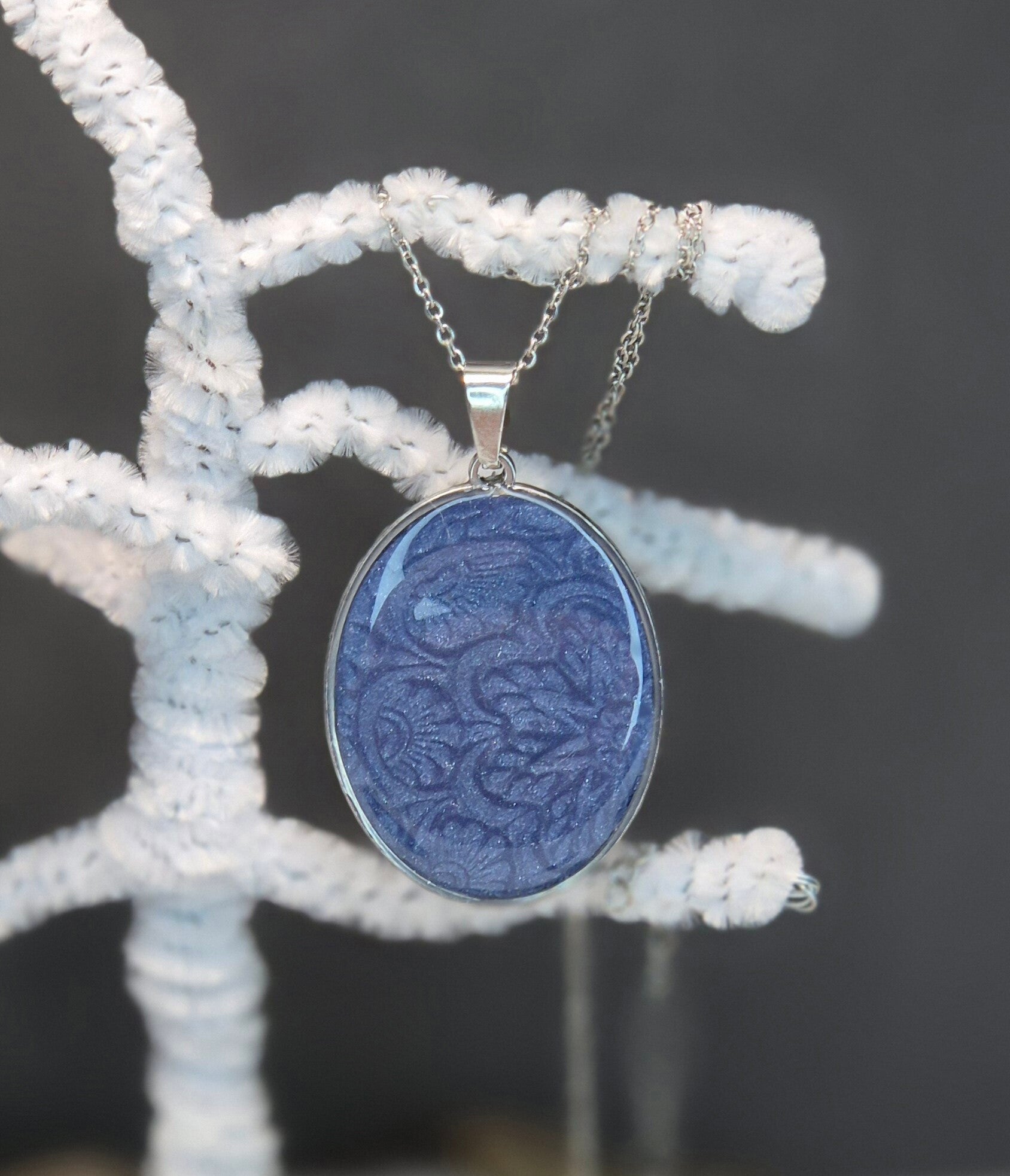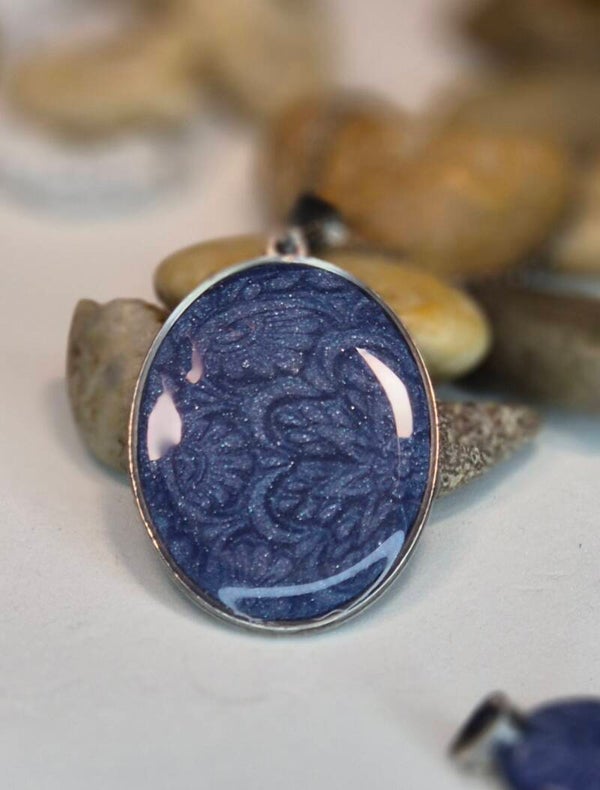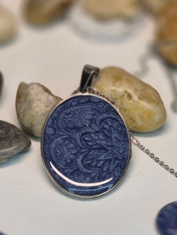 Colgante de la colección OTOÑO, hecho de forma artesana con arcilla polimérica metalizada en color azul.