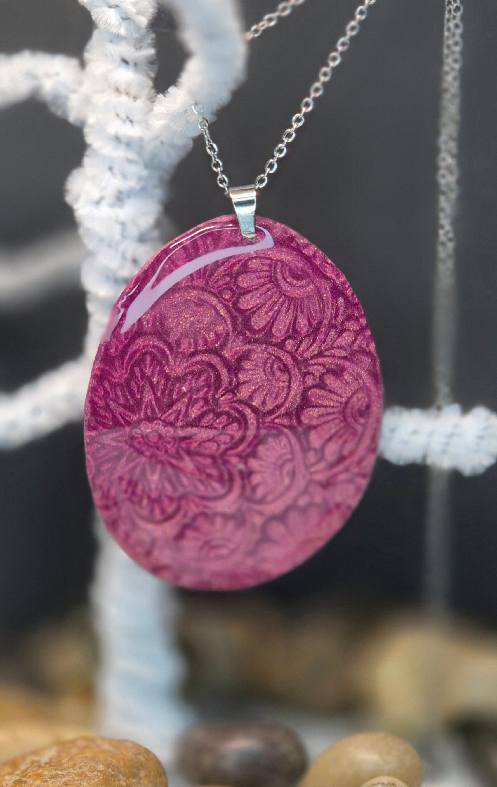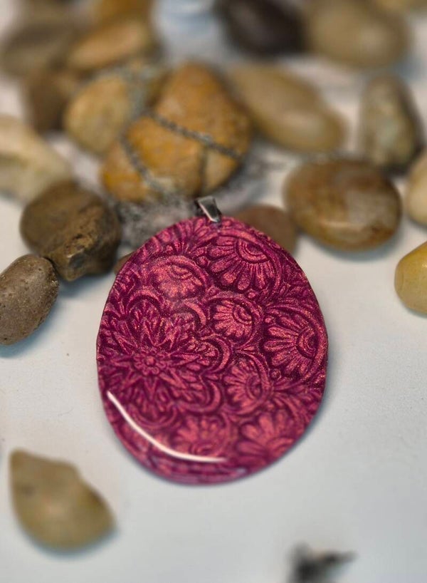 Colgante de la colección OTOÑO, hecho de forma artesana con arcilla polimérica metalizada en color esmeralda.