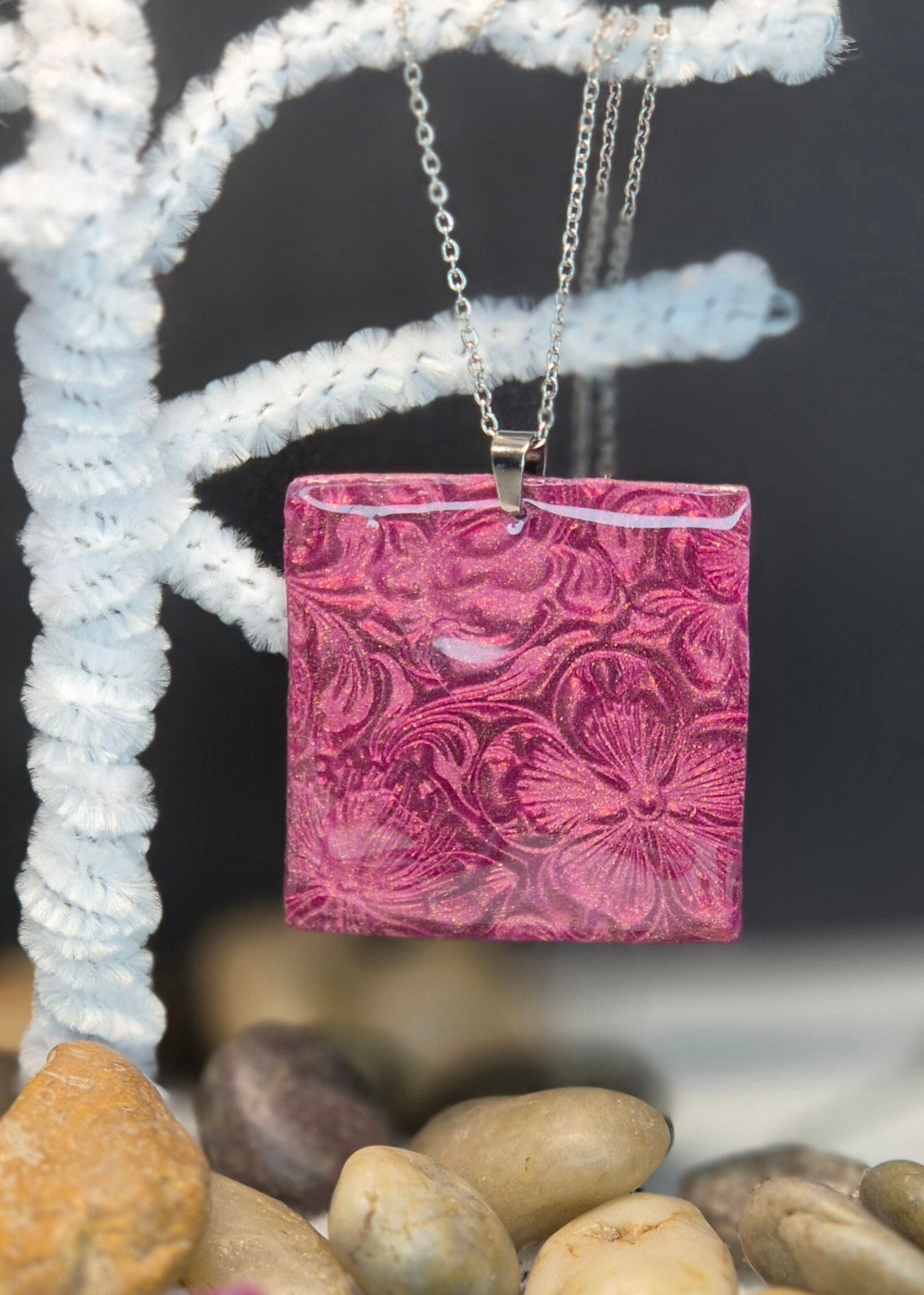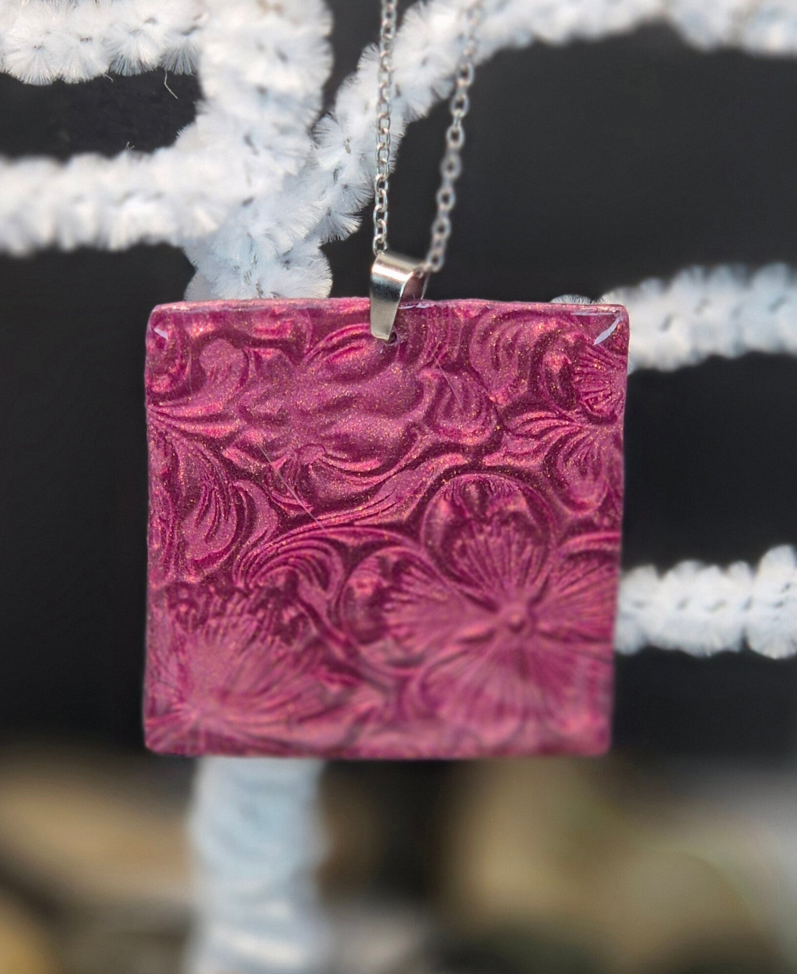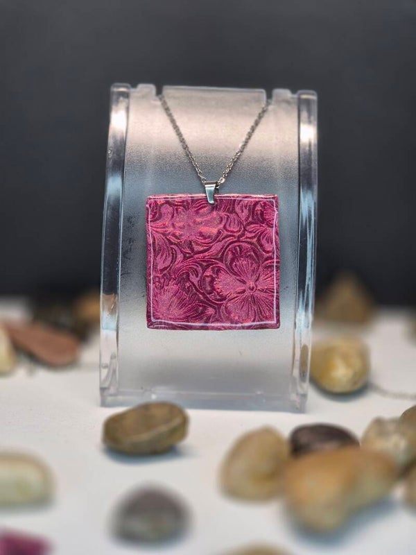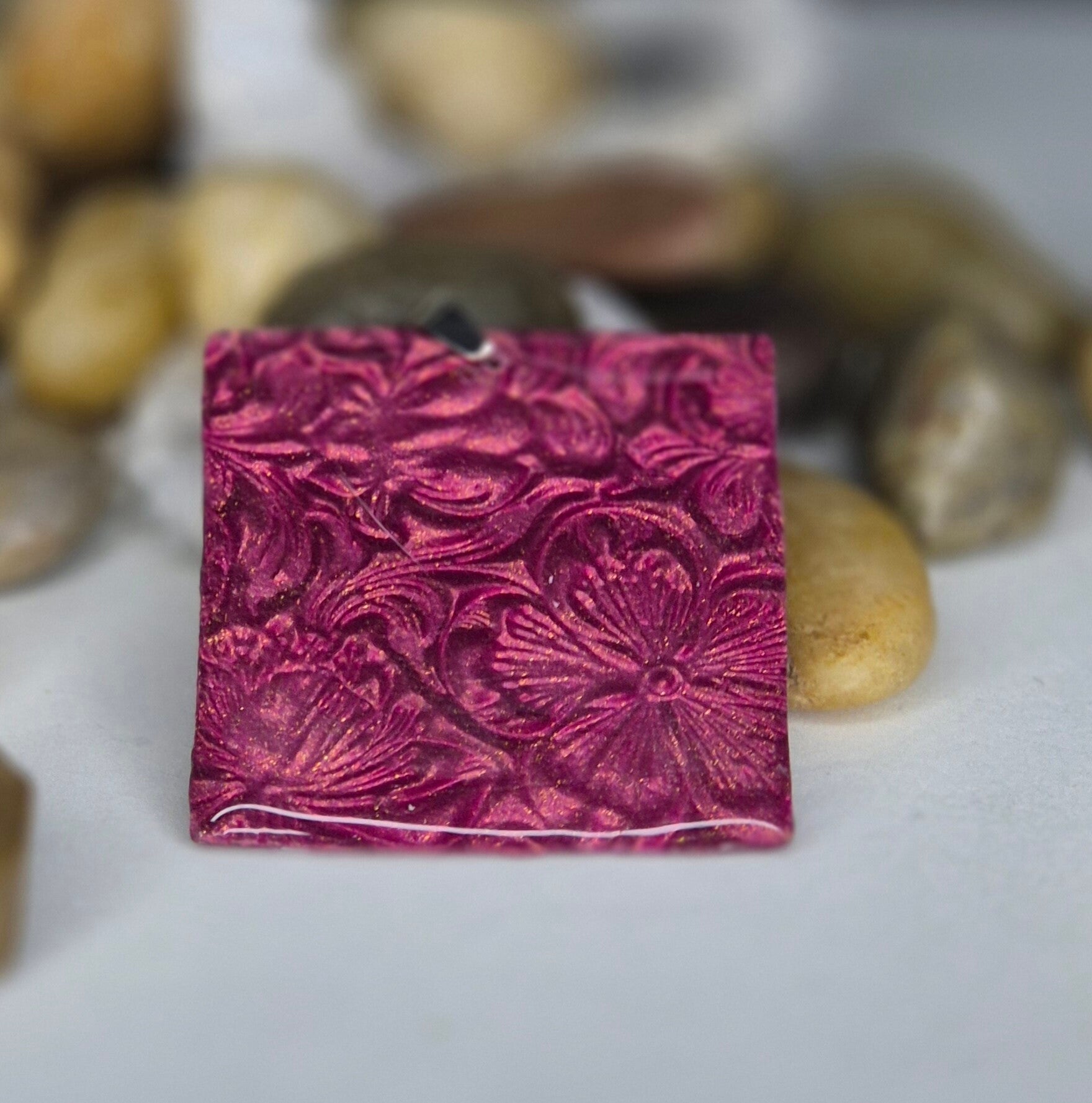 Colgante de la colección OTOÑO, hecho de forma artesana con arcilla polimérica metalizada en color esmeralda.