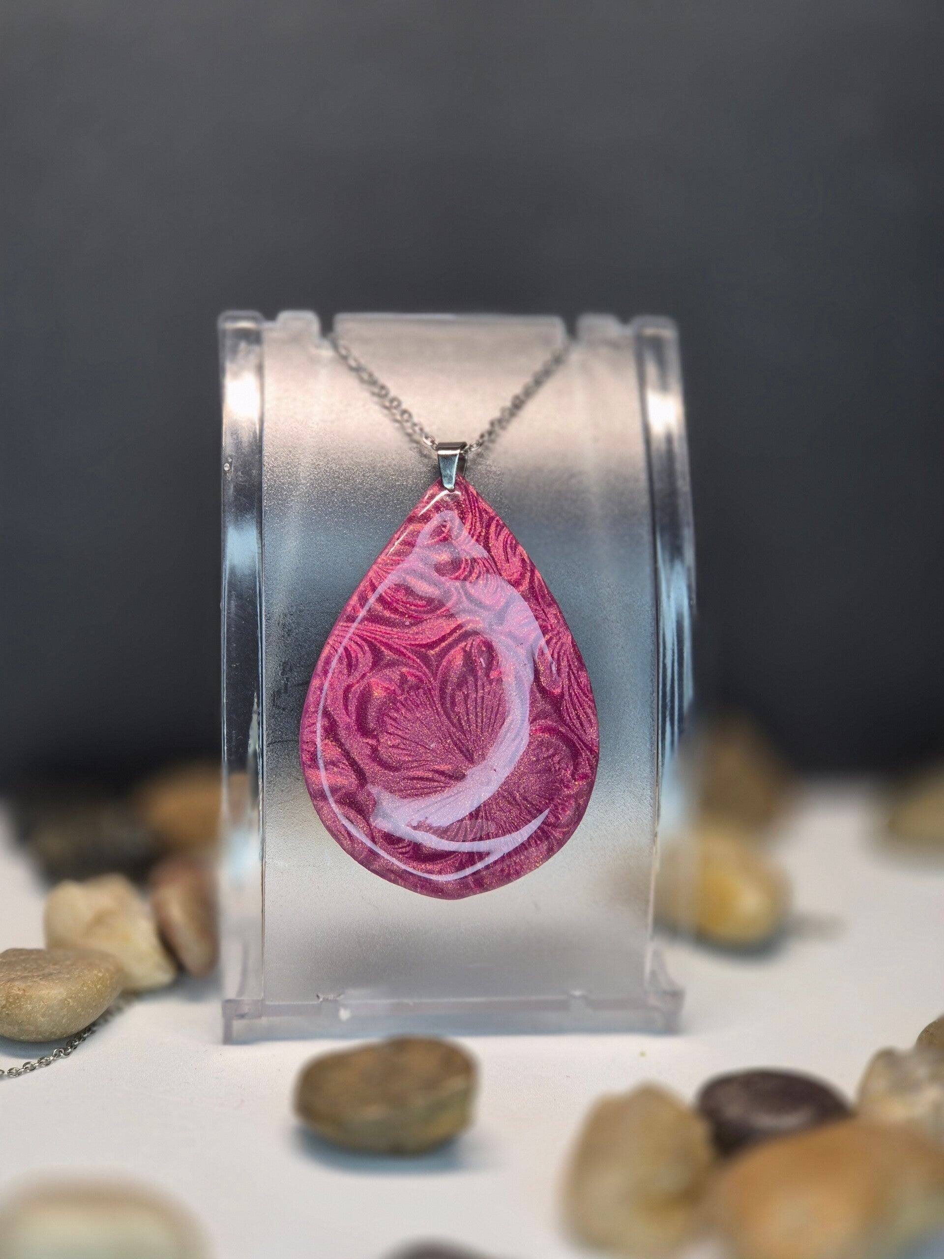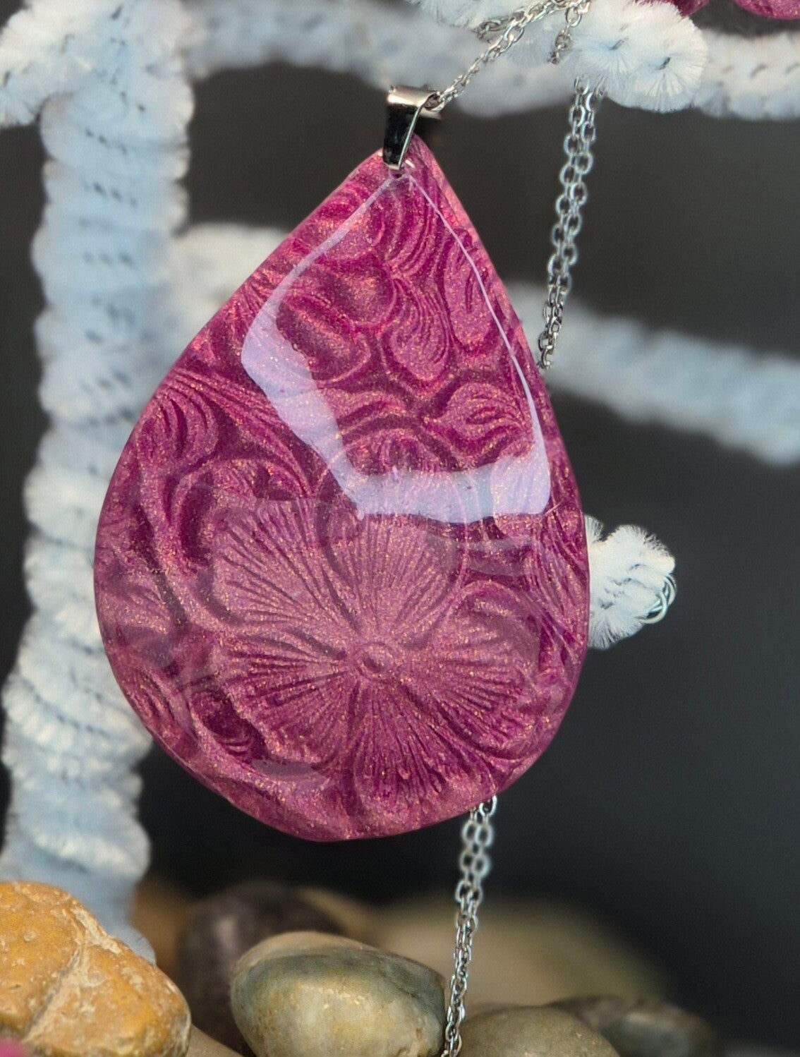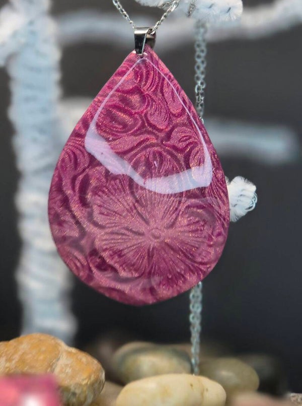 Colgante de la colección OTOÑO, hecho de forma artesana con arcilla polimérica metalizada en color pizarra..