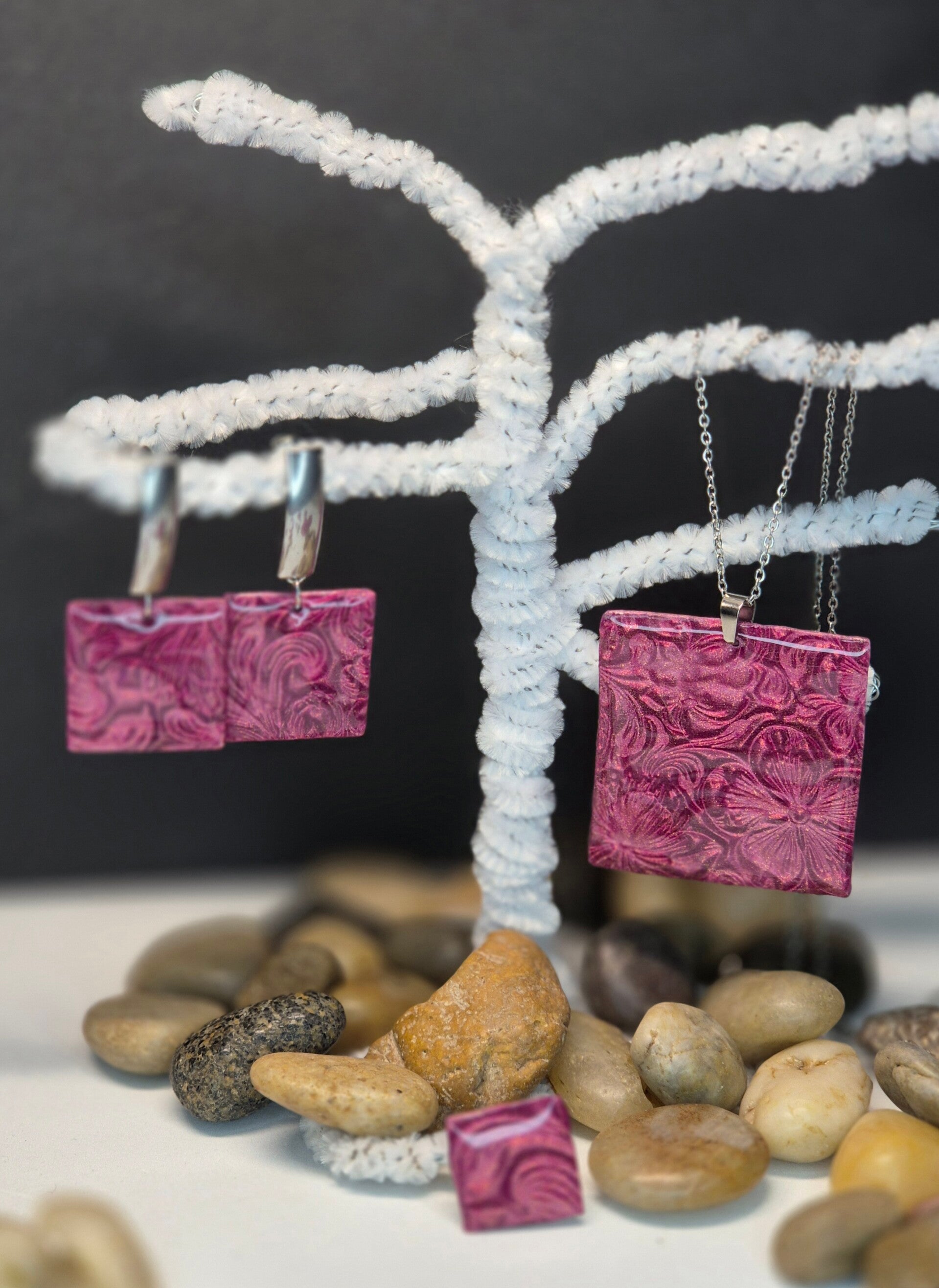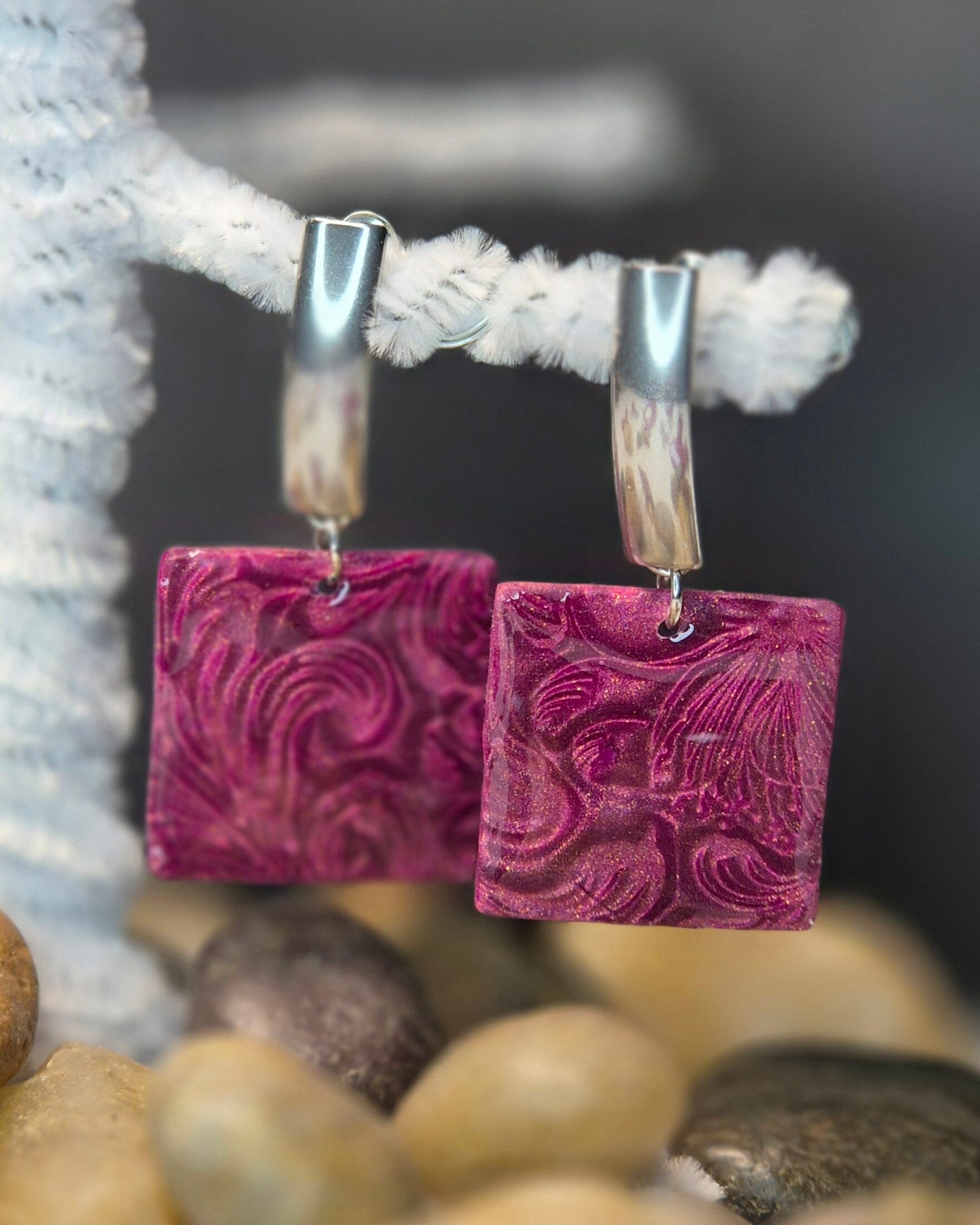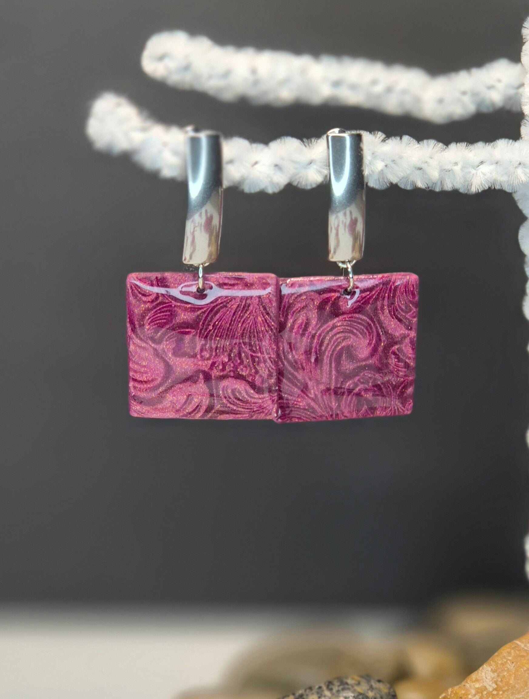 Pendientes de la colección OTOÑO, hechos de forma artesana con arcilla polimérica metalizada en color guinda.