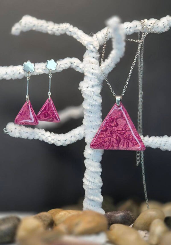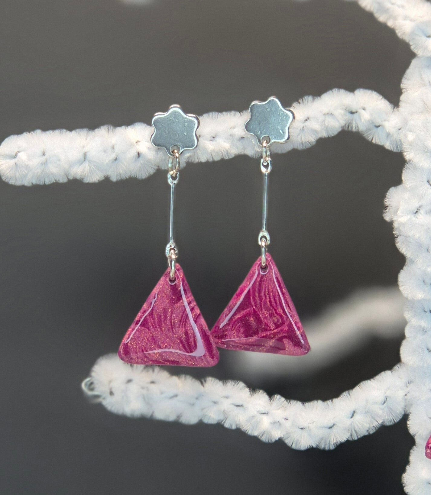 Pendientes de la colección OTOÑO, hechos de forma artesana con arcilla polimérica metalizada en color guinda.