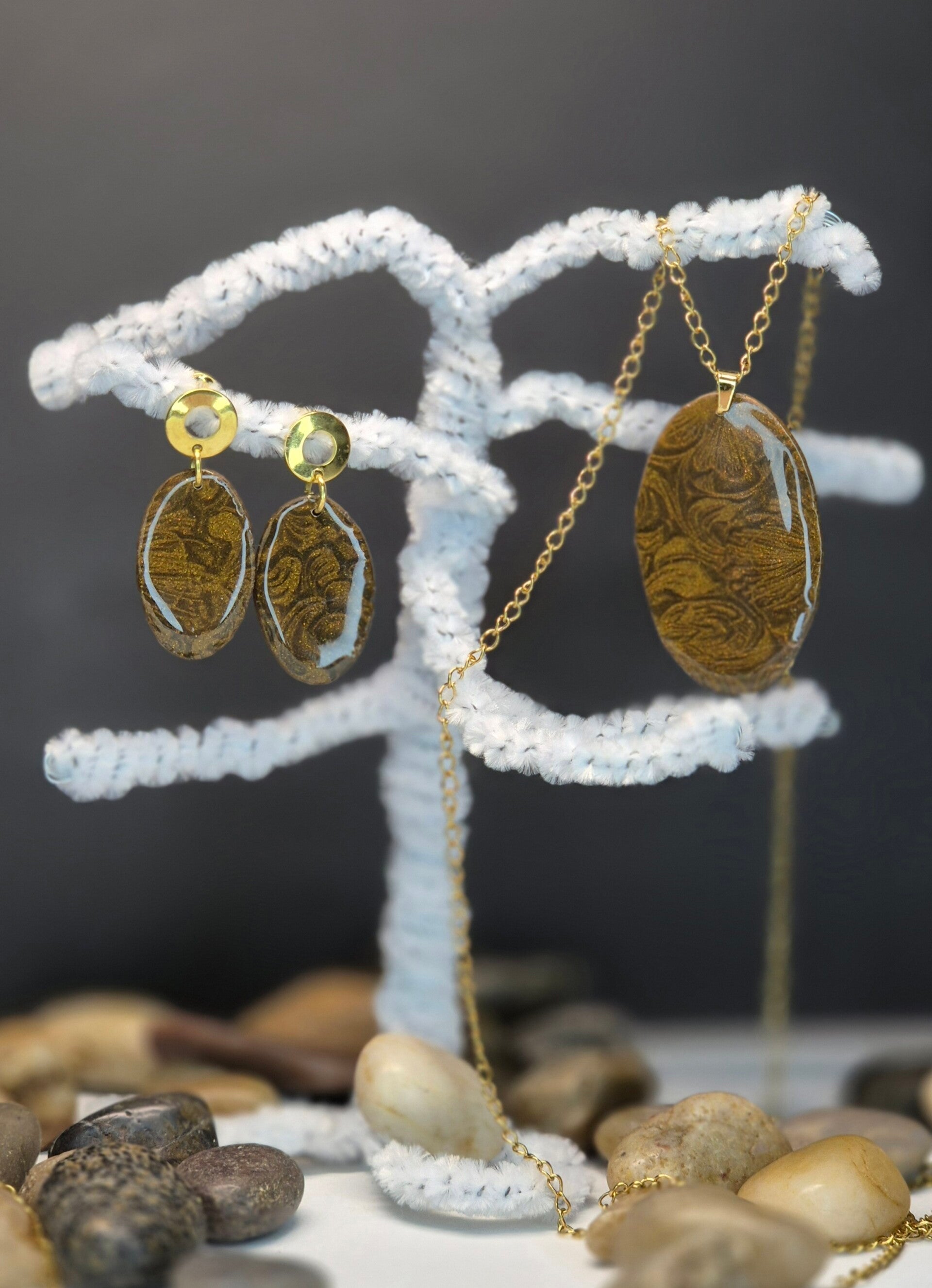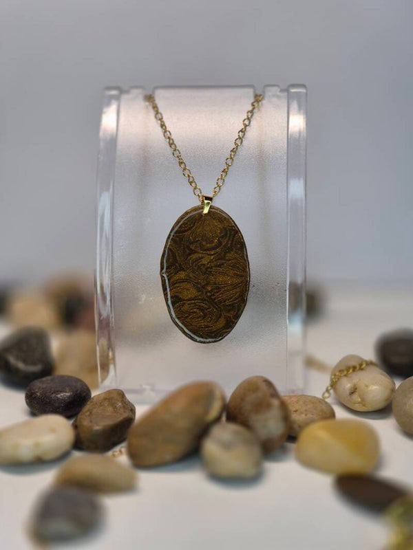 Colgante de la colección OTOÑO, hecho de forma artesana con arcilla polimérica metalizada en color marrón dorado.