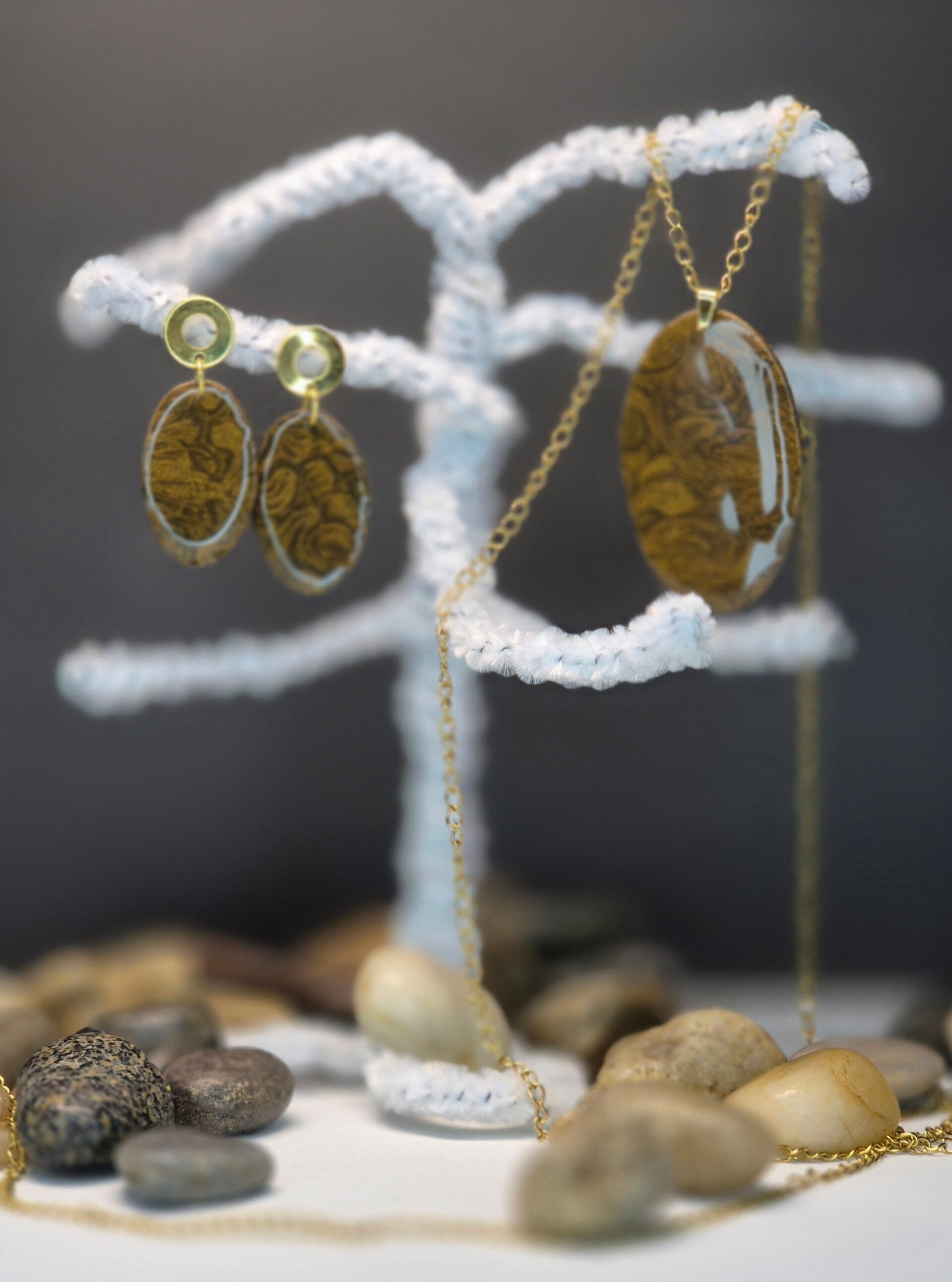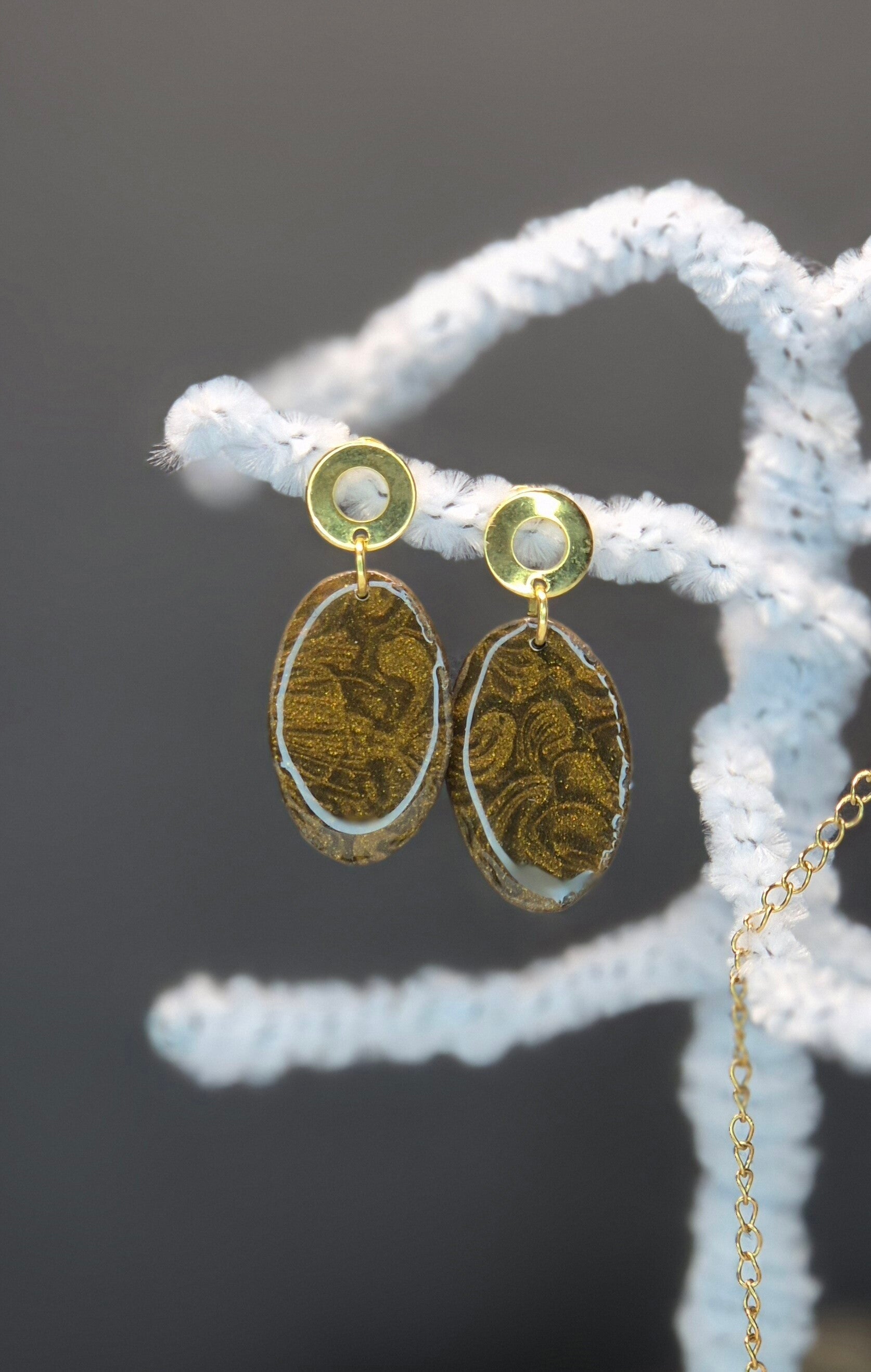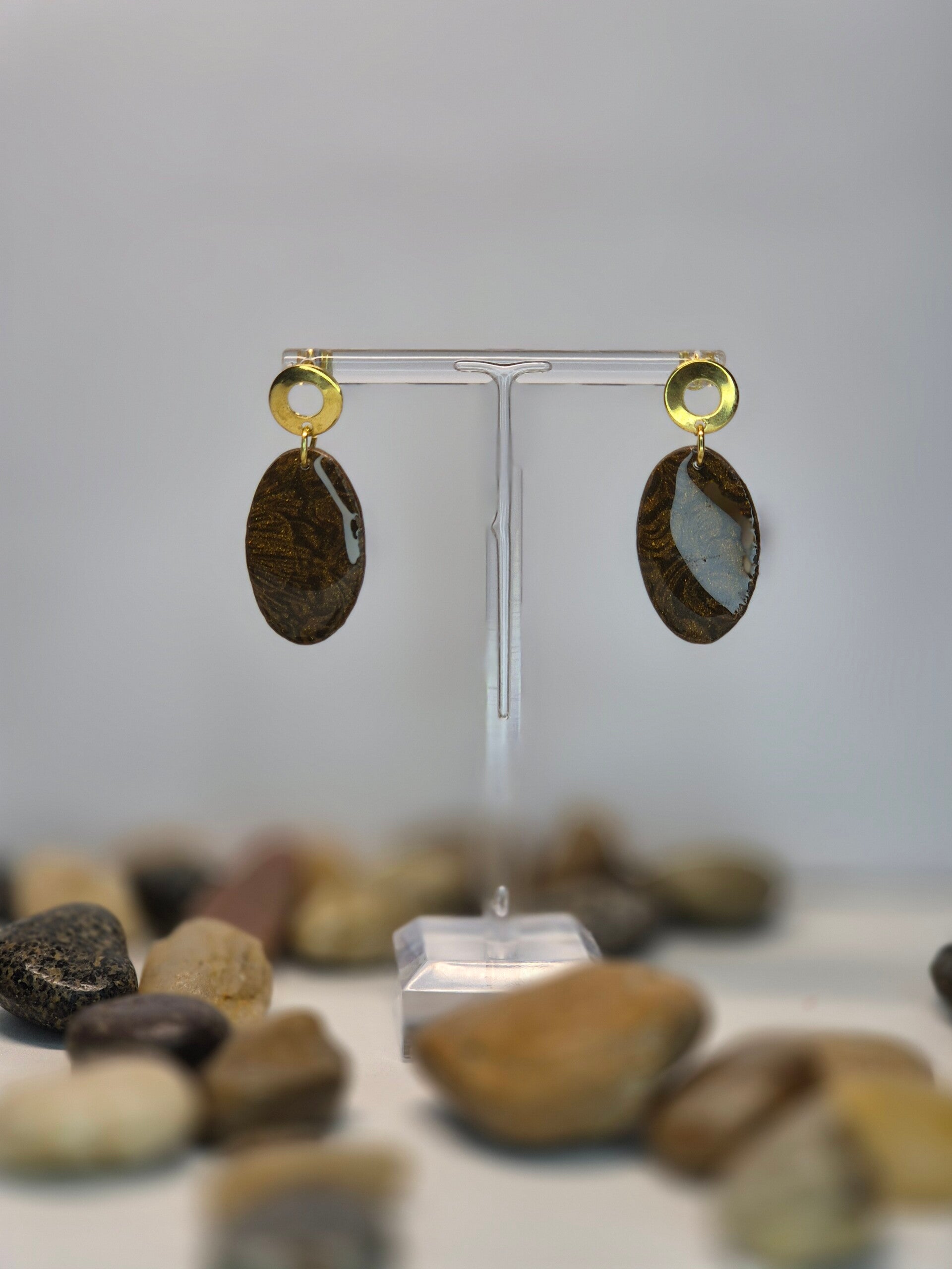 Pendientes de la colección OTOÑO, hechos de forma artesana con arcilla polimérica metalizada en color en marrón dorado.