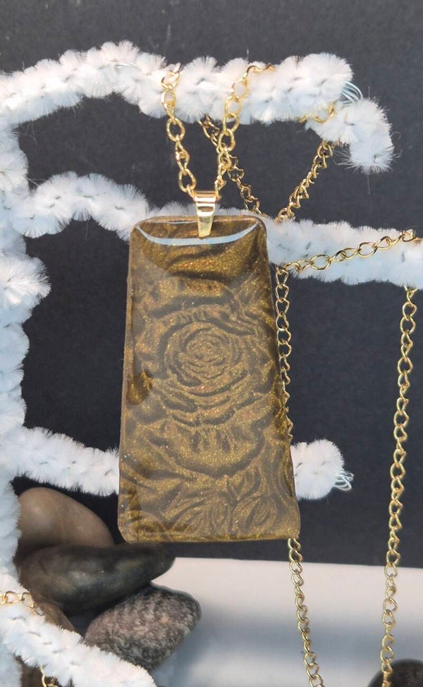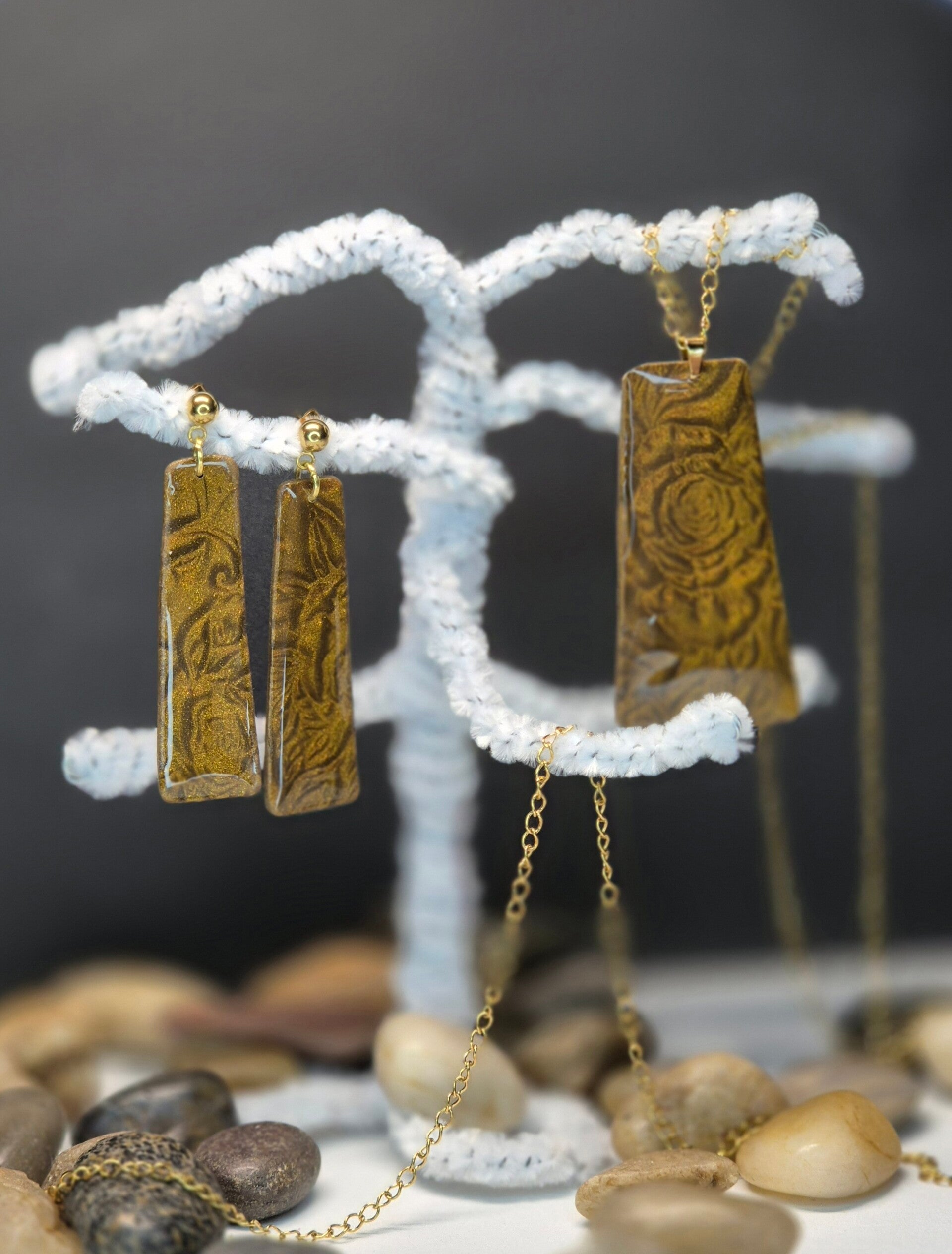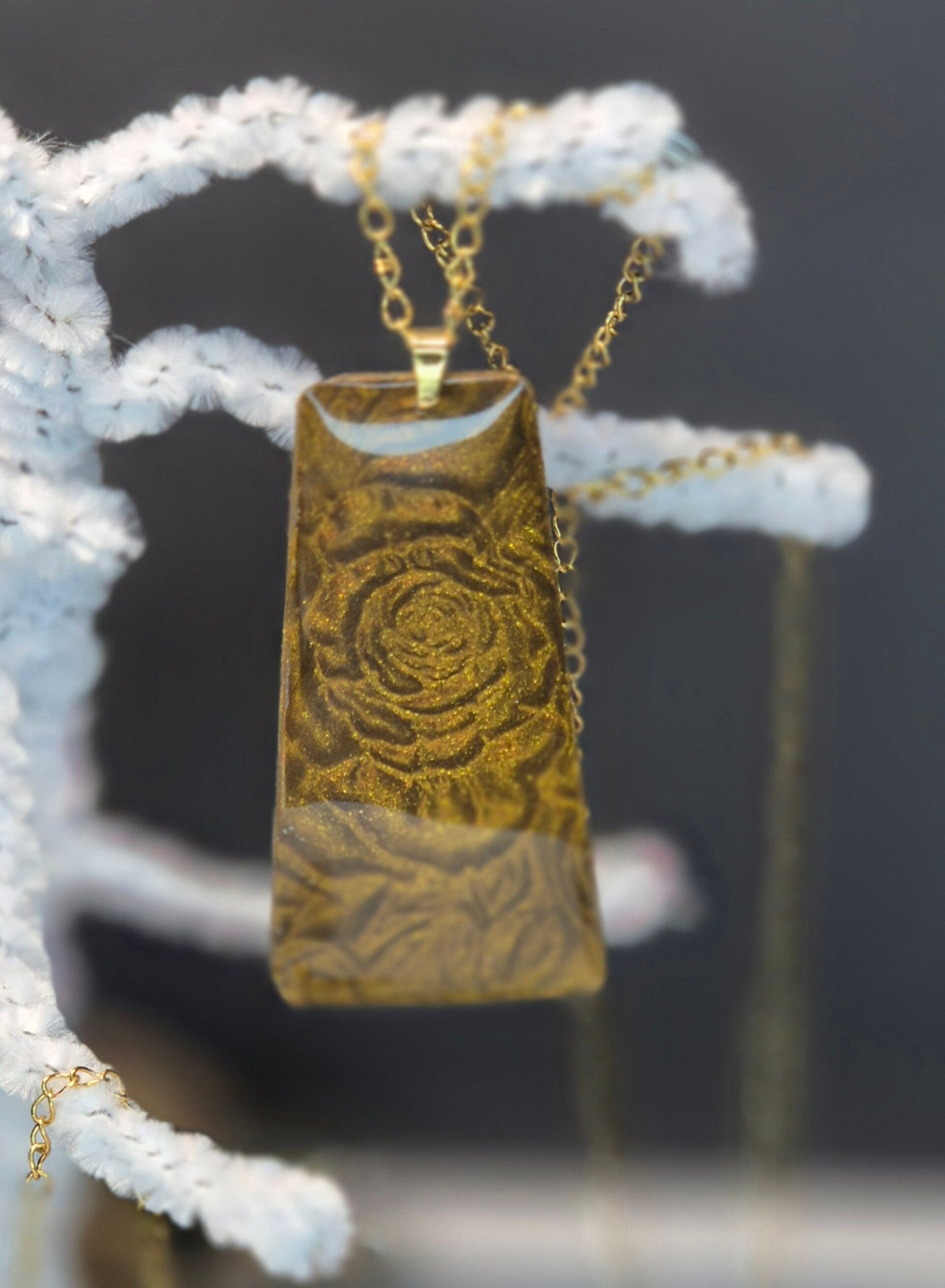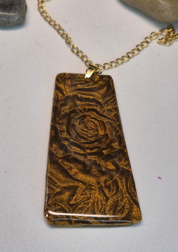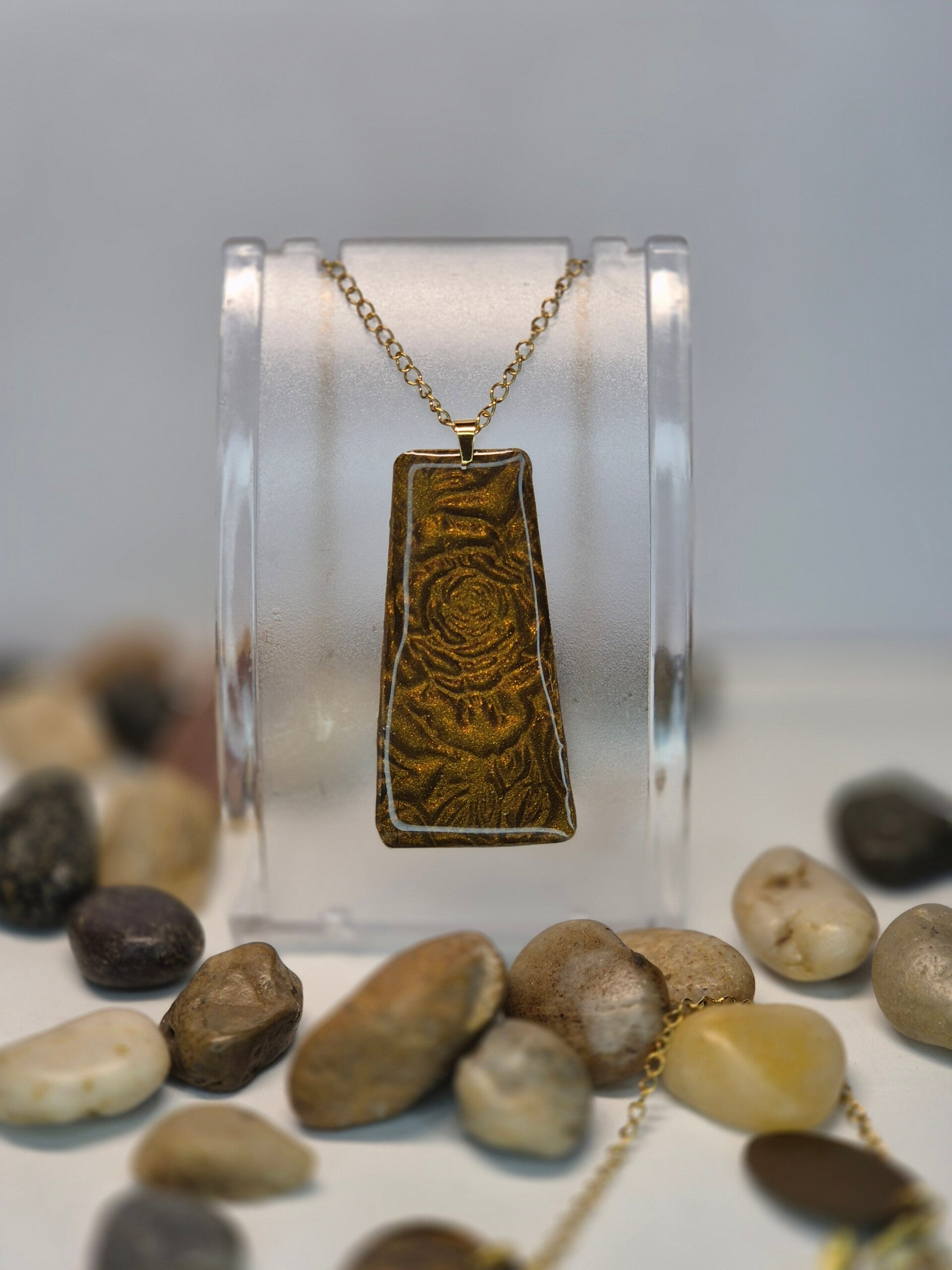 Colgante de la colección OTOÑO, hecho de forma artesana con arcilla polimérica metalizada en color en marrón dorado.