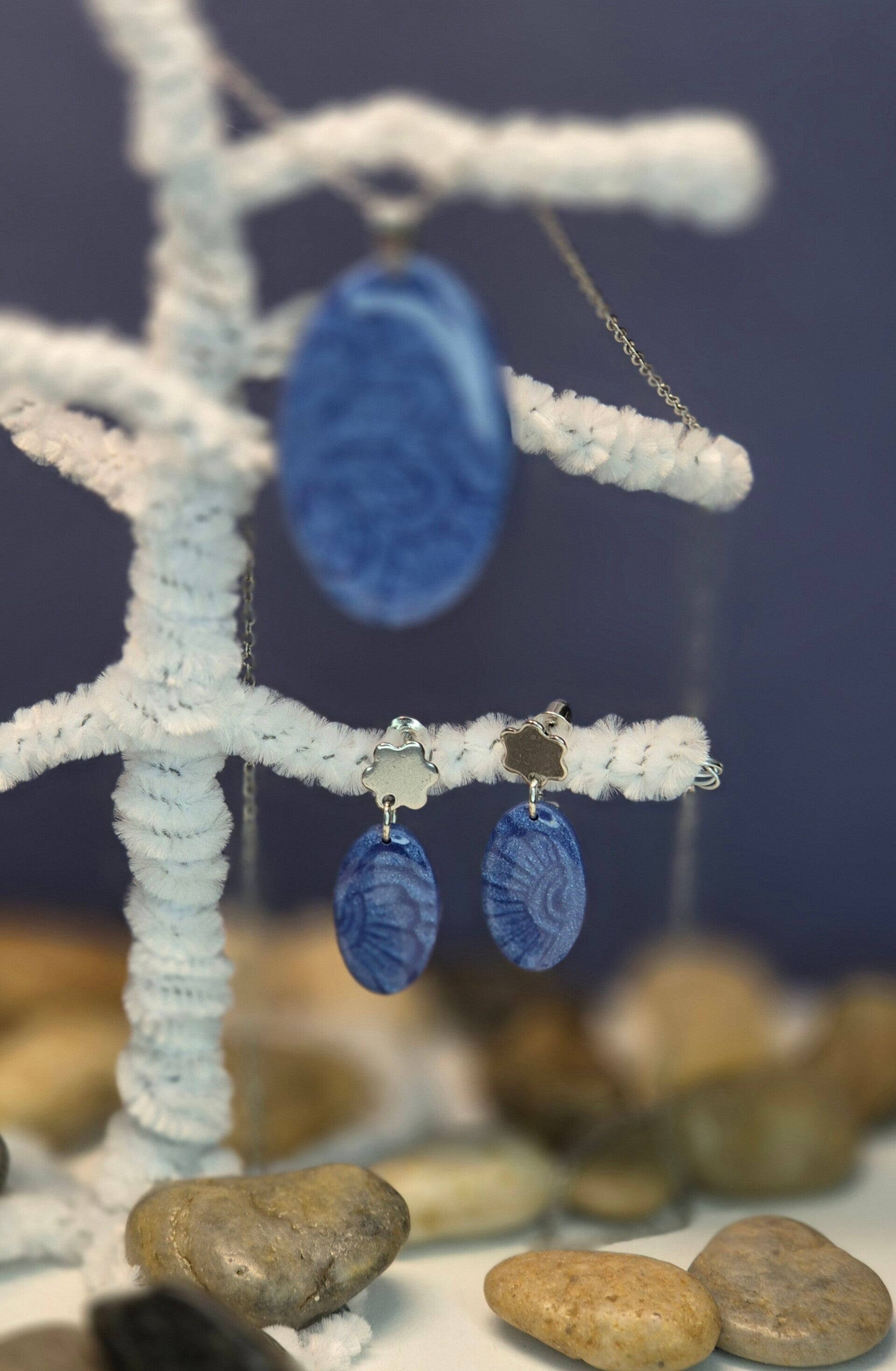 Pendientes de la colección OTOÑO, hechos de forma artesana con arcilla polimérica metalizada en color en azul.