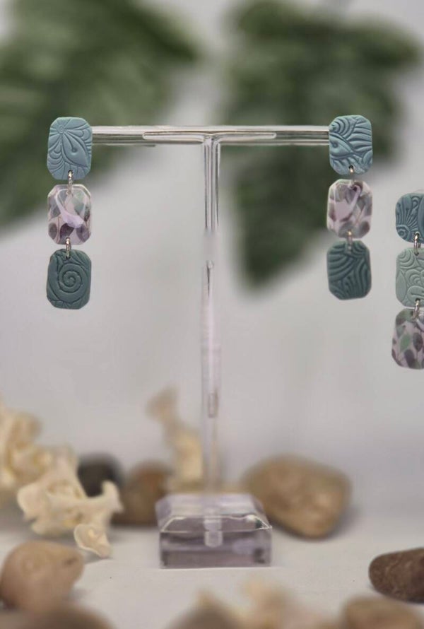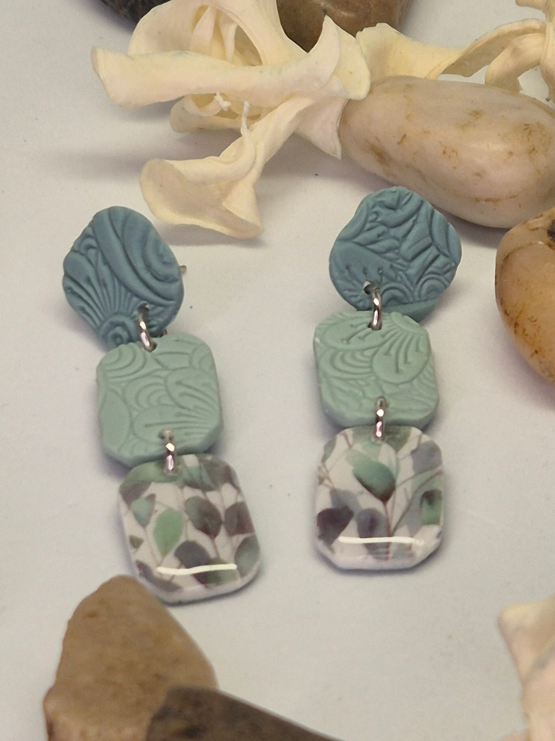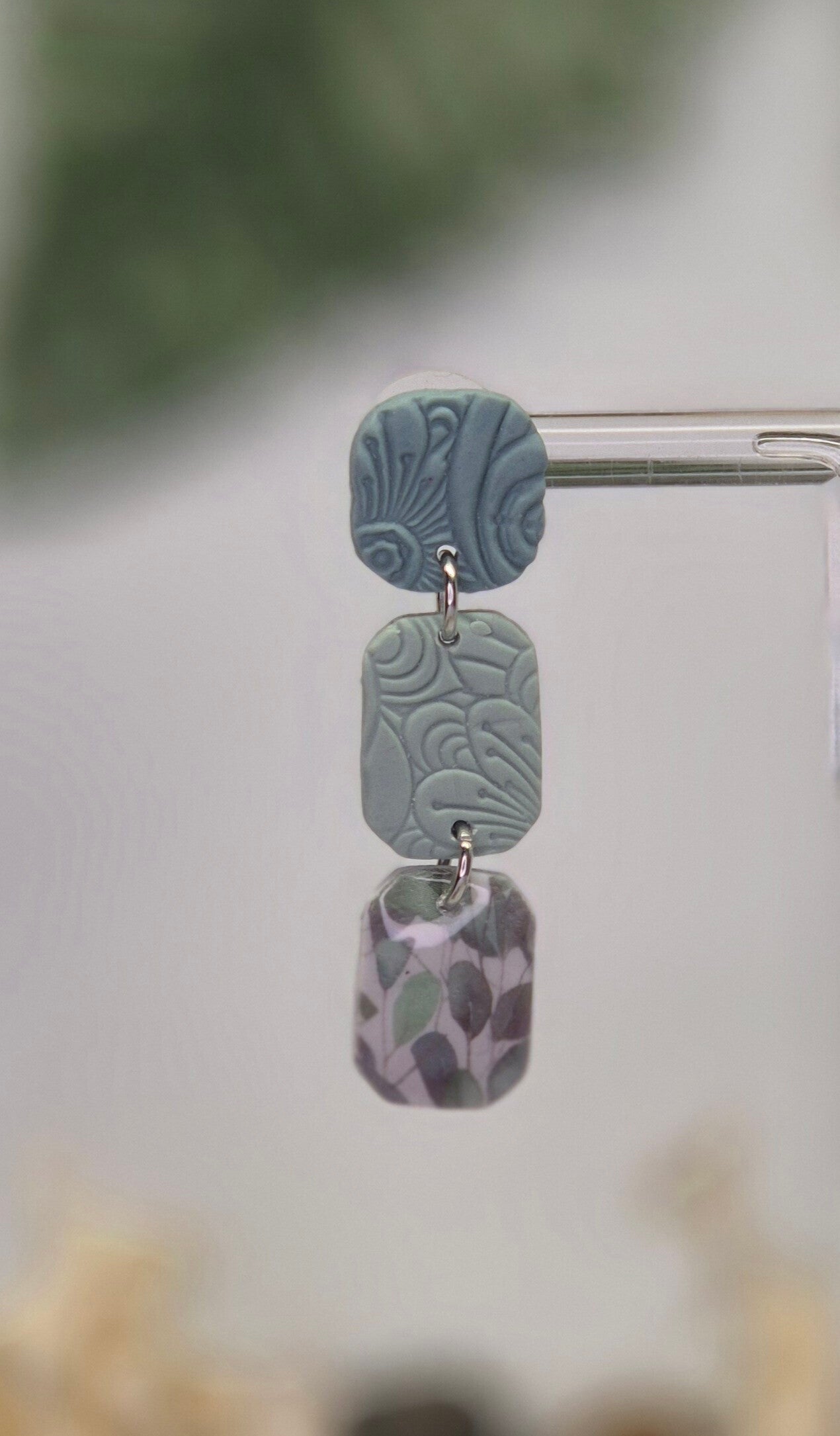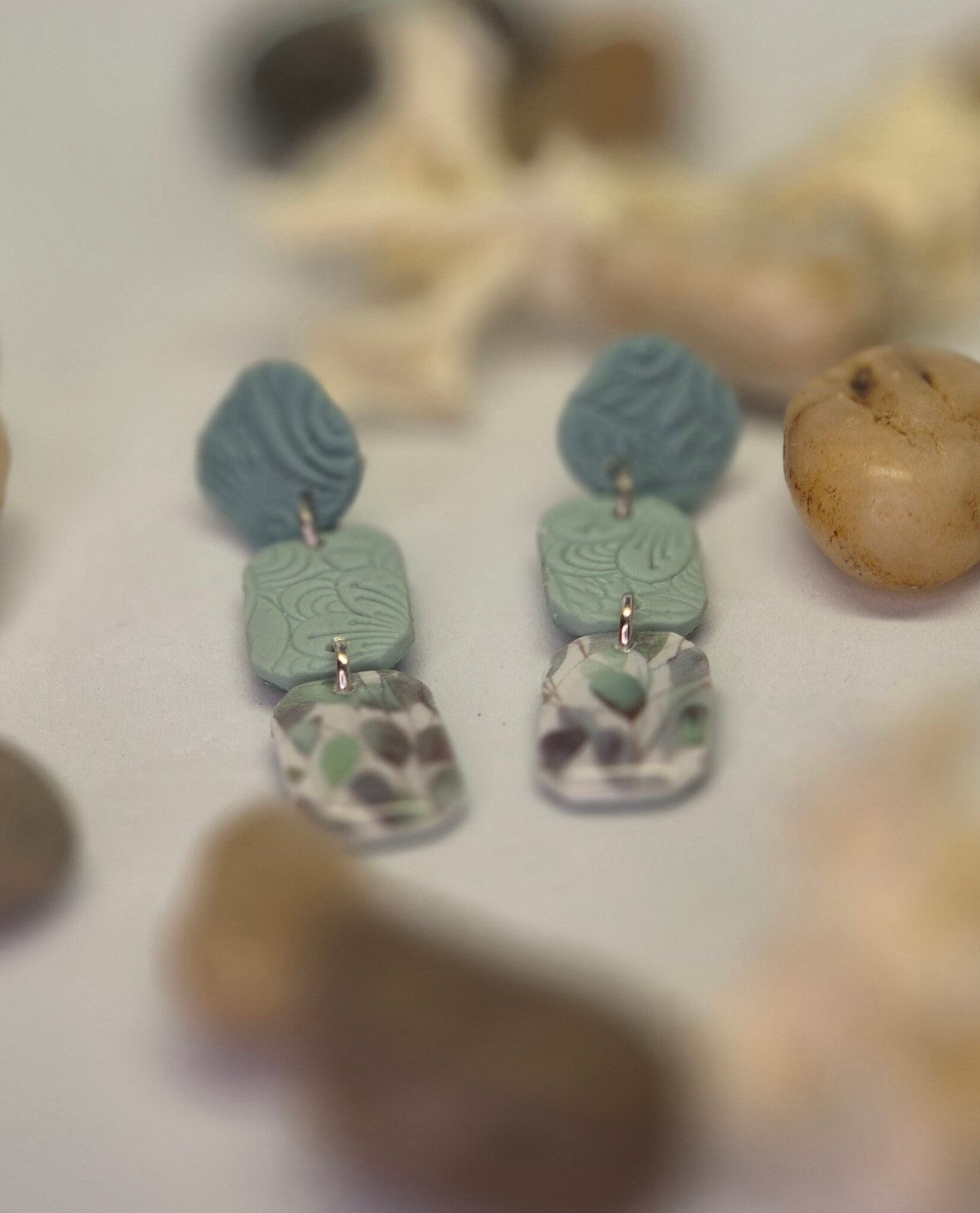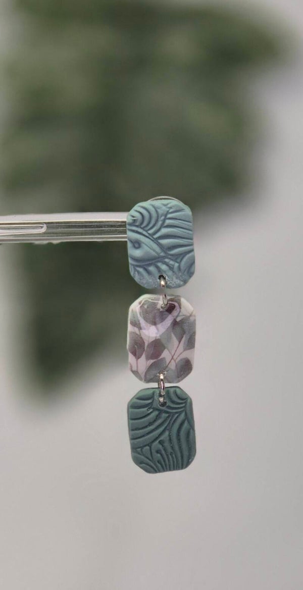 Pendientes de arcilla polimérica en tonos verdes combinados con estampado de hojasy distintas texturas.