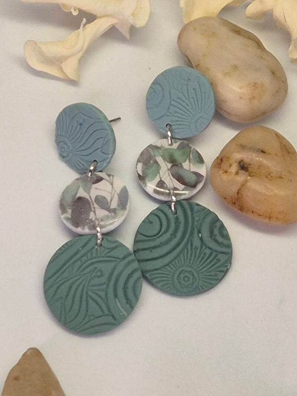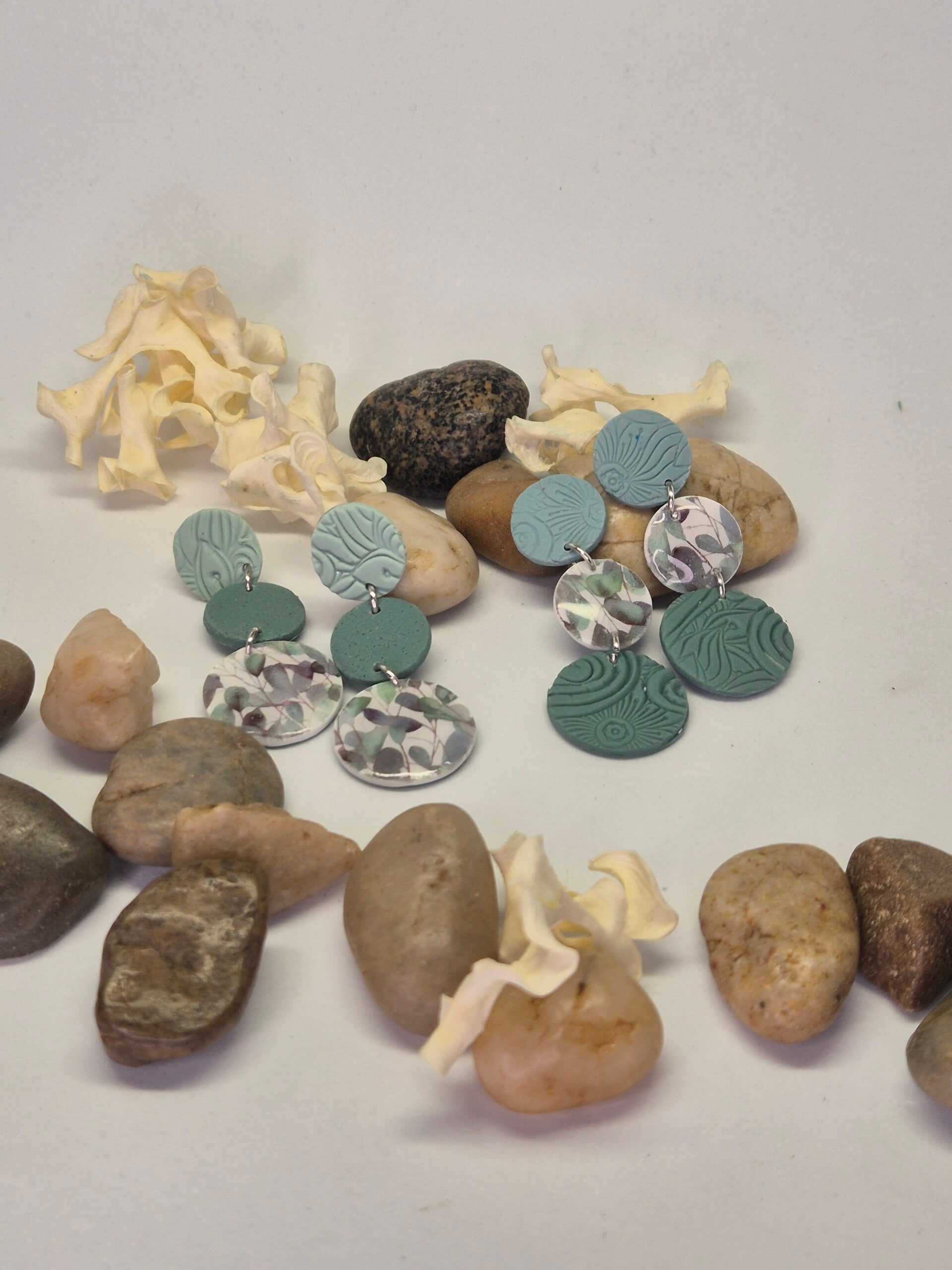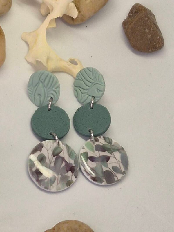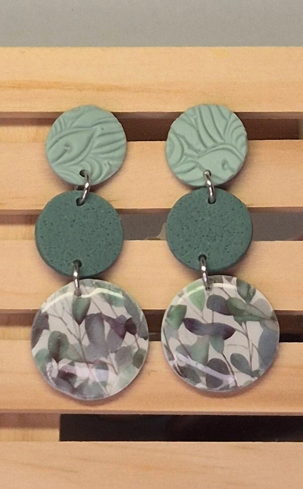 Pendientes de arcilla polimérica en tonos verdes combinados con estampado de hojasy distintas texturas.