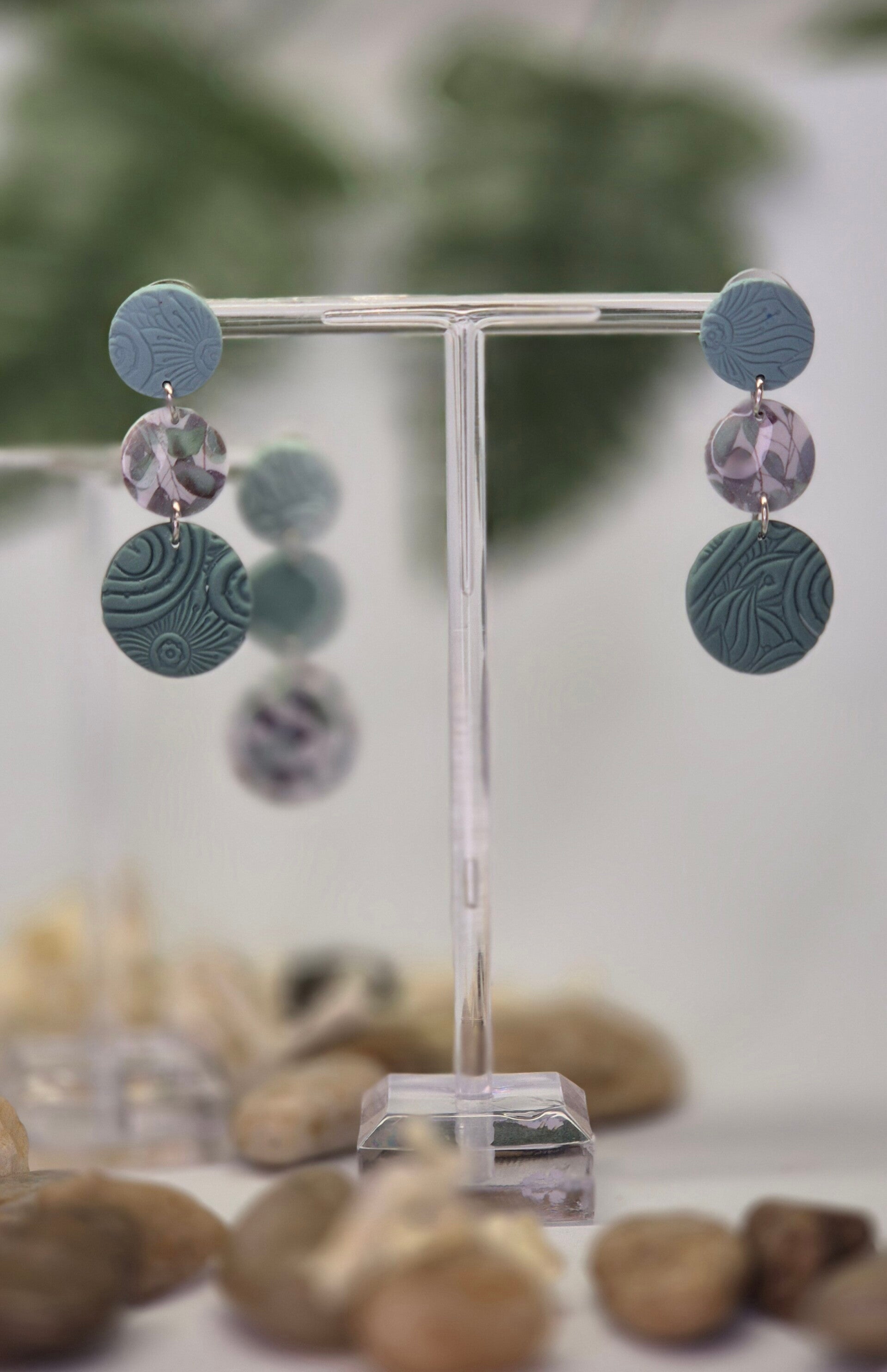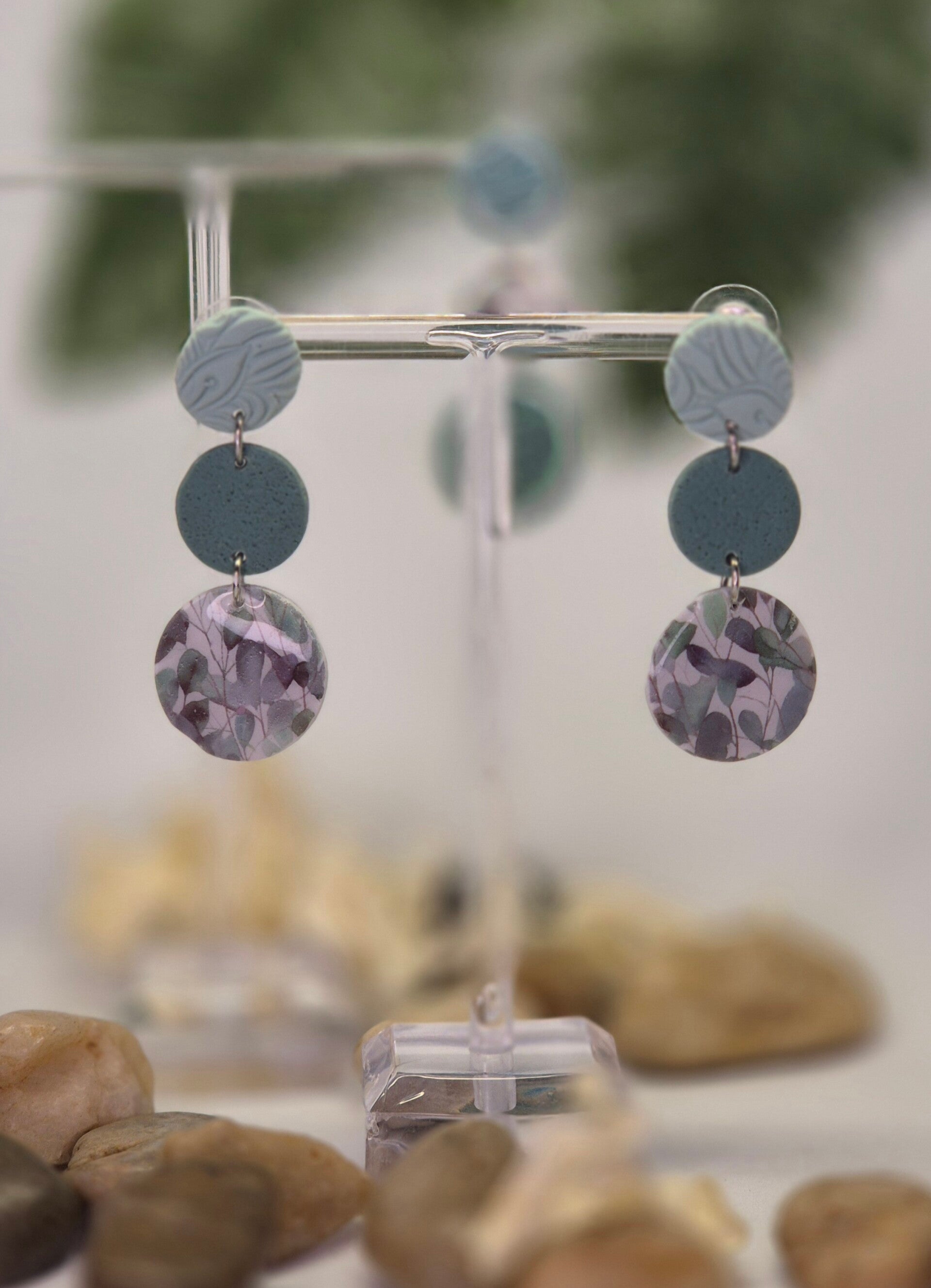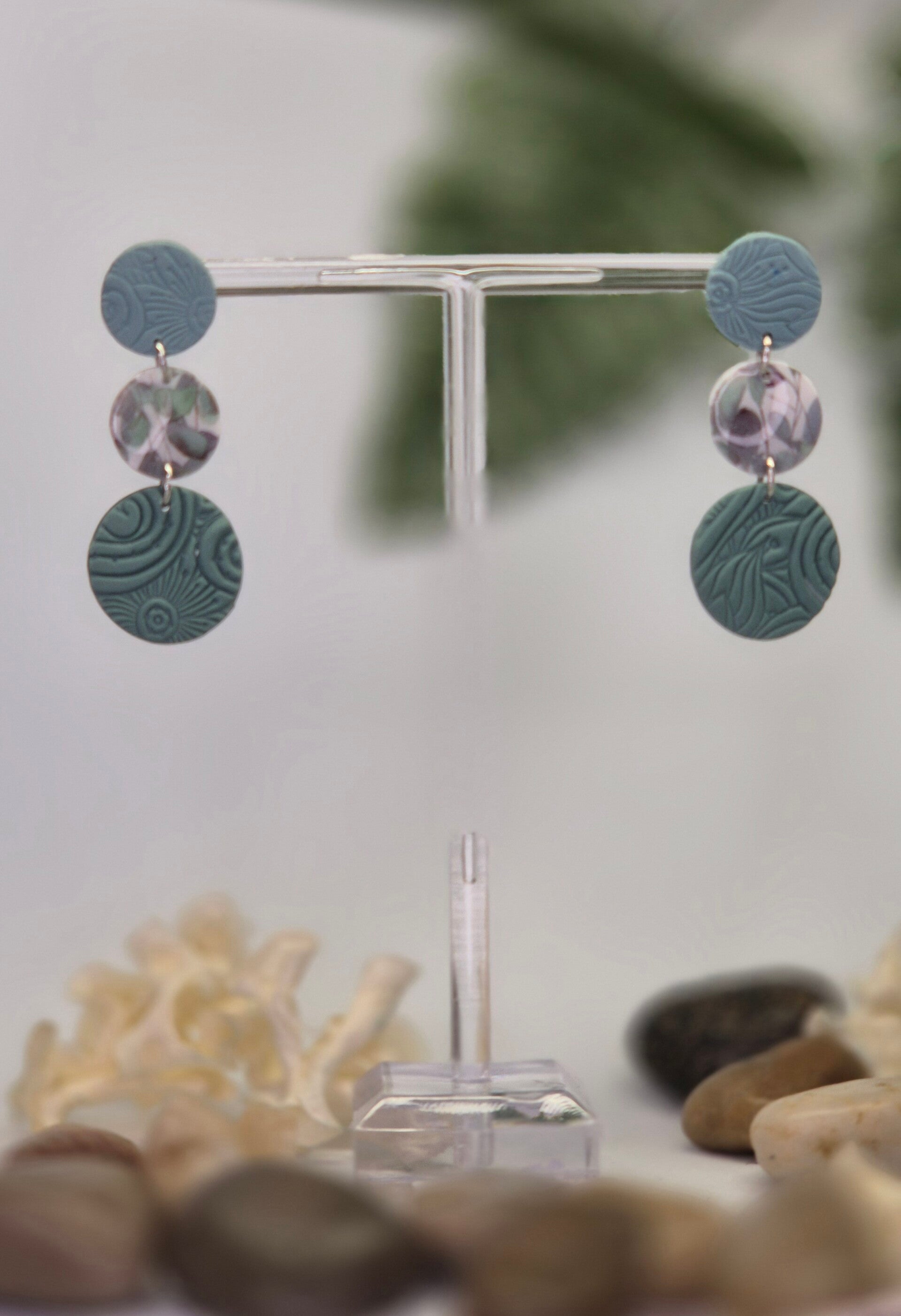 Pendientes de arcilla polimérica en tonos verdes combinados con estampado de hojasy distintas texturas.