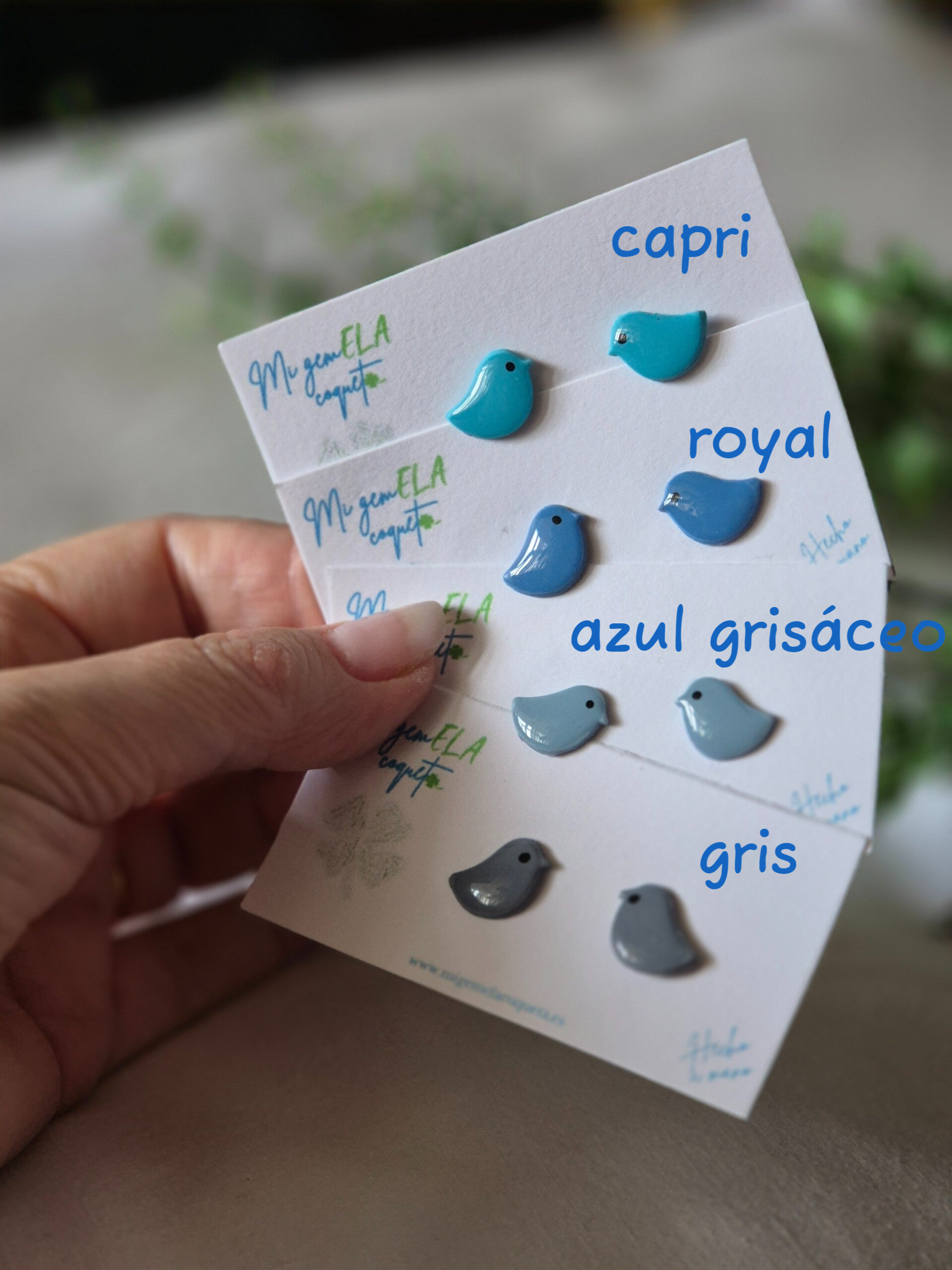 Nuestros Coquetas hechos de arcilla polimérica en forma de pájaro yen diferentes colores y tonos para que los puedas poner cada día en un color distinto o combinar con tu estilo.