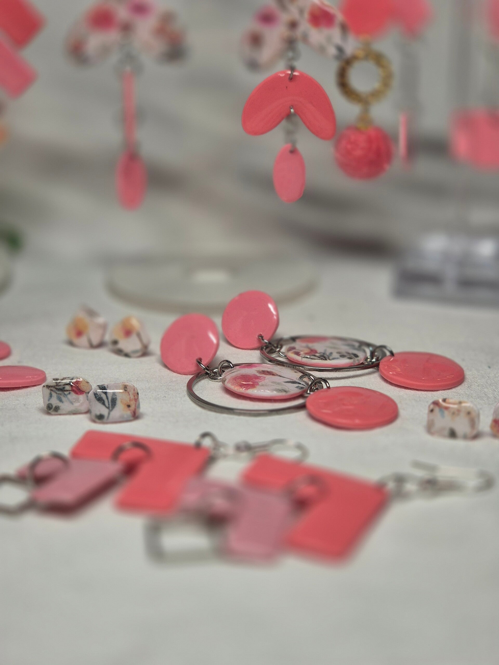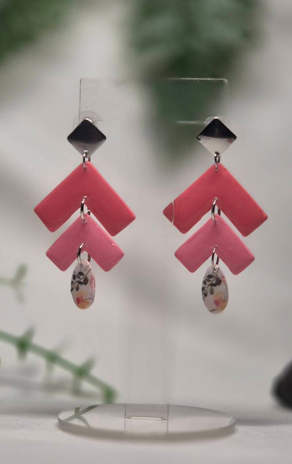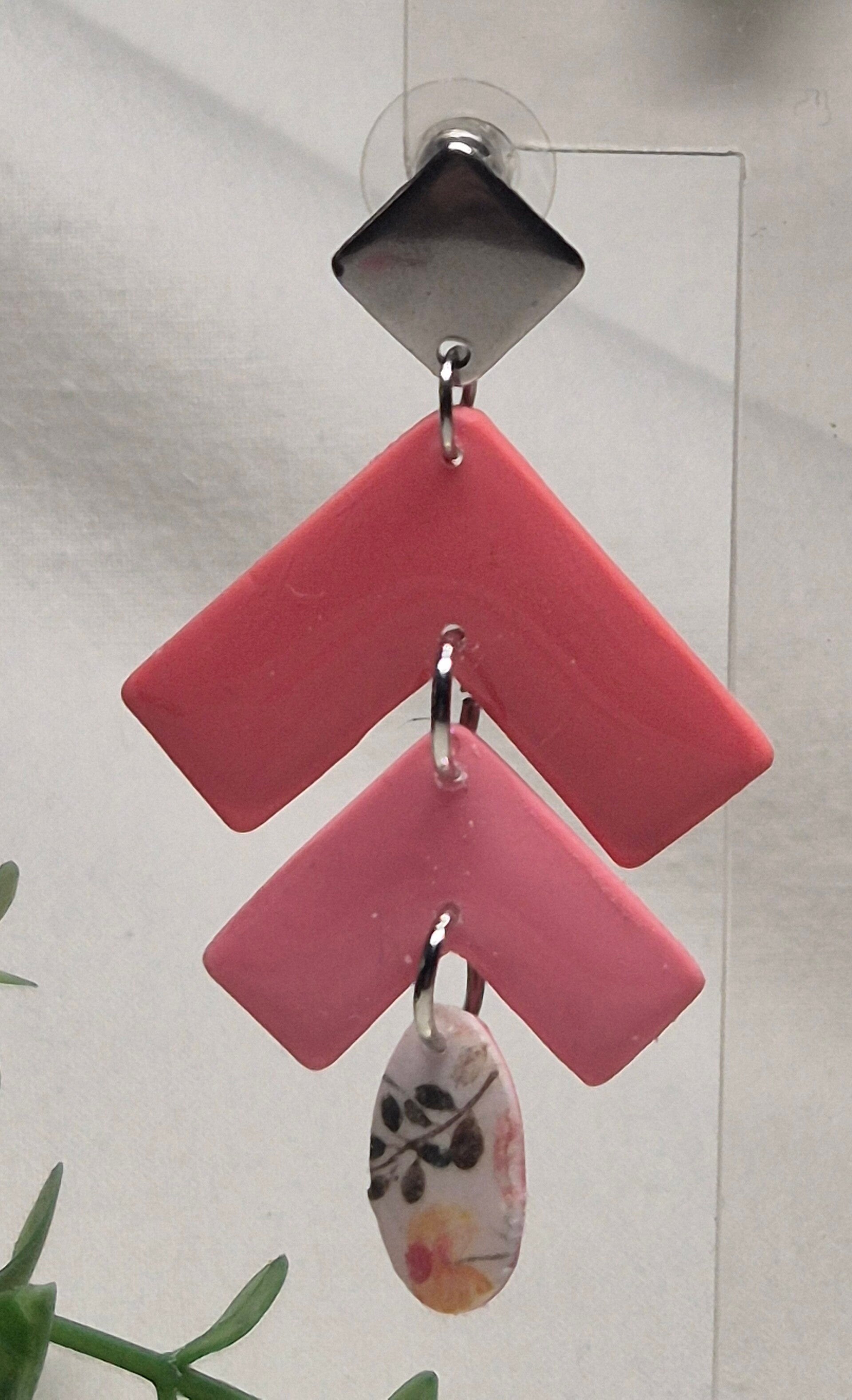 Pendientes de arcilla polimérica en tonos coral combinados con estampado de flores.