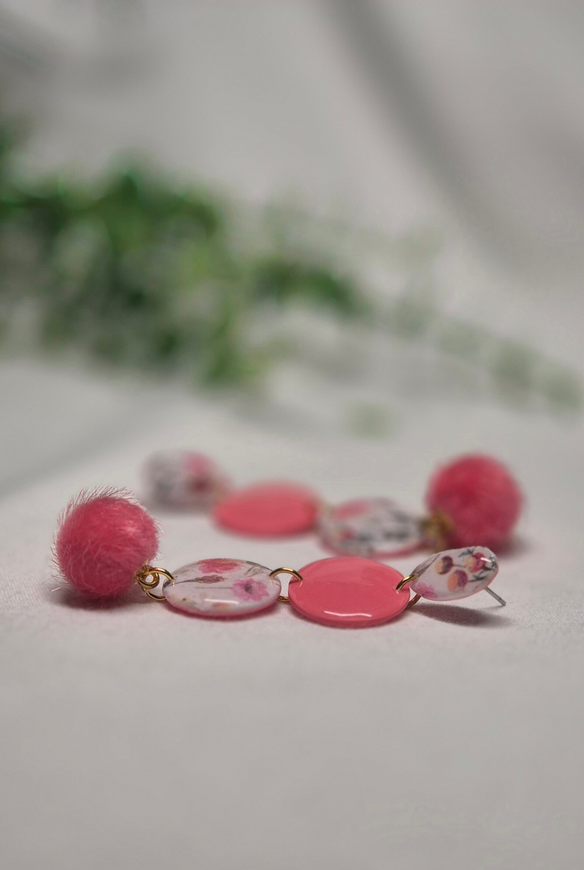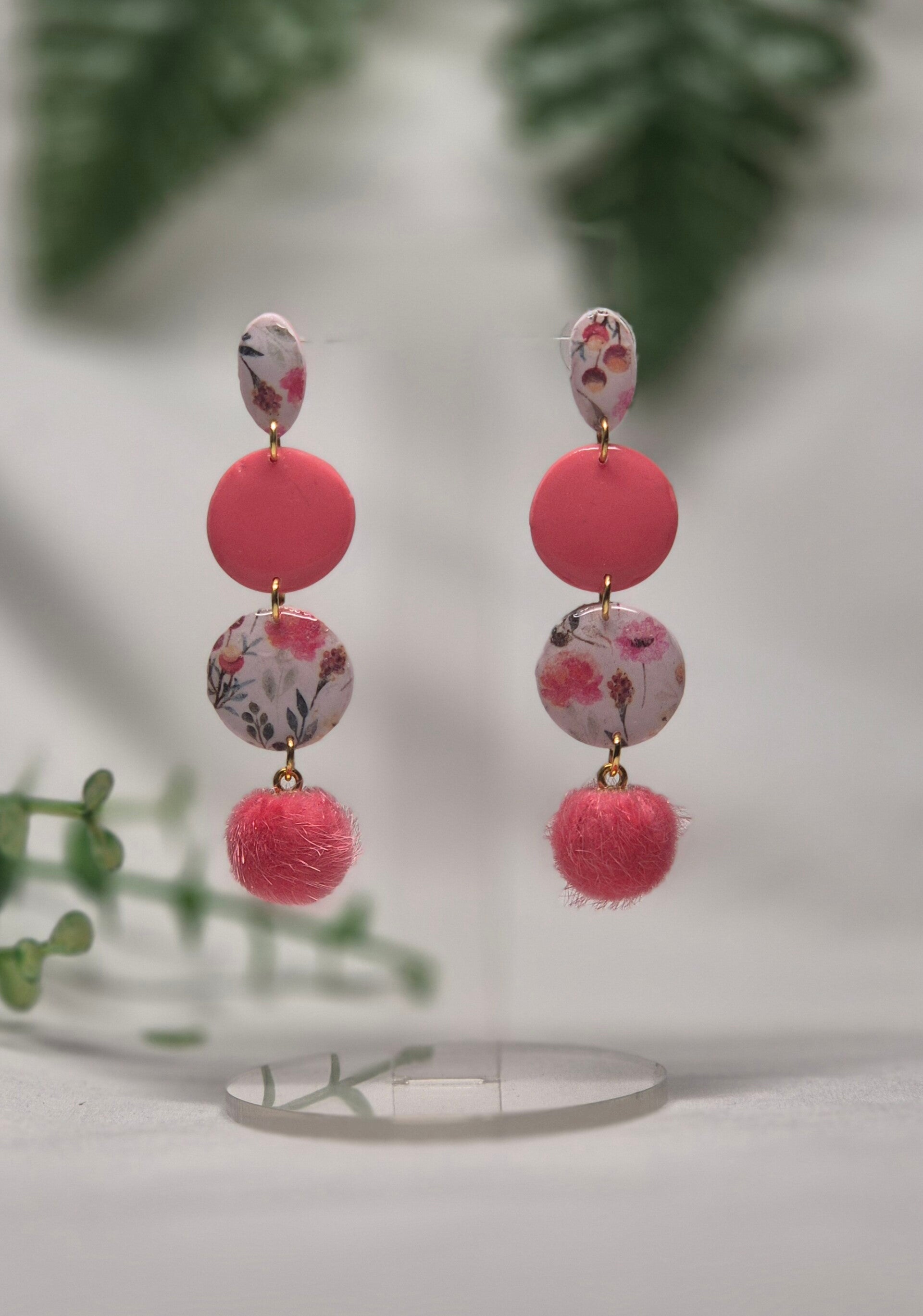 Pendientes de arcilla polimérica en tonos coral combinados con estampado de flores.